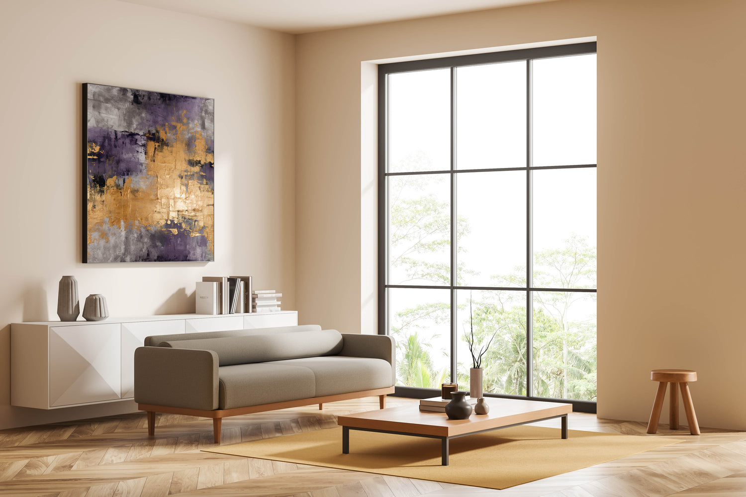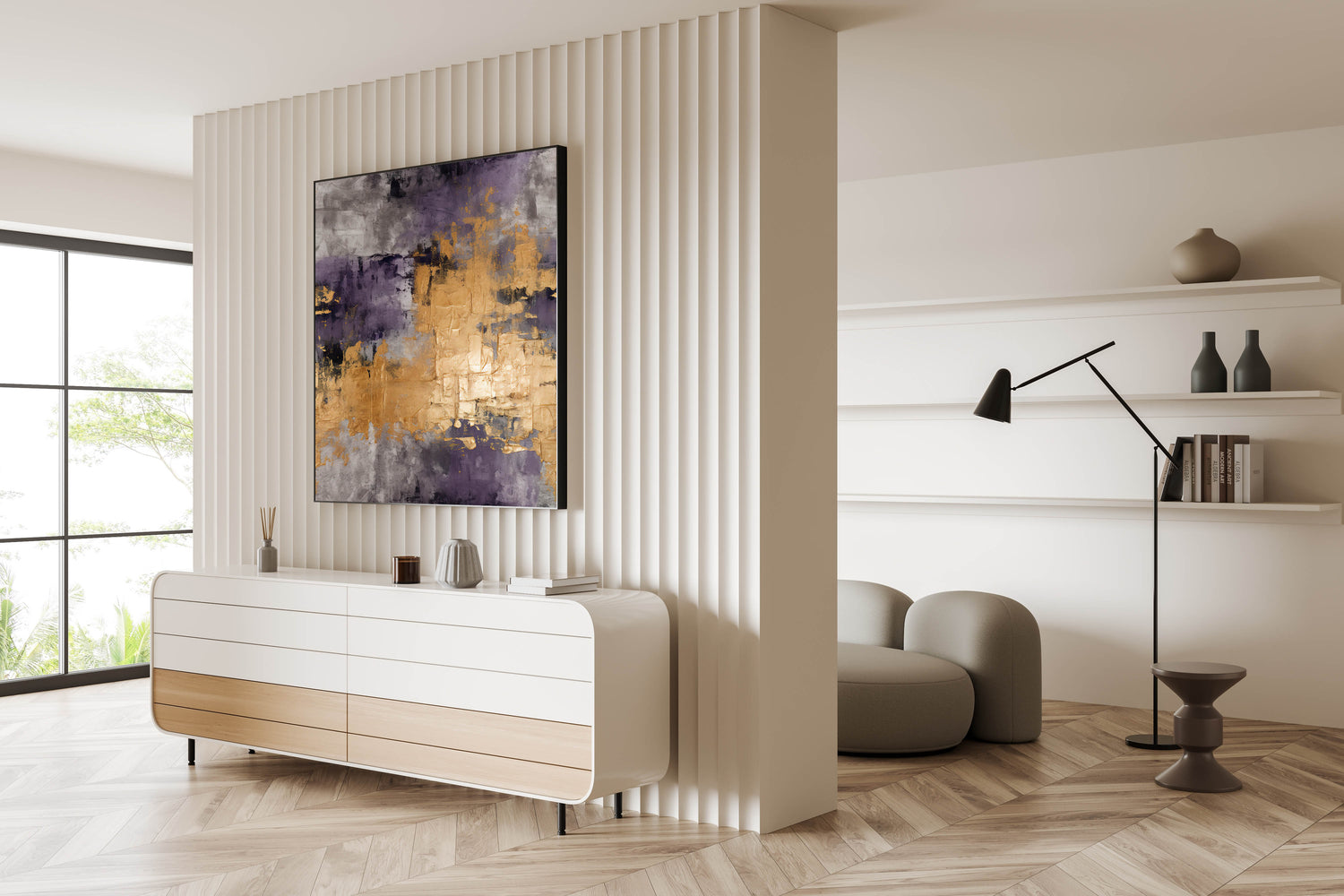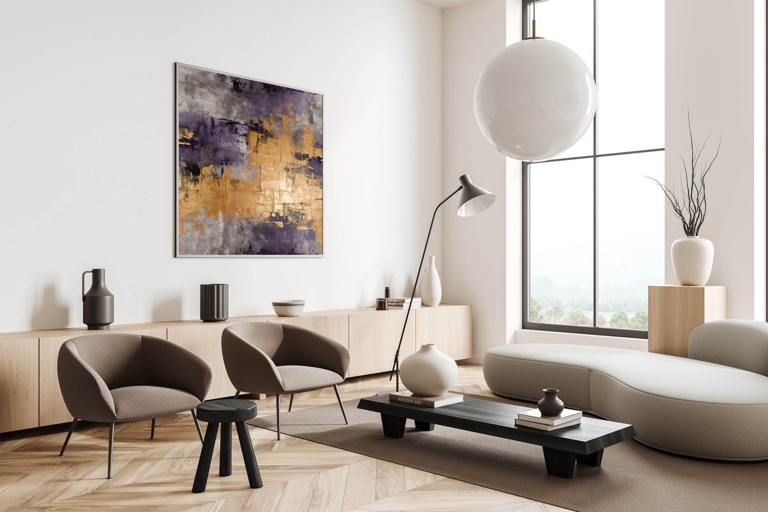 Add a touch of luxury to your space with this stunning abstract textured wall art. Featuring an opulent blend of metallic gold, deep purple, and soft gray tones, this artwork exudes sophistication and elegance. The layered textures and brushstrokes create a visually rich and tactile experience, perfect for adding depth to modern and upscale interiors. This piece’s harmonious color palette and intricate details make it a standout choice for anyone looking to elevate their decor.