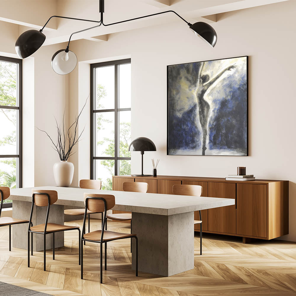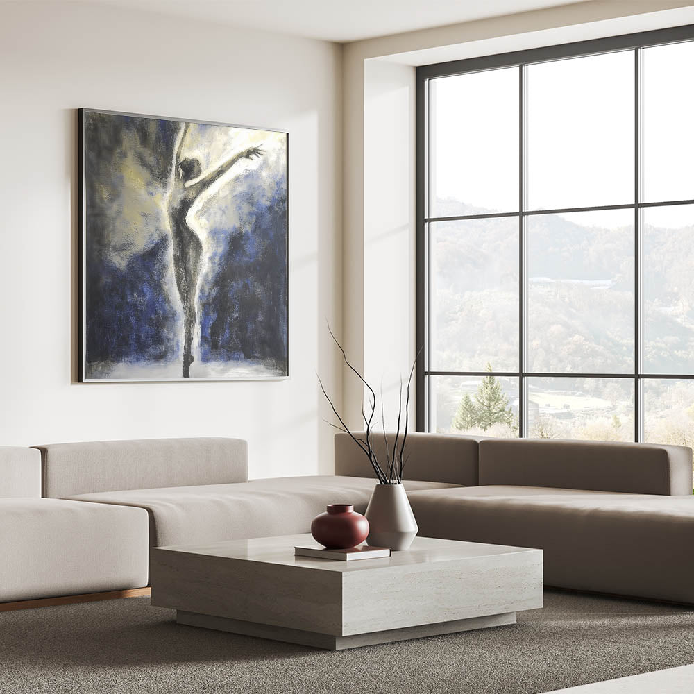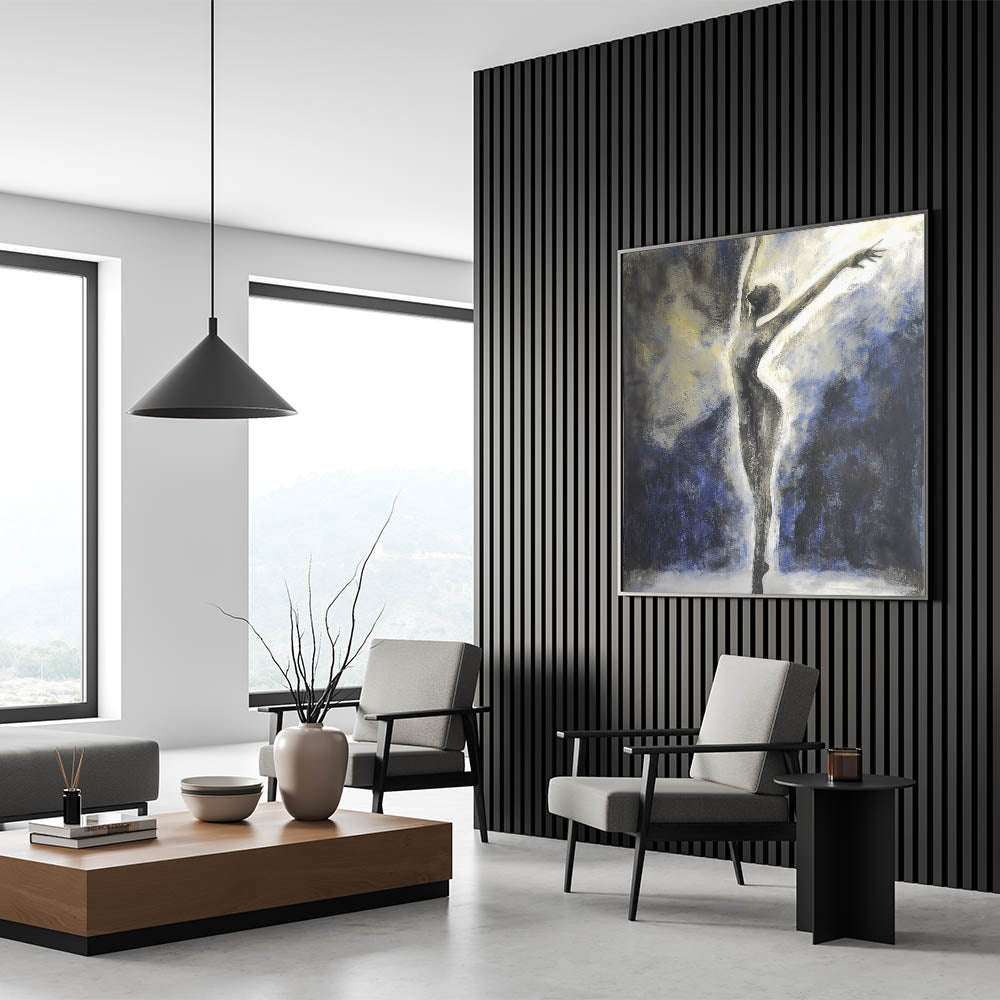 Celebrate grace and elegance with this Abstract Ballerina Wall Art, featuring a striking silhouette of a dancer in motion. The dramatic blend of black, white, deep blue, and subtle gold accents creates a mesmerizing visual that exudes sophistication and energy. Perfect for contemporary spaces, this figurative abstract canvas art captures the fluidity and beauty of human expression.