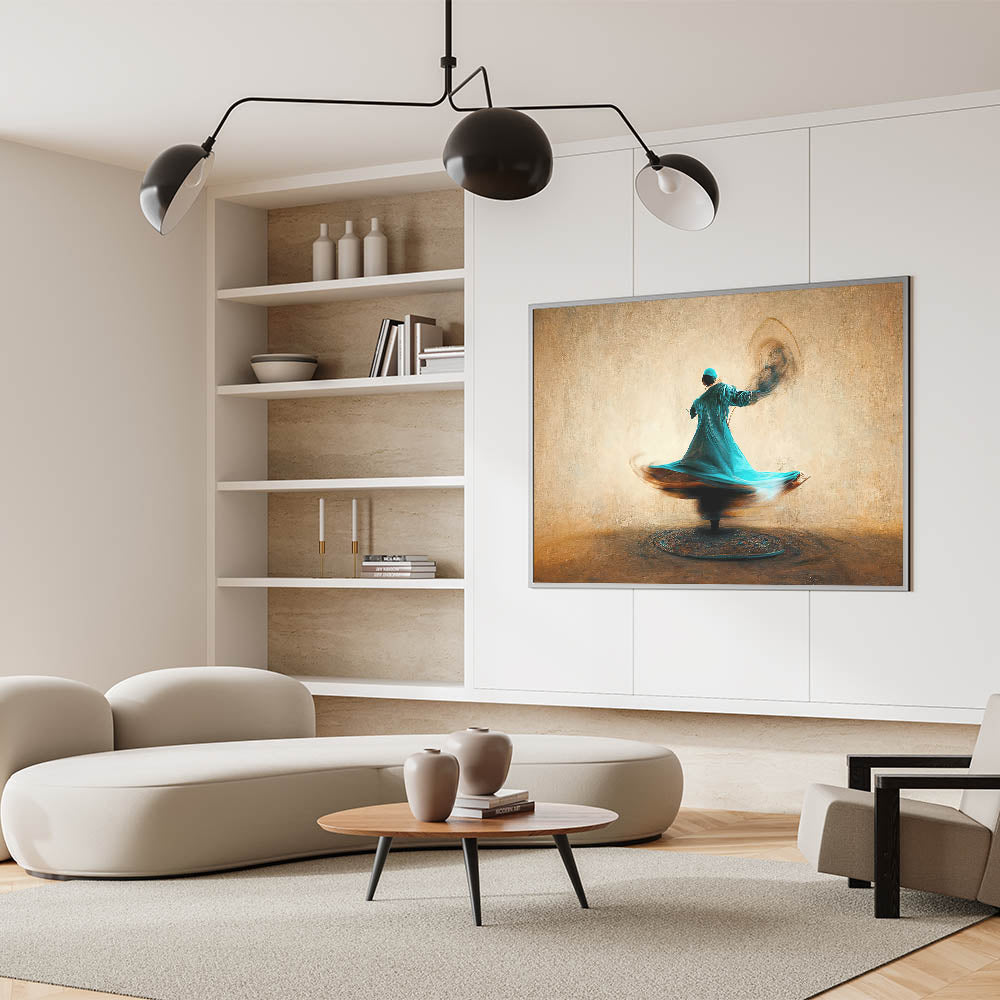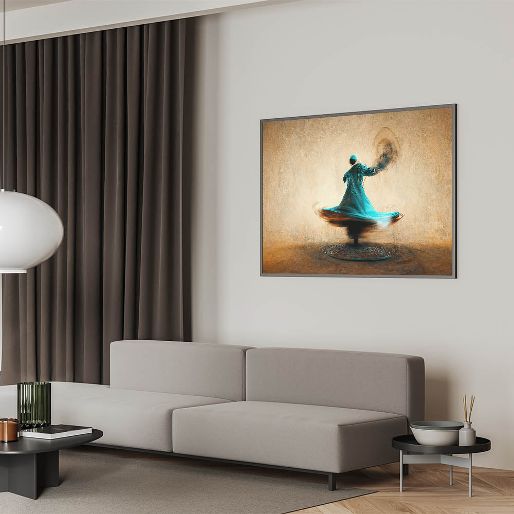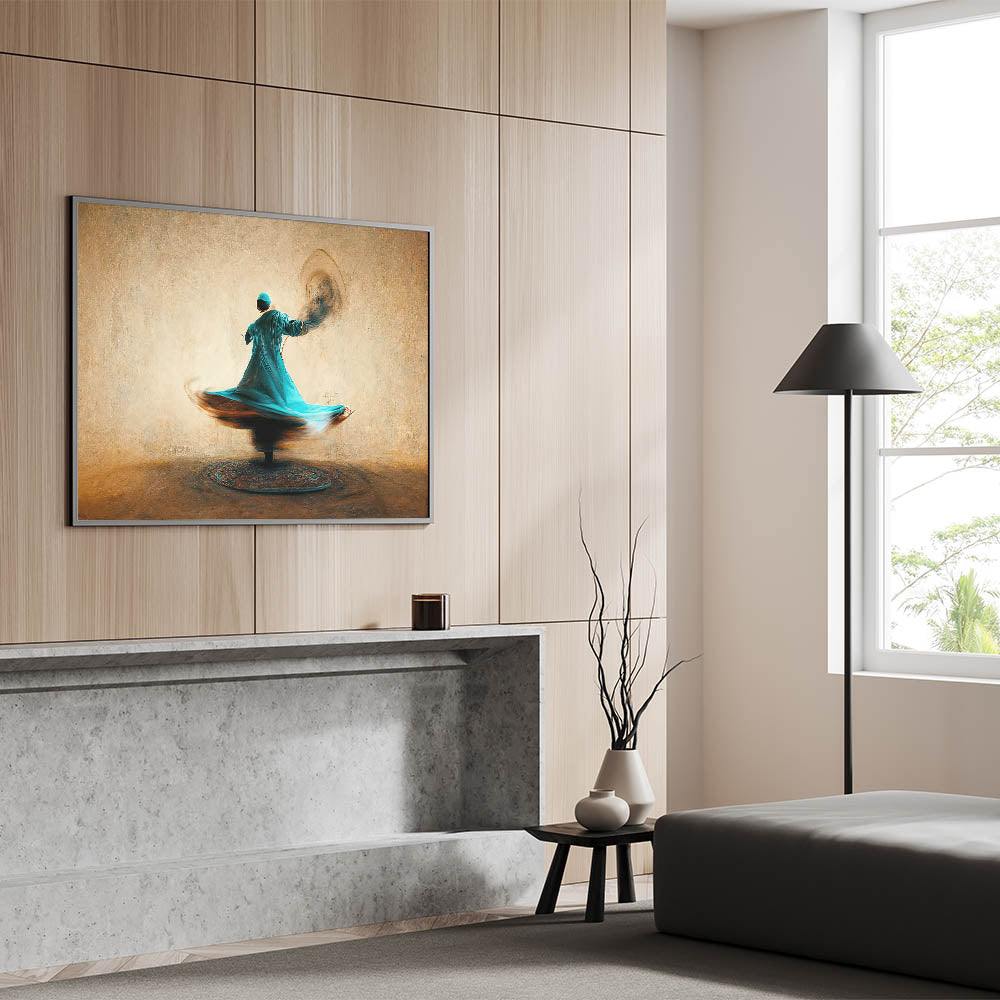 This abstract dervish canvas art captures the graceful motion of a figure in vibrant teal robes, set against a warm, earthy background. The swirling movement creates an almost hypnotic effect, evoking a sense of calm and spiritual depth. The contrast between the rich teal and the muted earth tones enhances the elegance of the figure, making it an eye-catching addition to any room.