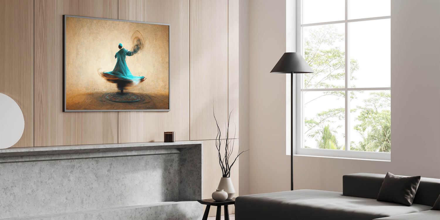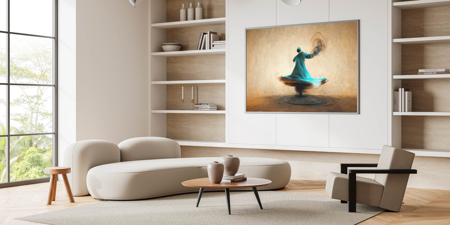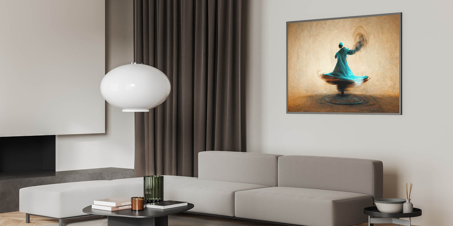 This abstract dervish canvas art captures the graceful motion of a figure in vibrant teal robes, set against a warm, earthy background. The swirling movement creates an almost hypnotic effect, evoking a sense of calm and spiritual depth. The contrast between the rich teal and the muted earth tones enhances the elegance of the figure, making it an eye-catching addition to any room.
