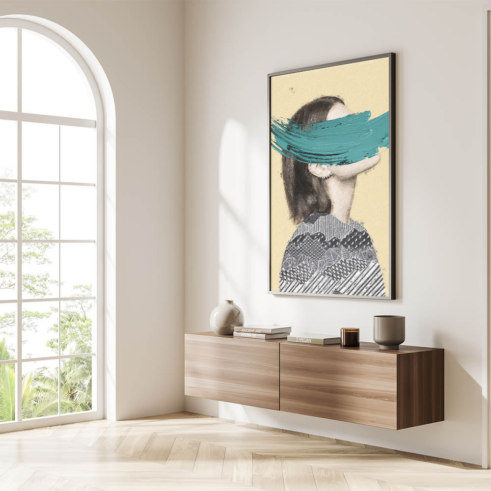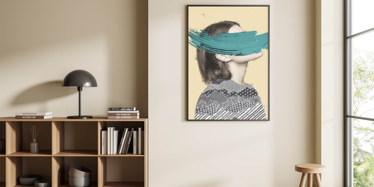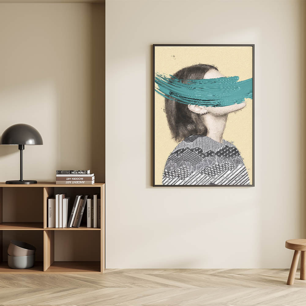 Add a bold touch of creativity to your space with this Abstract Figurative Canvas Art, a unique blend of modern texture and striking color. This artwork features a partial portrait with intricate black-and-white geometric patterns, contrasted by a bold teal brushstroke that brings vibrancy and contemporary flair. The soft beige background creates warmth, allowing the bold design elements to shine.