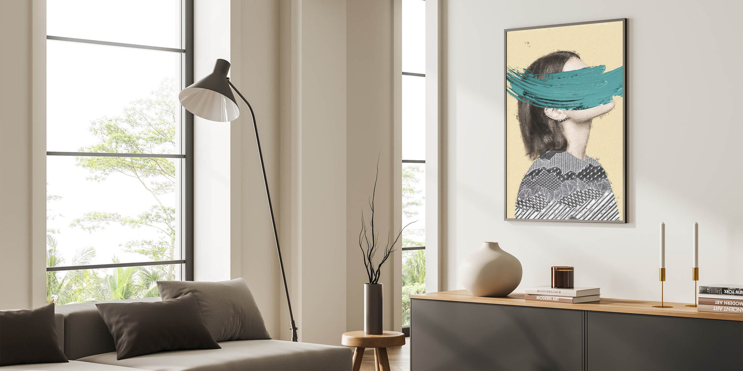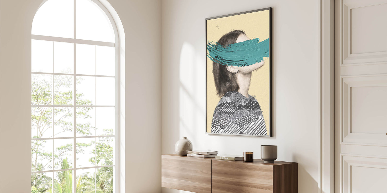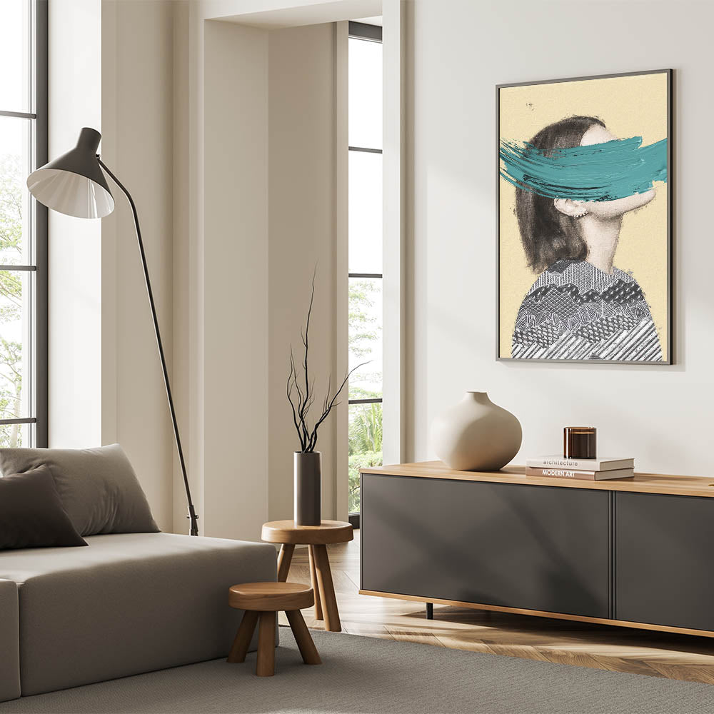 Add a bold touch of creativity to your space with this Abstract Figurative Canvas Art, a unique blend of modern texture and striking color. This artwork features a partial portrait with intricate black-and-white geometric patterns, contrasted by a bold teal brushstroke that brings vibrancy and contemporary flair. The soft beige background creates warmth, allowing the bold design elements to shine.
