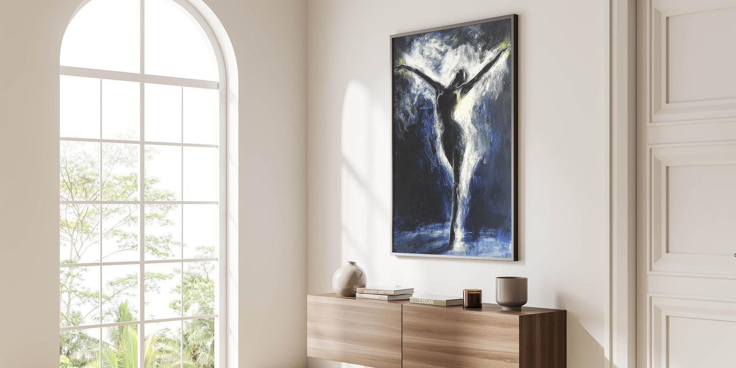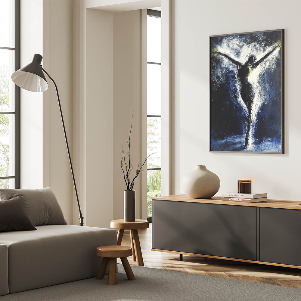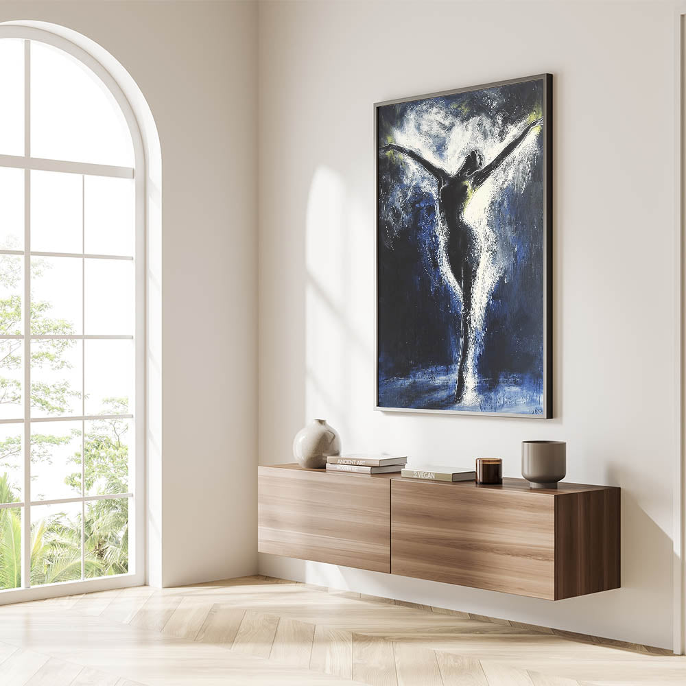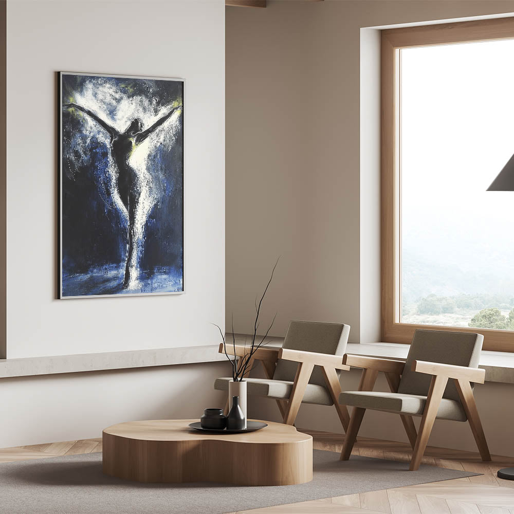 Infuse your space with elegance and motion with this Abstract Figurative Canvas Art, depicting a graceful silhouette in dynamic motion. This stunning design features a black figure illuminated by glowing white strokes and deep midnight blue accents, capturing the essence of freedom and energy. Perfectly blending modern minimalism and artistic expression, this piece adds sophistication to any room.