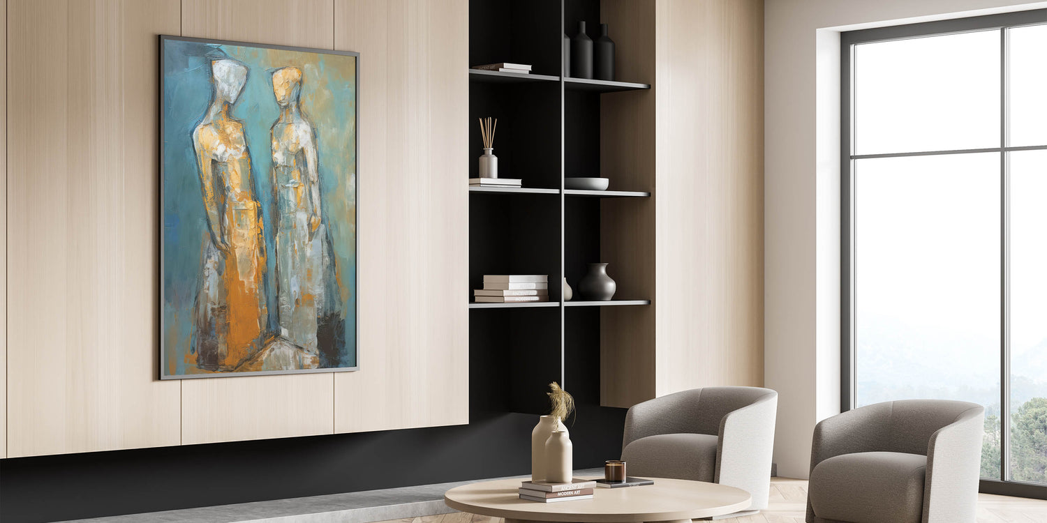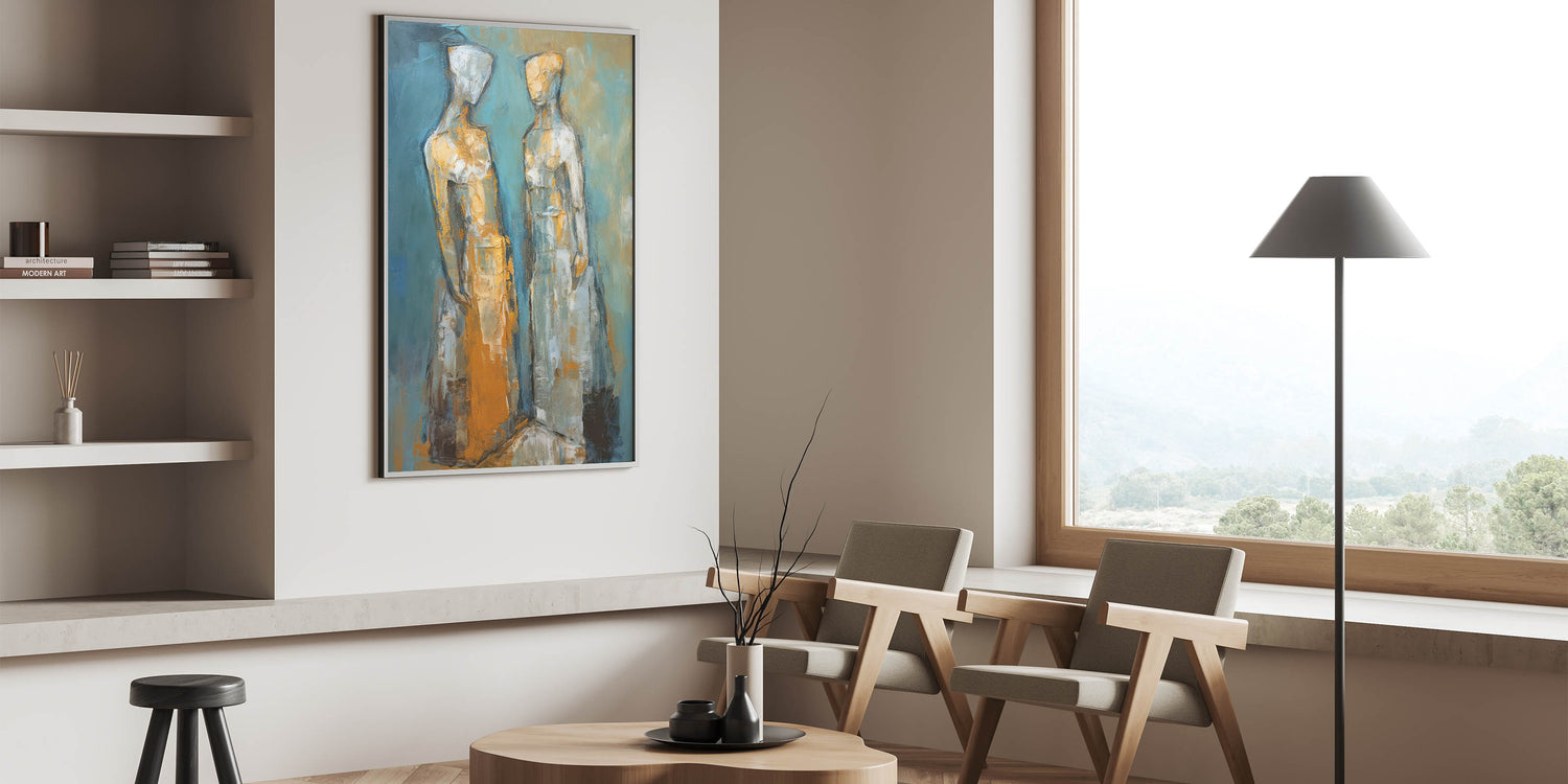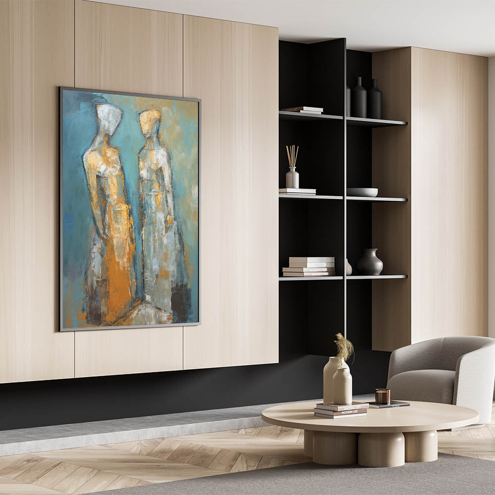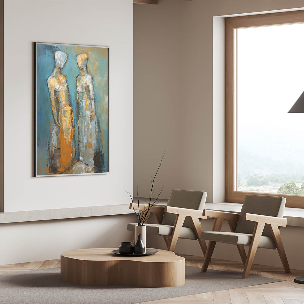 Introducing our Abstract Figures in Blue and Gold wall art, a mesmerizing piece that combines modern design with abstract elegance. This artwork features two stylized figures rendered in a rich palette of blue and gold, creating a sophisticated and visually striking composition.