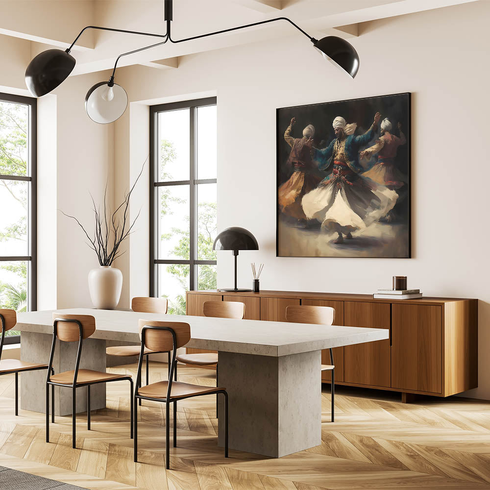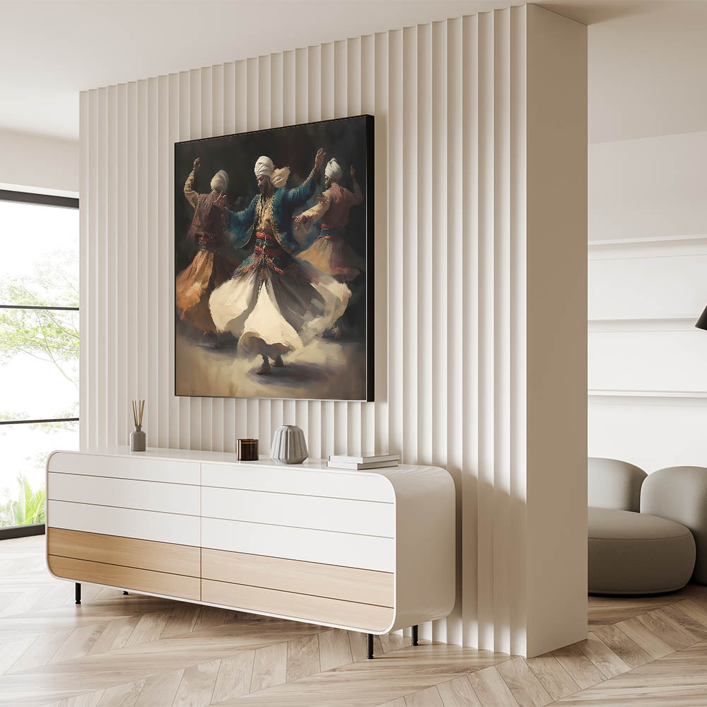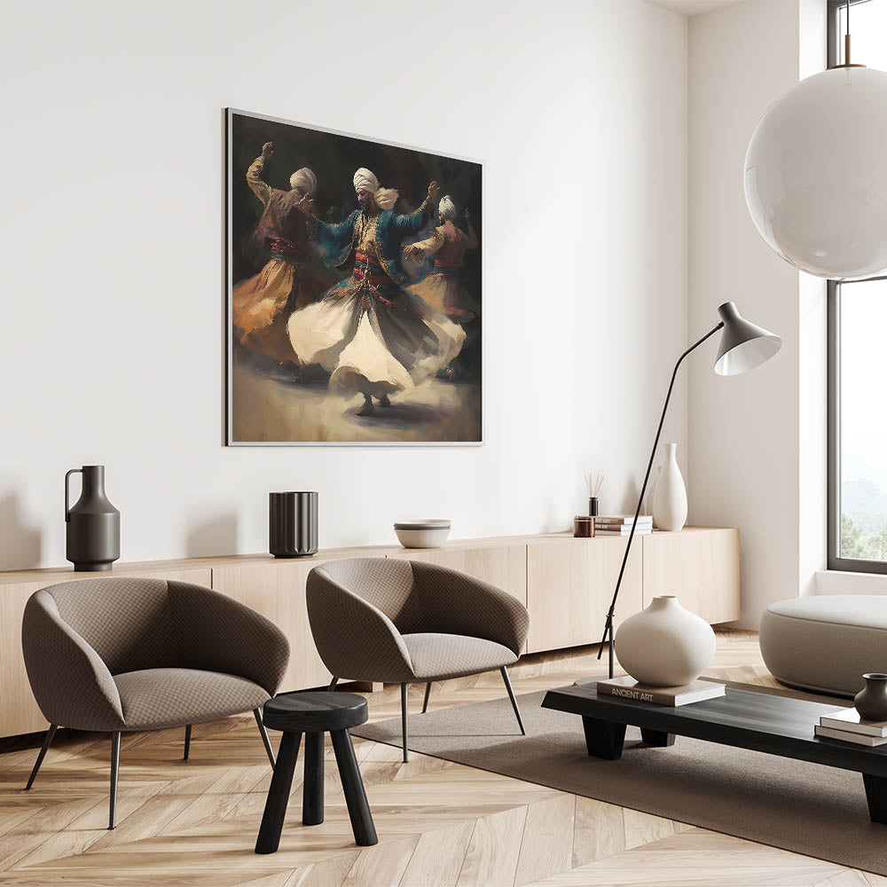 This mesmerizing artwork captures the enchanting motion of whirling dervishes in a captivating blend of earthy tones and rich textures. The figures are depicted with dynamic brushstrokes, creating a sense of movement that draws viewers into a meditative trance. Shades of brown, cream, and deep teal bring warmth and depth to the piece, making it an exquisite addition to any art collection.