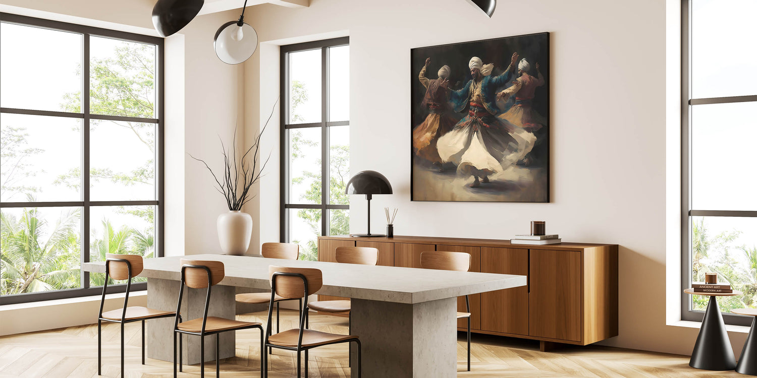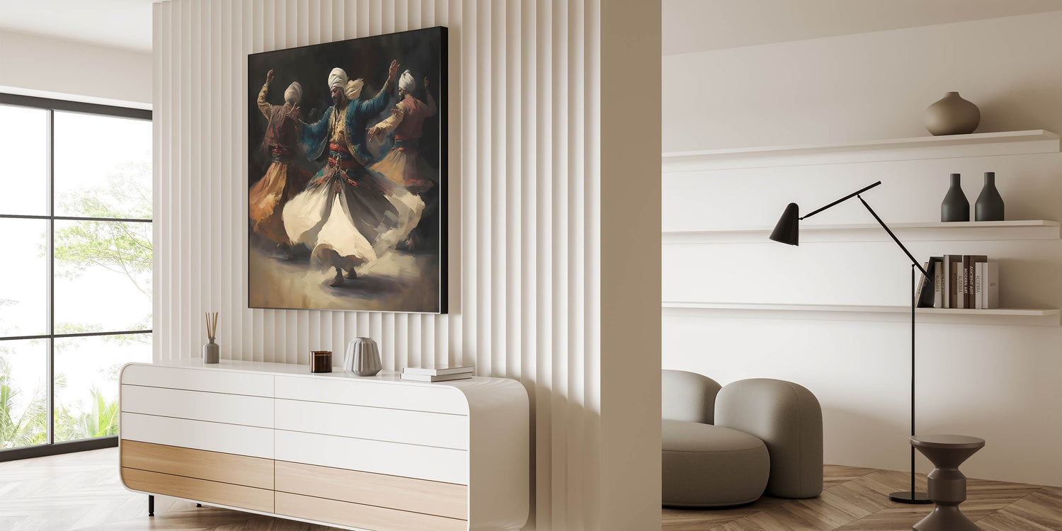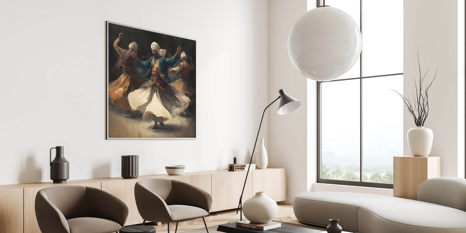This mesmerizing artwork captures the enchanting motion of whirling dervishes in a captivating blend of earthy tones and rich textures. The figures are depicted with dynamic brushstrokes, creating a sense of movement that draws viewers into a meditative trance. Shades of brown, cream, and deep teal bring warmth and depth to the piece, making it an exquisite addition to any art collection.