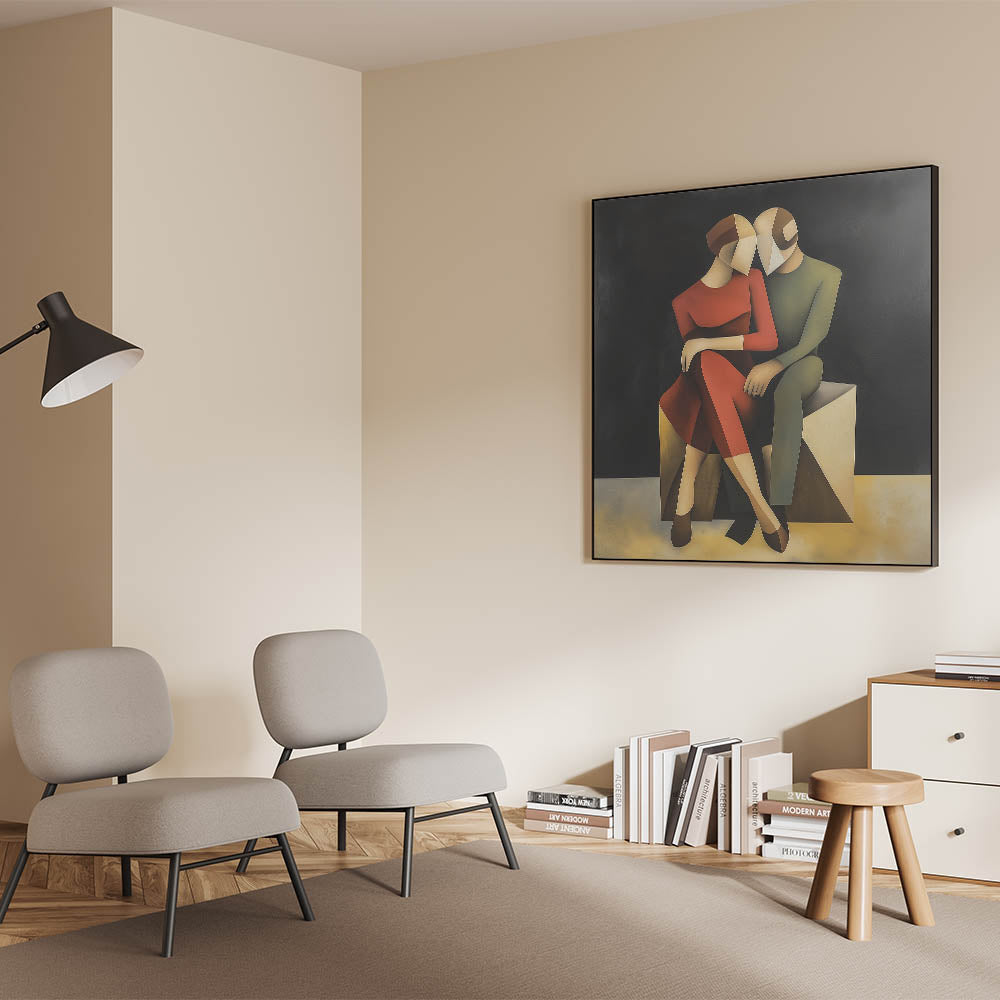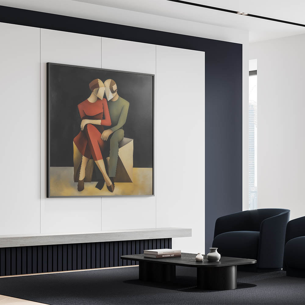 Introduce warmth and intimacy to your space with this Abstract Human Figures Canvas featuring two seated figures in a tender pose. Rendered in a sophisticated palette of terracotta, olive green, and beige, this artwork exudes elegance and modernity. The geometric abstraction highlights the beauty of artistic human figure patterns, making it a stunning centerpiece for any contemporary interior.