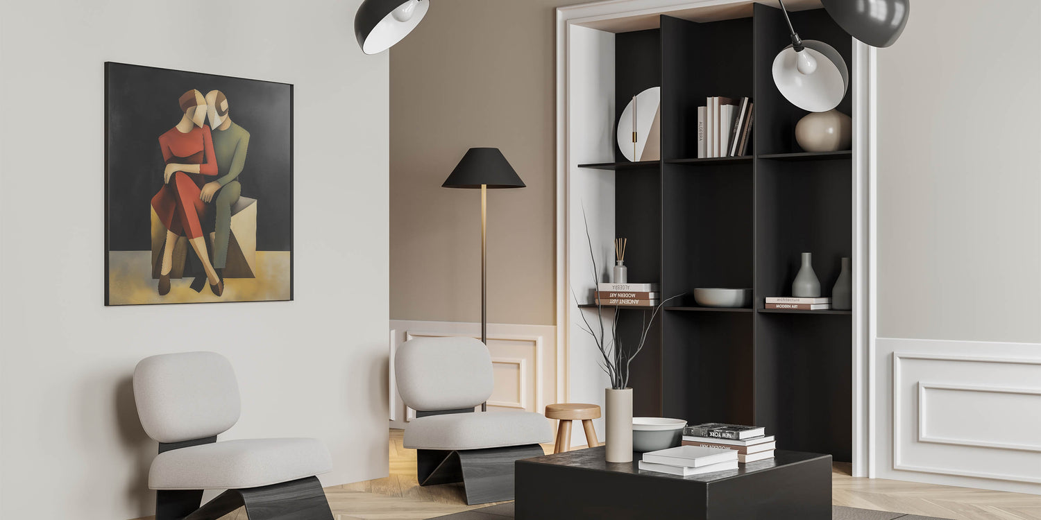 - Unique geometric abstraction of human figures for a refined aesthetic.