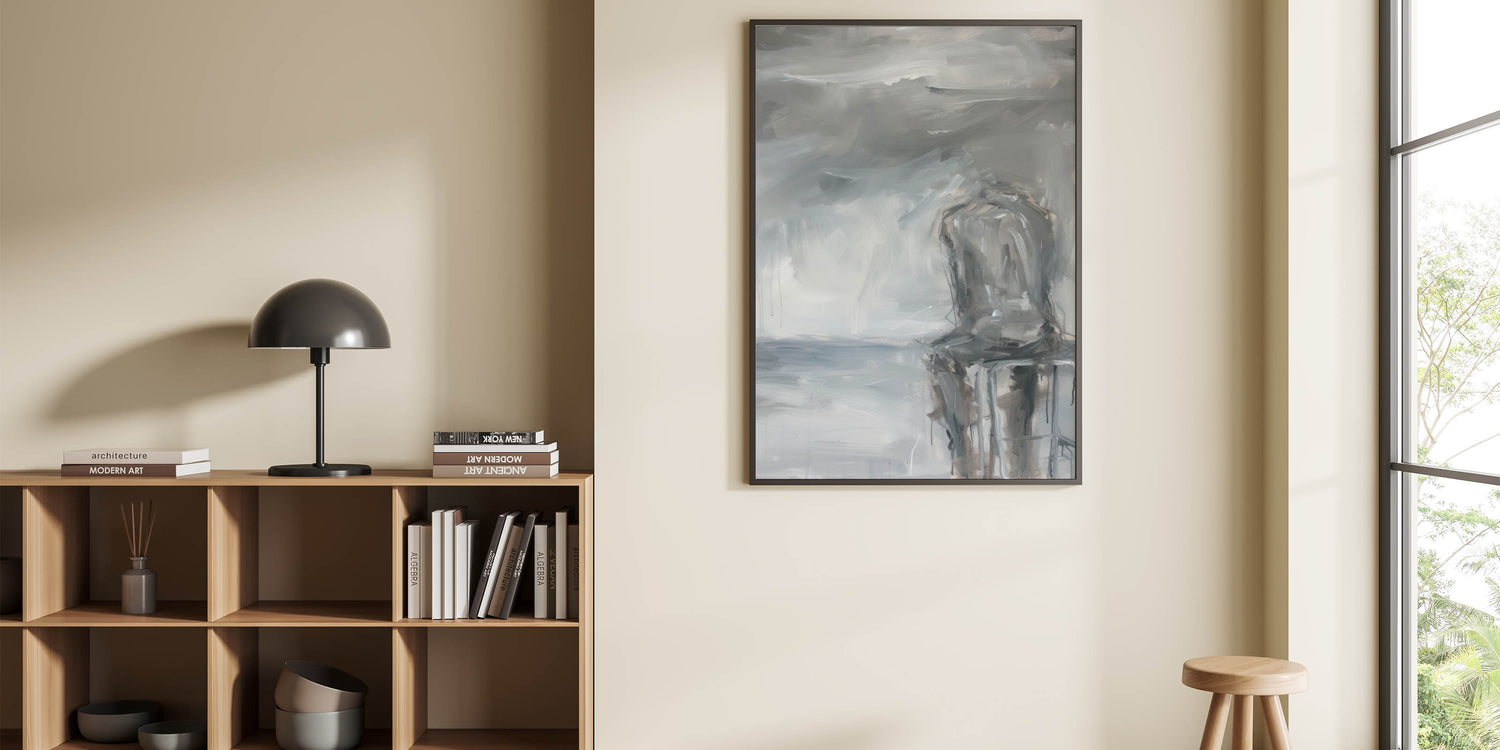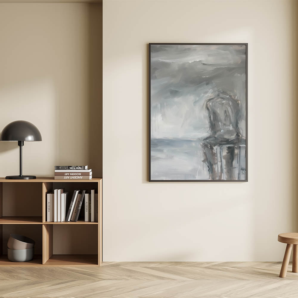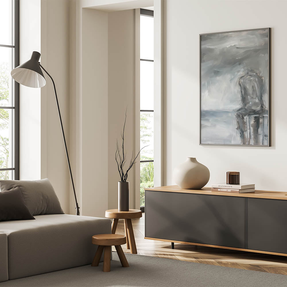 Infuse your space with a sense of mystery and emotion with this contemporary abstract figurative painting. Featuring a solitary figure portrayed with fluid brushstrokes in muted grays, this artwork evokes introspection and tranquility. The minimalist composition and subtle interplay of light and shadow make this piece a perfect addition to modern, industrial, or minimalist interiors.