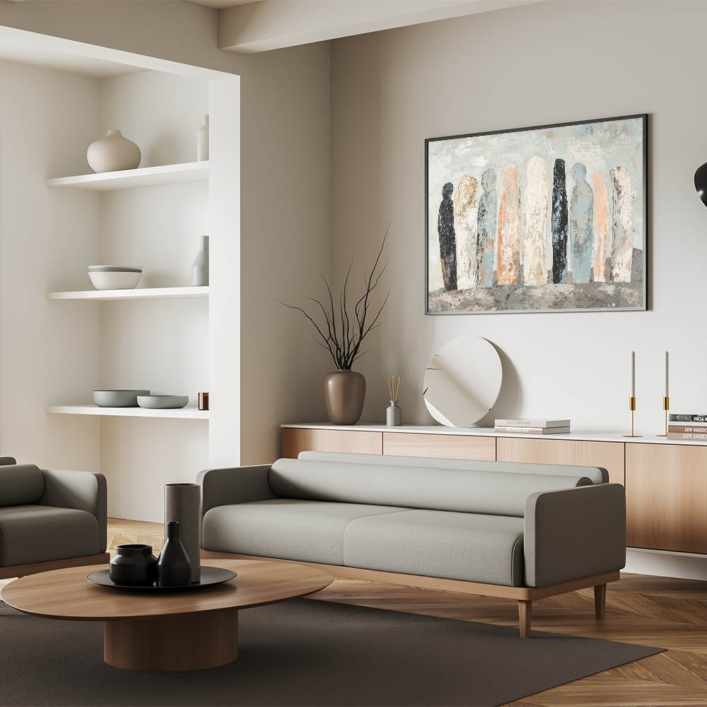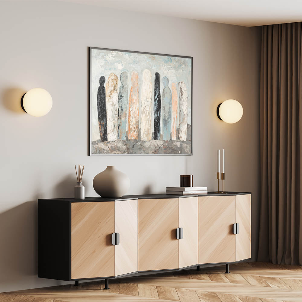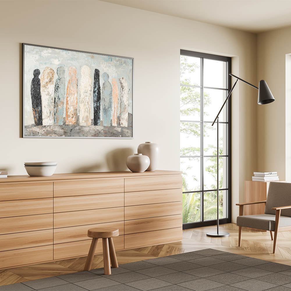 Introduce a serene yet captivating ambiance to your space with this Abstract Human Figures artwork. This design features a muted color palette of soft peach, black, white, and light blue, portraying silhouetted human figures in a minimalist style. Perfect for modern interiors, this piece embodies contemporary figurative wall art with a subtle abstract touch, making it a timeless addition to any décor.