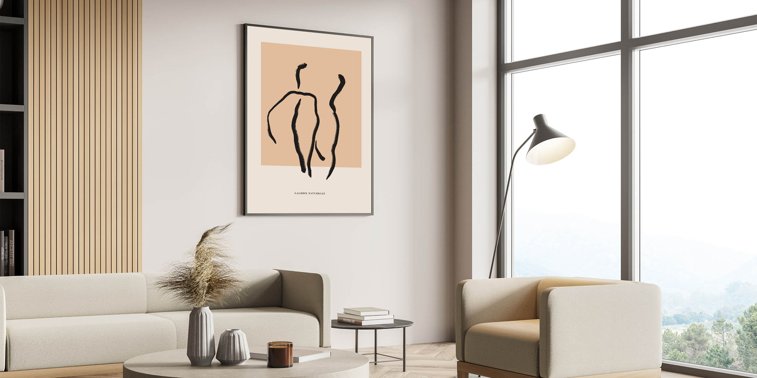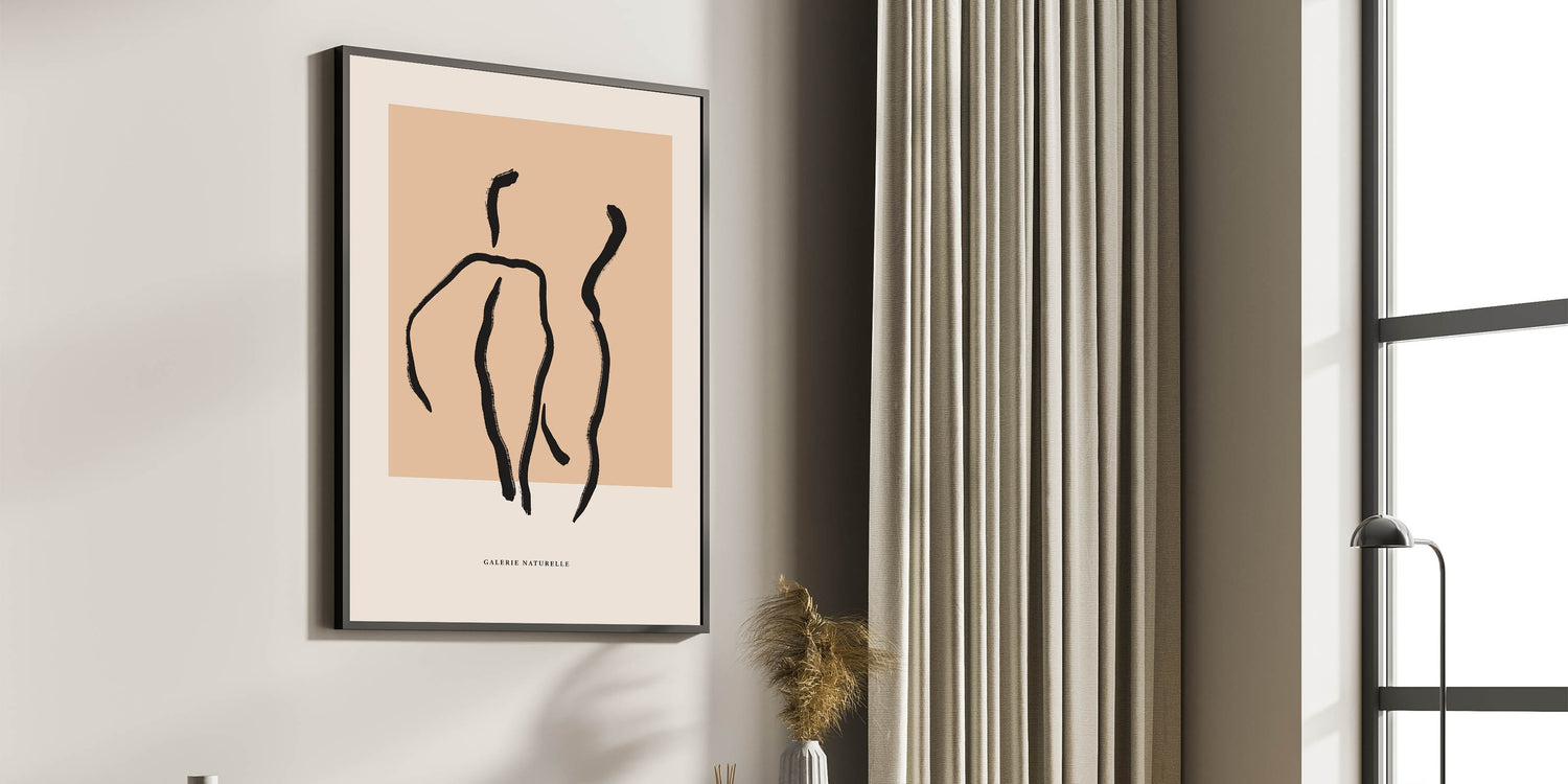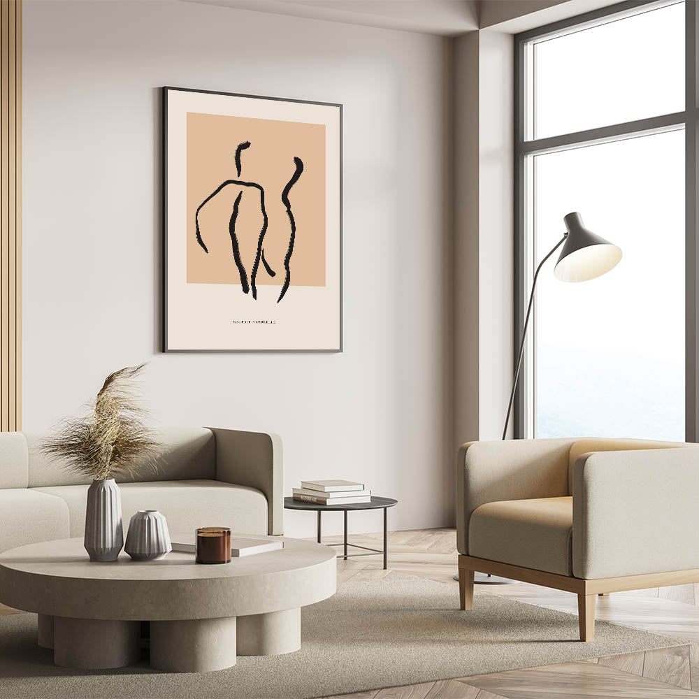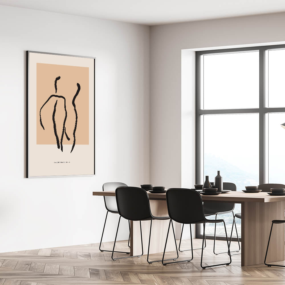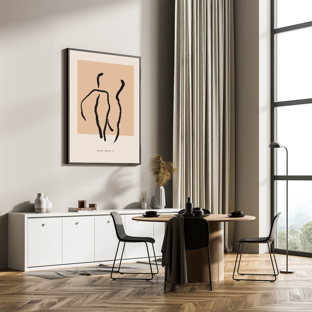 Elevate your space with this abstract minimalist figure art. Featuring bold black lines that delicately outline human forms, this artwork beautifully blends simplicity and modernity. The neutral beige background contrasts with the striking linework, creating a dynamic yet elegant visual statement. Perfect for those who appreciate modern art and minimalist design, this piece is a versatile addition to any contemporary space.