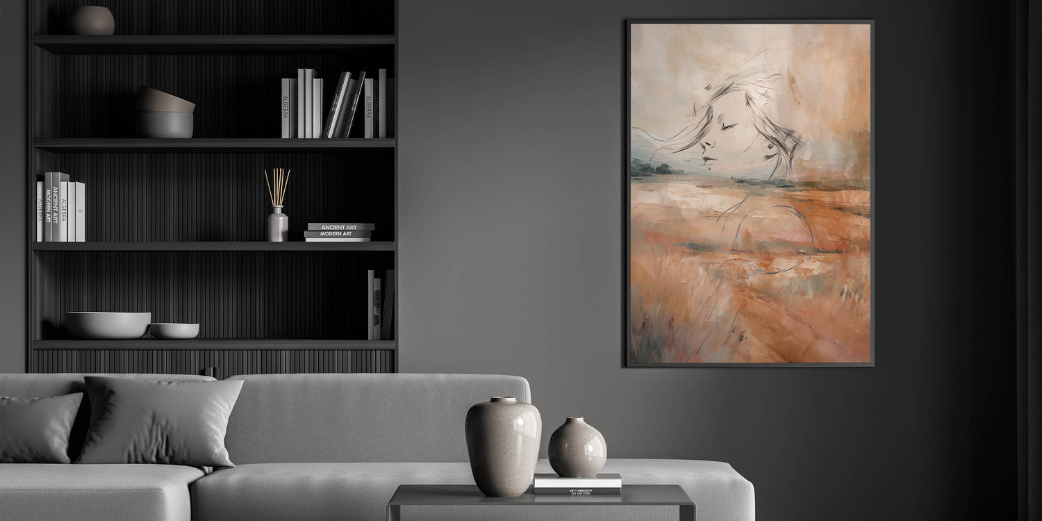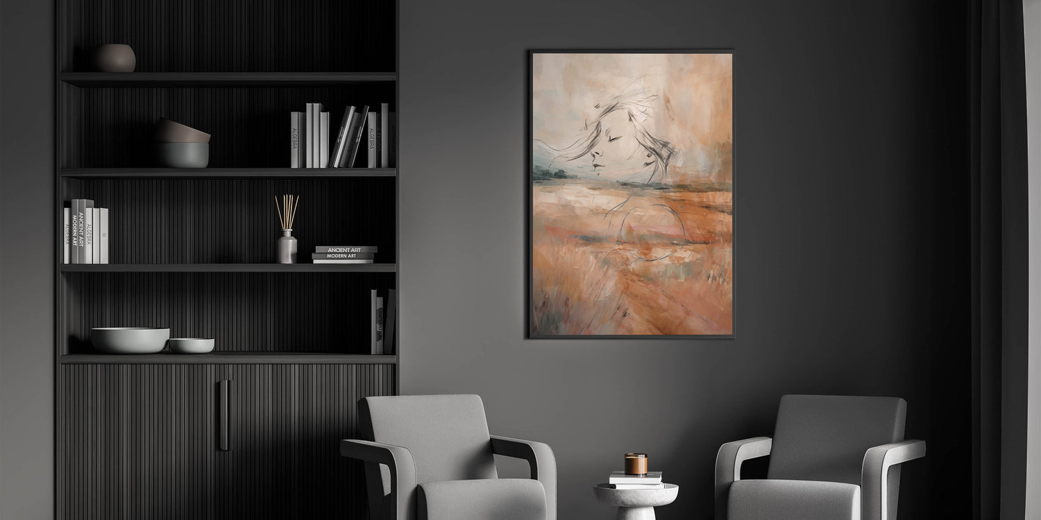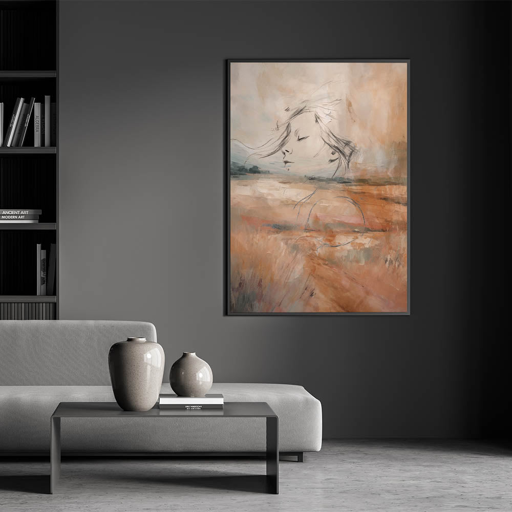 Add a touch of ethereal beauty to your home with this abstract minimalist portrait. Featuring a serene female face delicately sketched into a dreamy landscape, this artwork combines nature and human form in a uniquely harmonious composition. The soft blend of earthy tones and pastel colors creates a calm and reflective mood, making it a perfect addition to modern interiors.