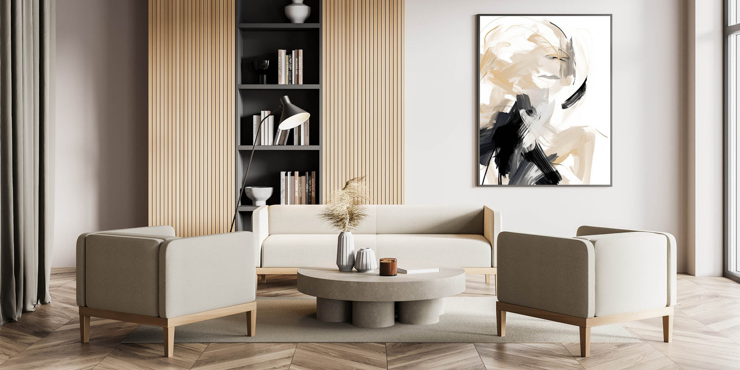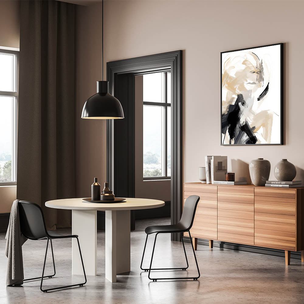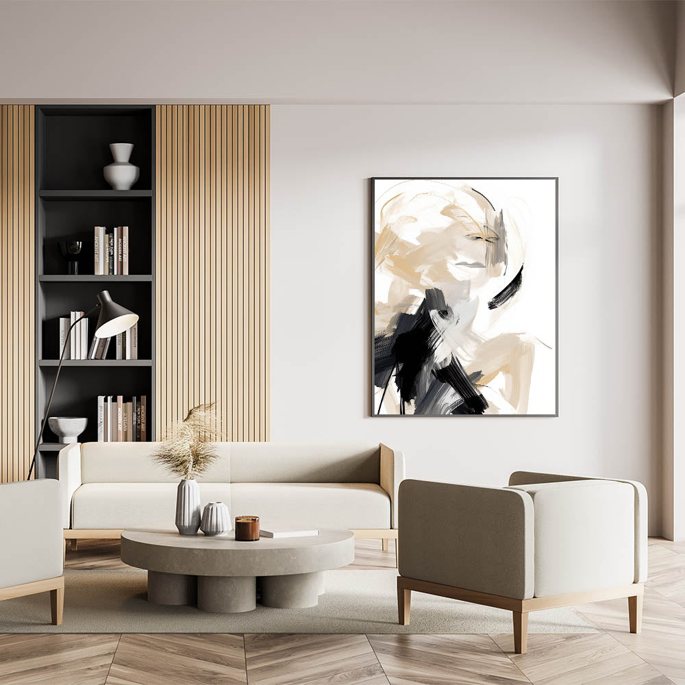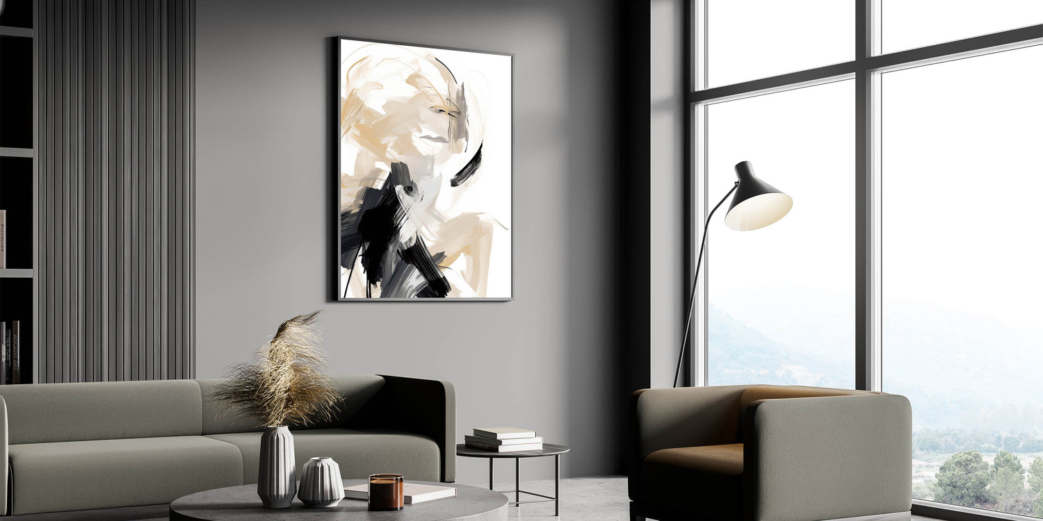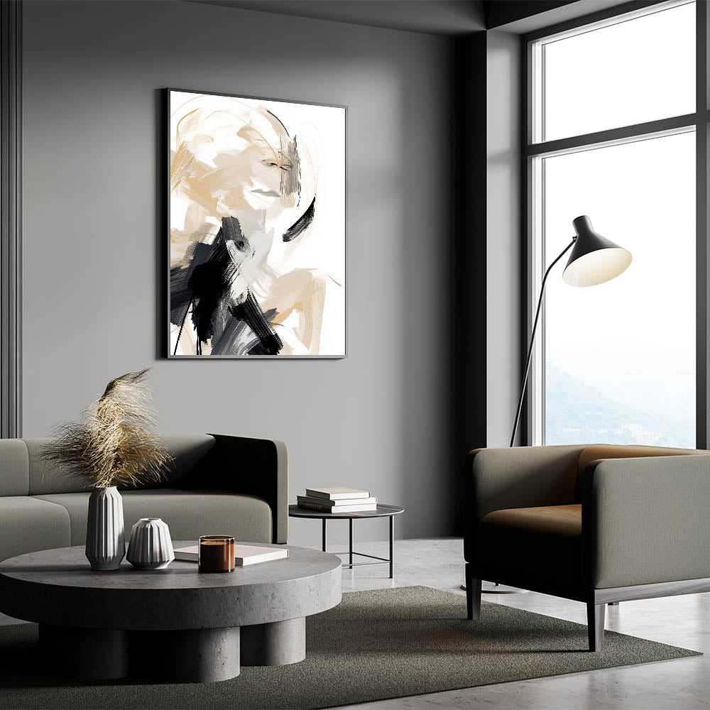 Add a bold yet elegant statement to your space with this abstract minimalist wall art, featuring dynamic brushstrokes in beige, black, and white. The energetic lines and fluid motion of the design create a captivating visual experience, making it a striking focal point for modern interiors. Perfect for minimalist spaces, this artwork blends movement with simplicity, offering both contrast and harmony to any room.