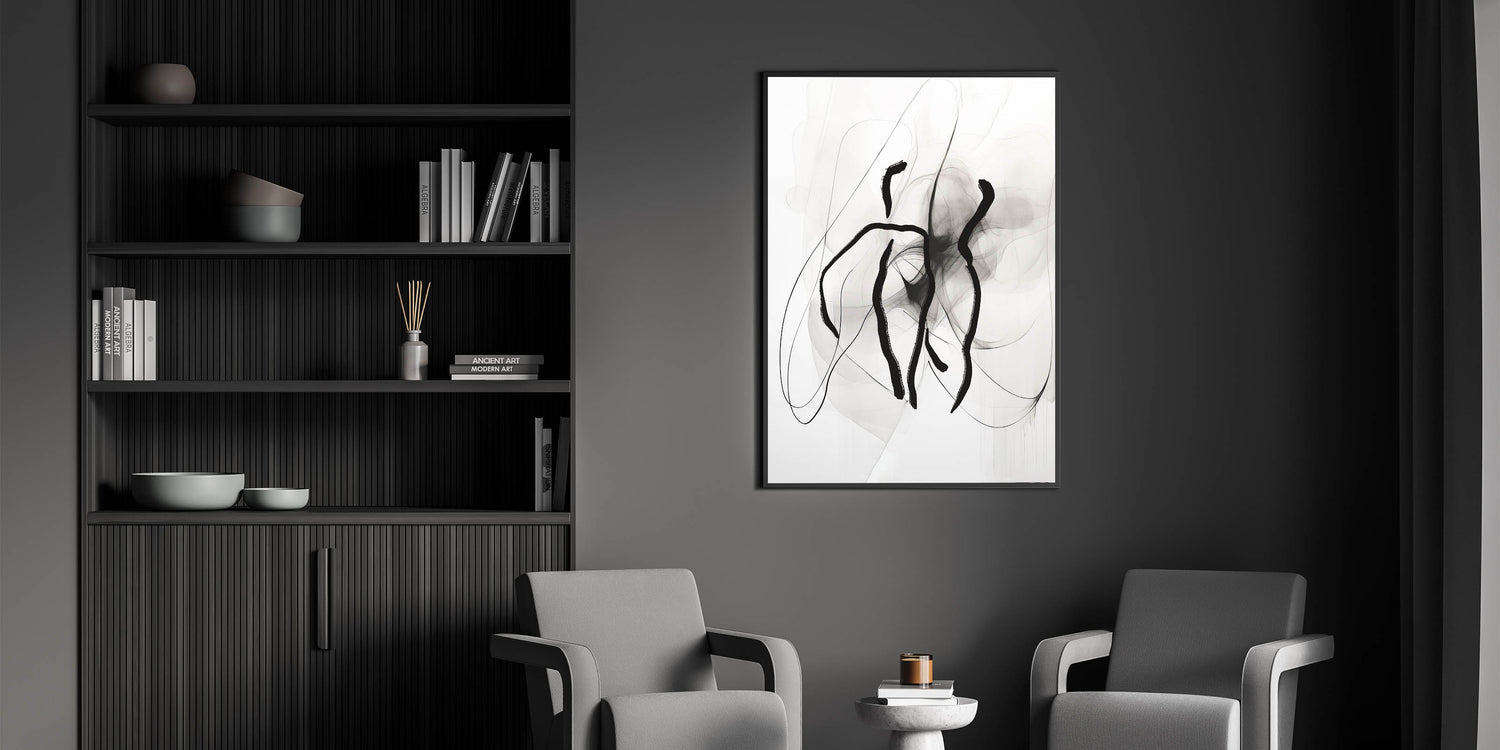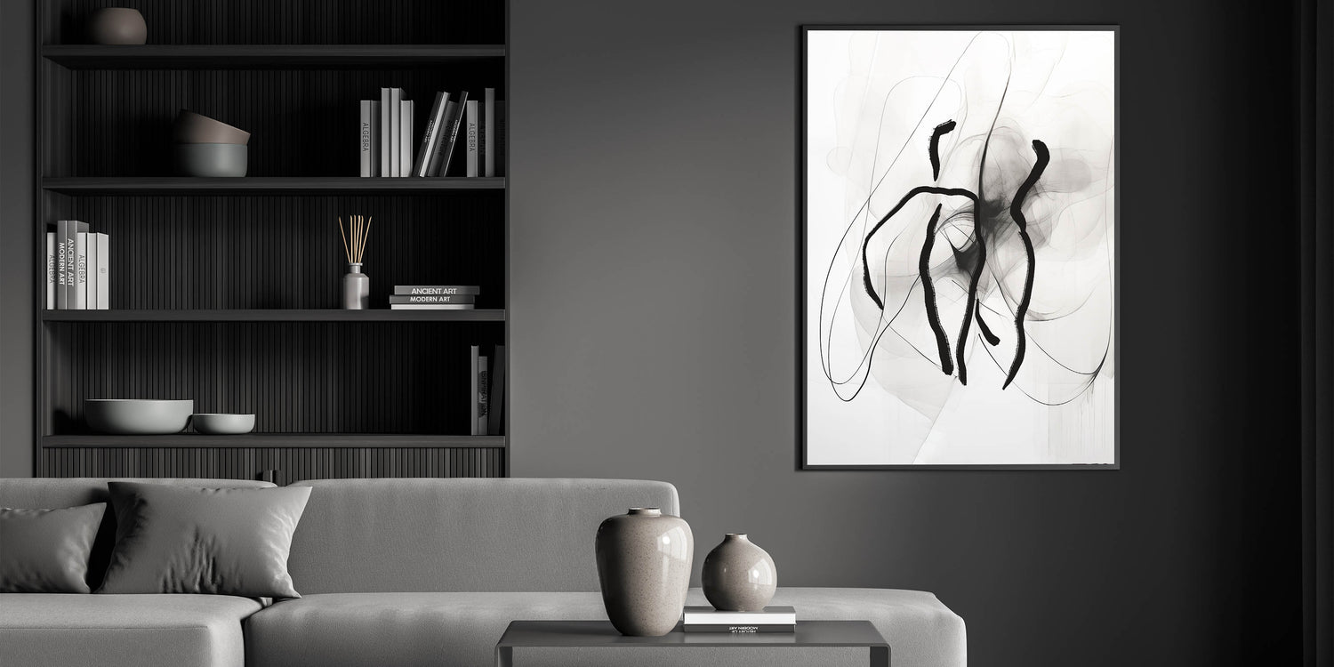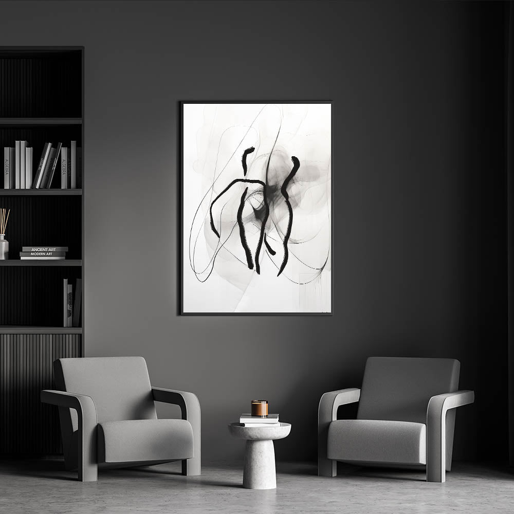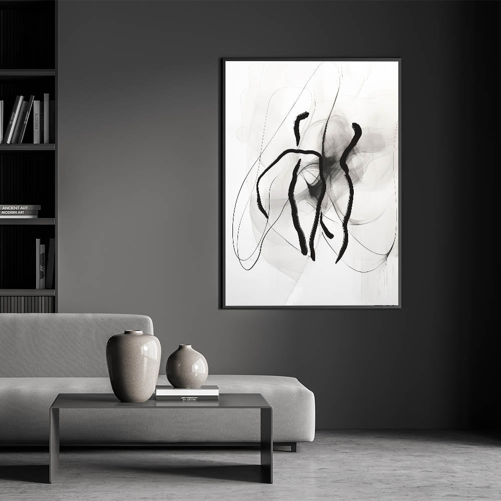 This striking minimalist wall art piece offers a captivating blend of minimal art style and abstract elegance. The bold black line work set against a light, smoky background creates a powerful sense of movement and flow, making this abstract minimalist painting a statement piece for any contemporary home. Its monochrome palette makes it versatile and timeless, seamlessly fitting into various decor styles.
