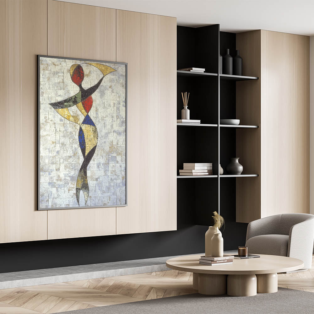 Transform your space with this Abstract Mosaic Figurative Art, featuring a striking human silhouette crafted with intricate mosaic patterns. The dynamic design blends rich tones of red, yellow, blue, and black against a textured background, creating a visually stunning centerpiece. This figurative abstract canvas art combines elegance and movement, making it ideal for contemporary and eclectic interiors.