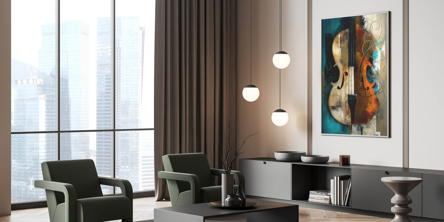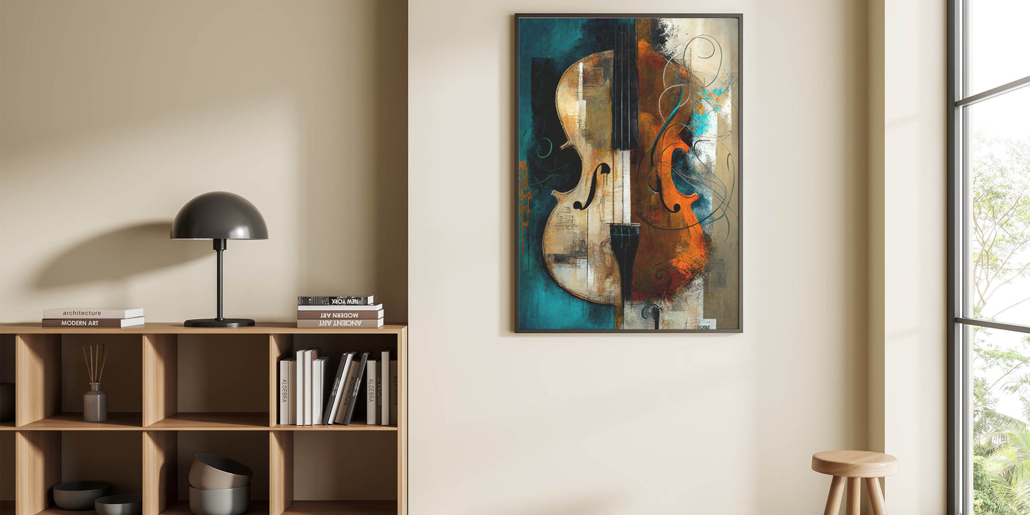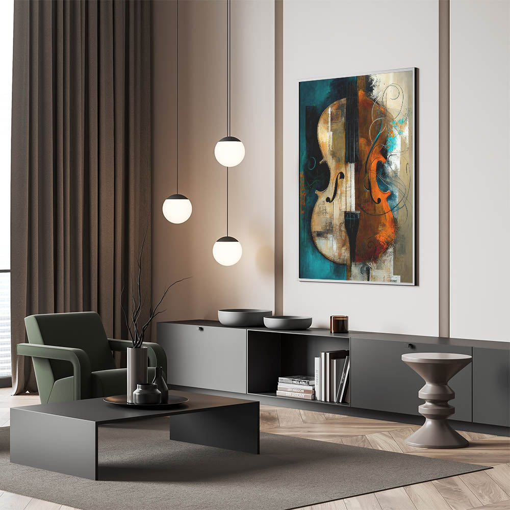 Ideal for those who appreciate the arts, this abstract violin art piece brings warmth and sophistication to any space. Its rich colors and dynamic composition make it a captivating focal point, harmonizing the beauty of music and visual art.