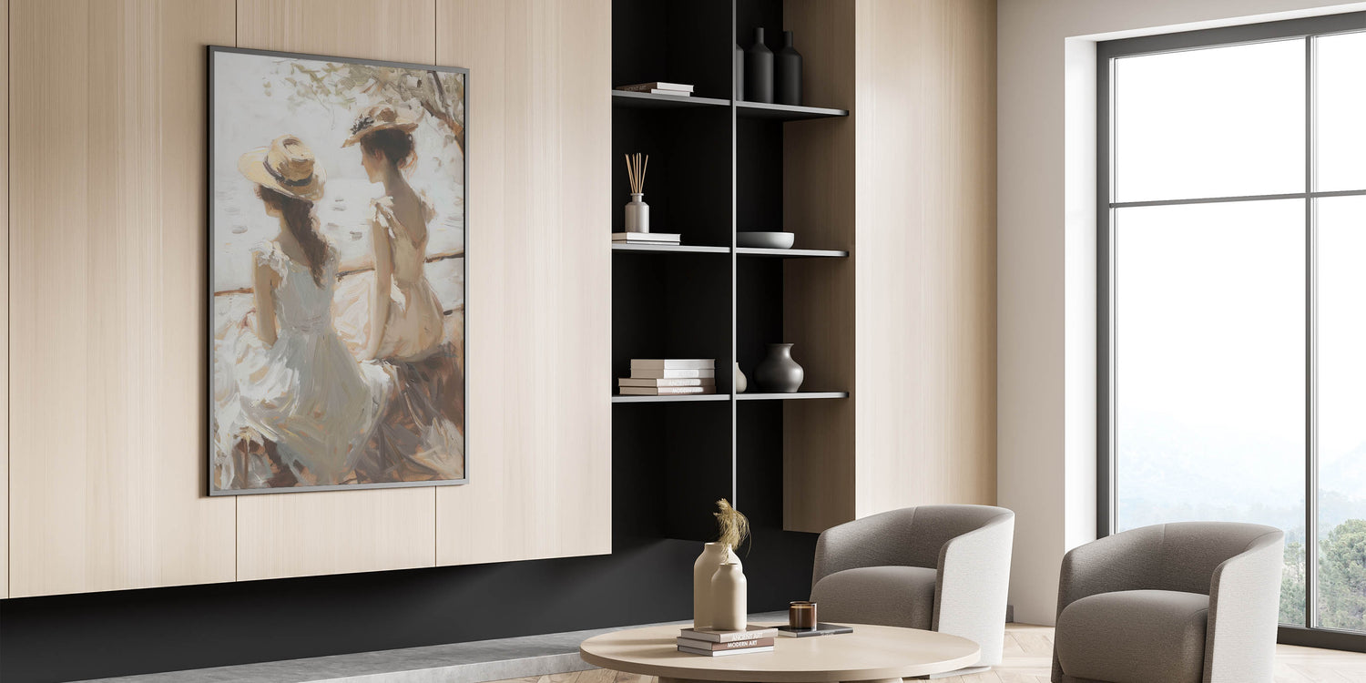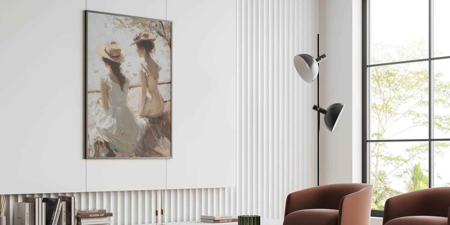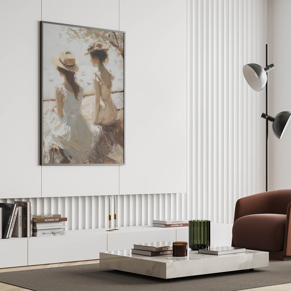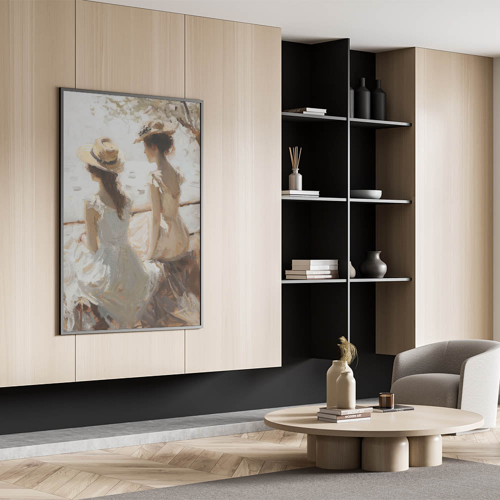 Celebrate the beauty of human connection and elegance with this stunning figurative abstract artwork. Depicting two women in graceful poses by the water, this painting captures a serene and timeless moment of reflection. The soft brushstrokes and earthy tones make this artwork a perfect fit for both classic and modern interiors.