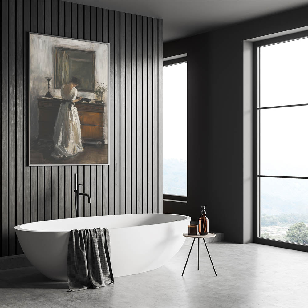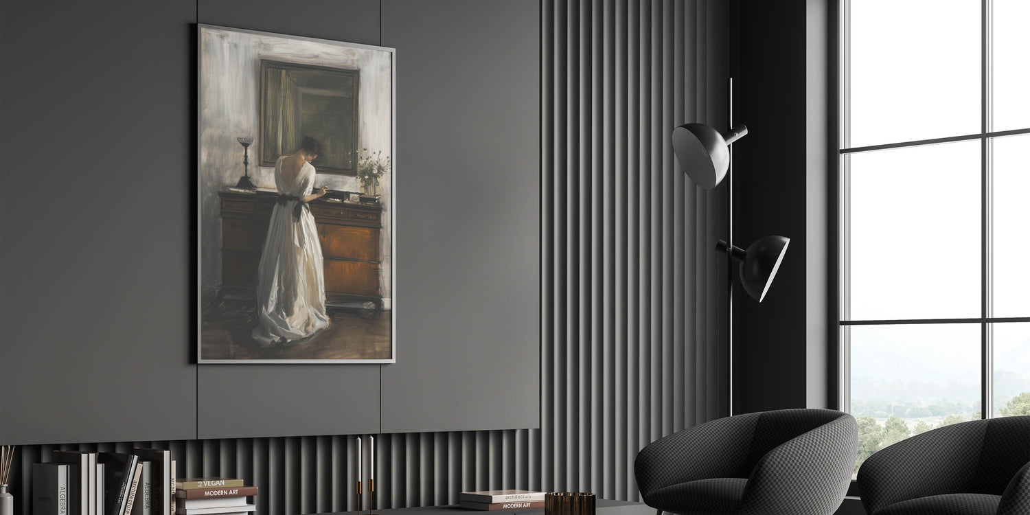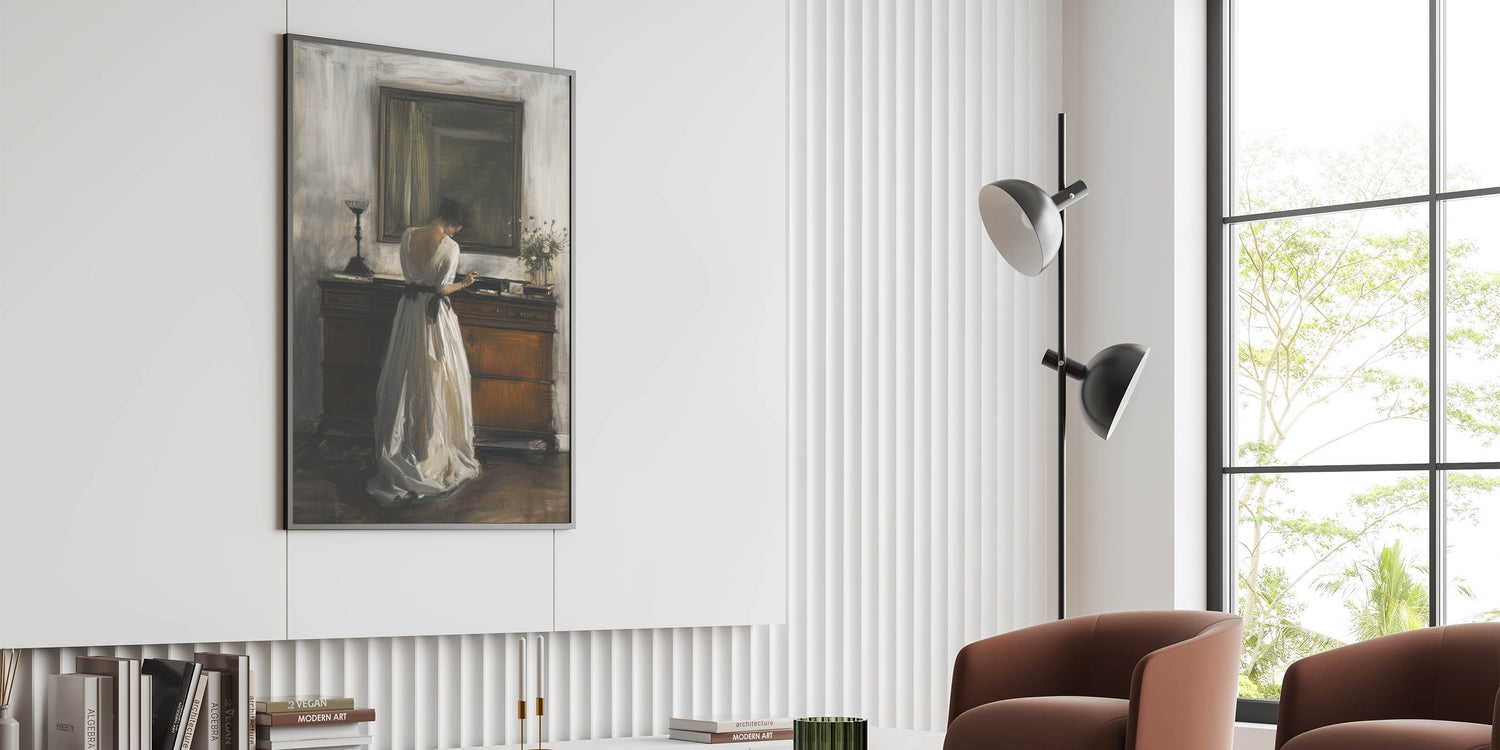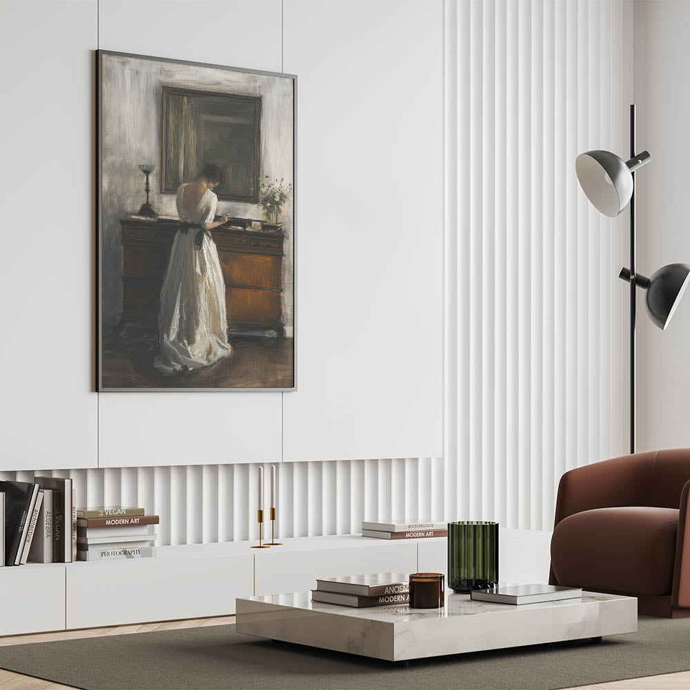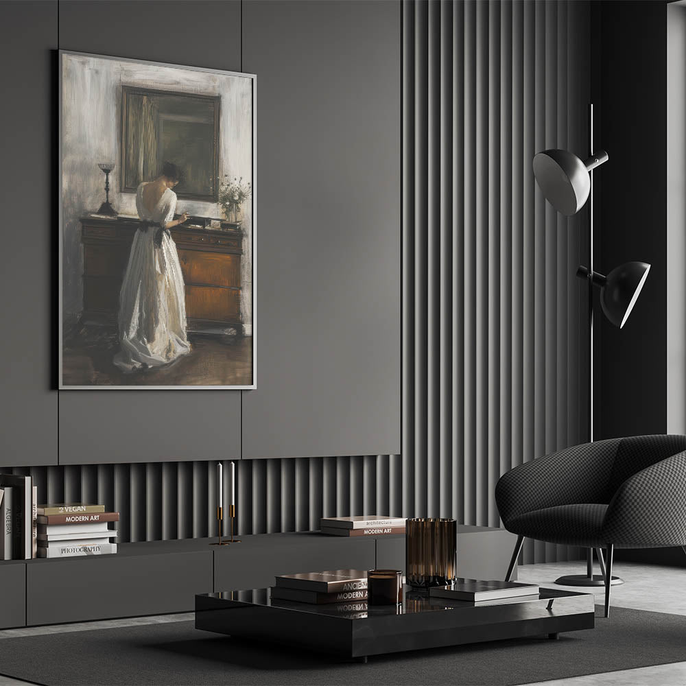 This artistic figurative wall art portrays a woman in quiet contemplation by a mirror, surrounded by timeless elegance. The interplay of soft light and shadow accentuates the flowing lines of her gown and the detailed textures of the furniture, evoking a sense of intimacy and refinement. This stunning figurative canvas print perfectly balances a modern aesthetic with a touch of vintage charm.