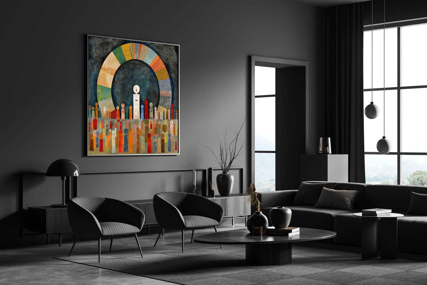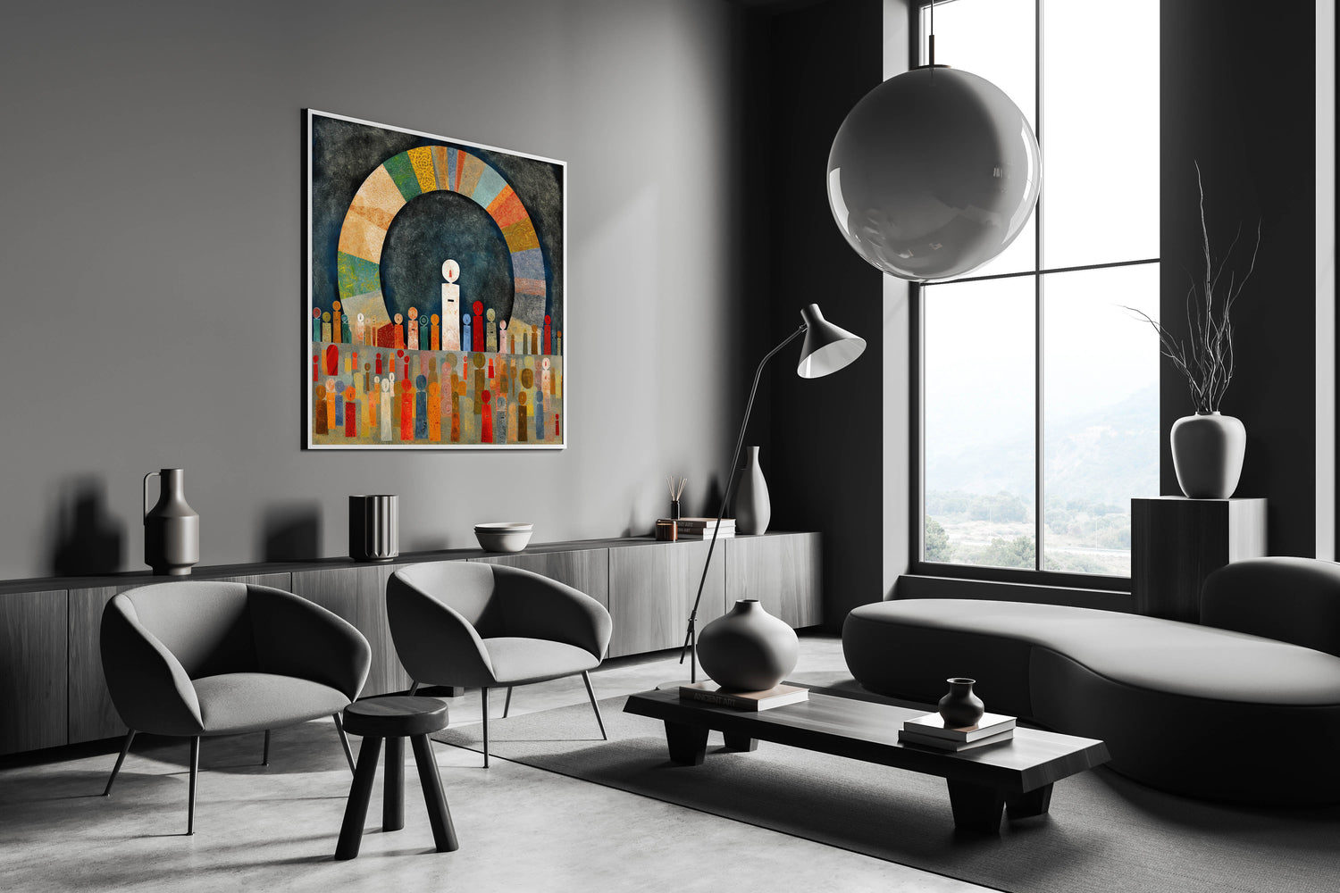 Bring a lively touch to your décor with this vibrant Colorful Abstract Figures Art. This artwork features a unique combination of geometric strokes, stylized figures, and a semi-circle design, blending diverse colors like red, orange, blue, and green against a dark textured background. The piece captures a sense of unity and movement, making it an engaging focal point for any room.
