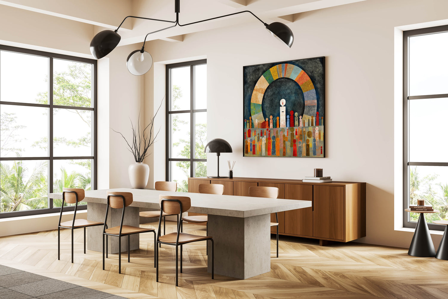 This artwork’s striking use of abstract figures and bold colors makes it a versatile and unique piece. It is perfect for those who appreciate contemporary art that tells a story through vibrant design and expressive line work.