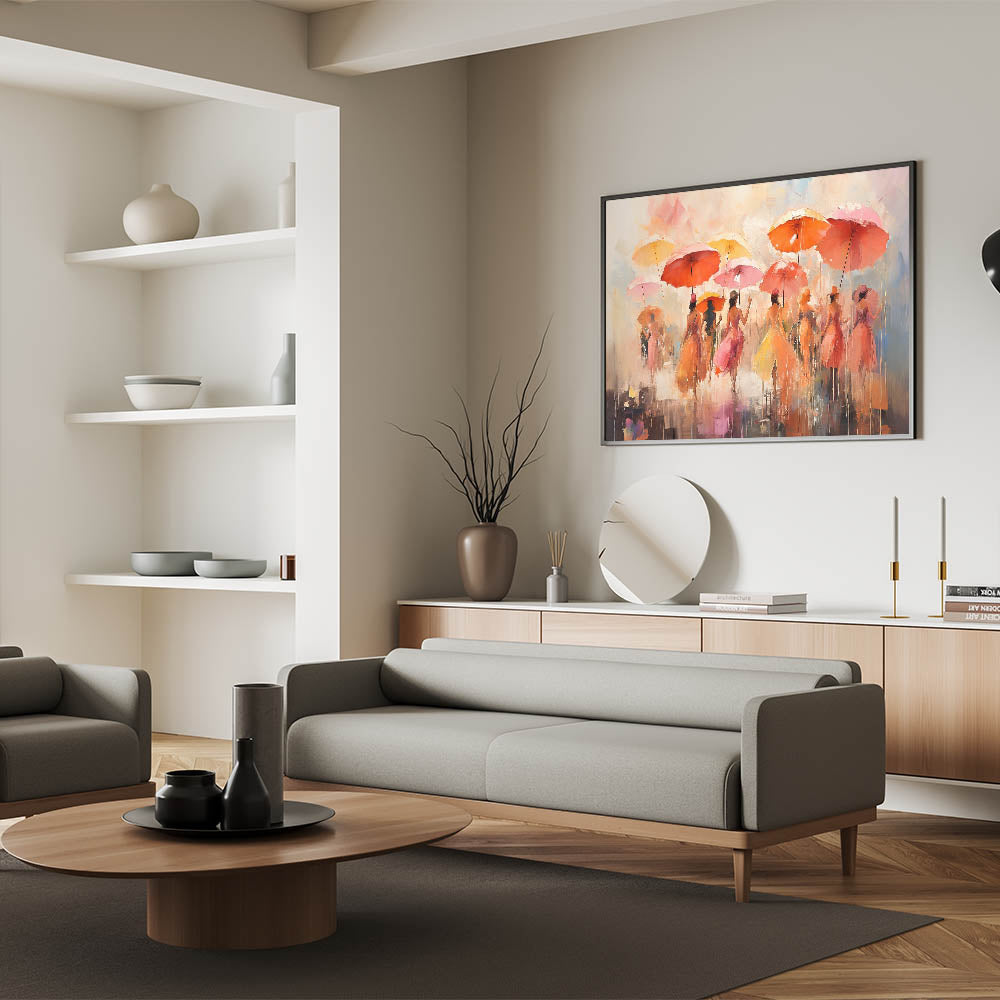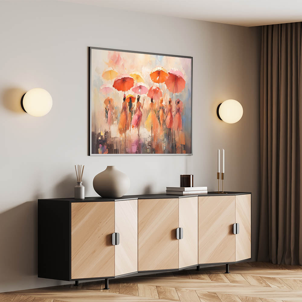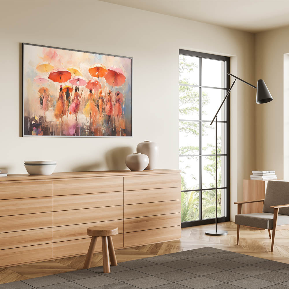 Brighten up your home decor with our "Colorful Figurative Abstract Wall Art - Women with Umbrellas Canvas." This vibrant artwork captures a group of women holding colorful umbrellas, rendered in dynamic, flowing strokes. The warm hues of oranges, pinks, and yellows create a lively and cheerful scene, perfect for adding a splash of color and energy to any room.