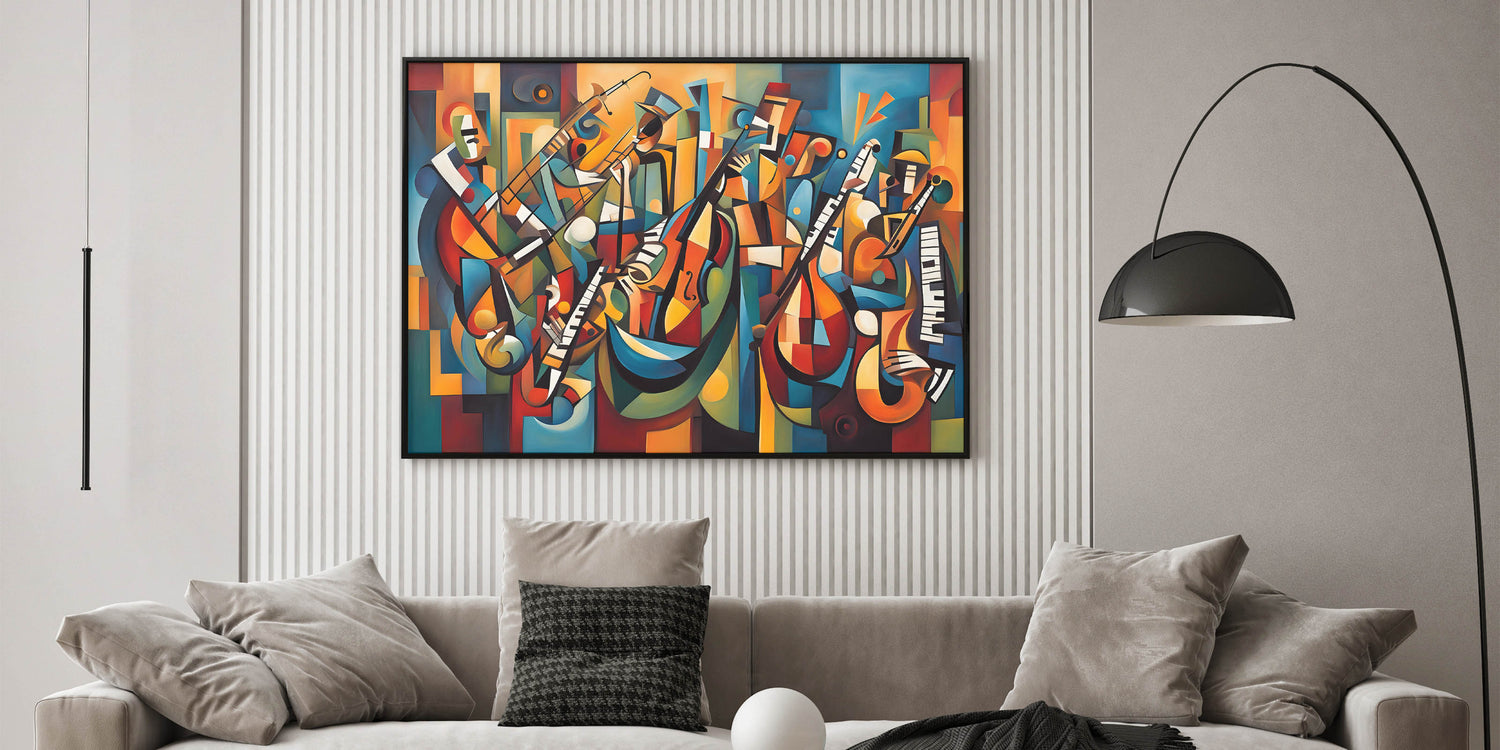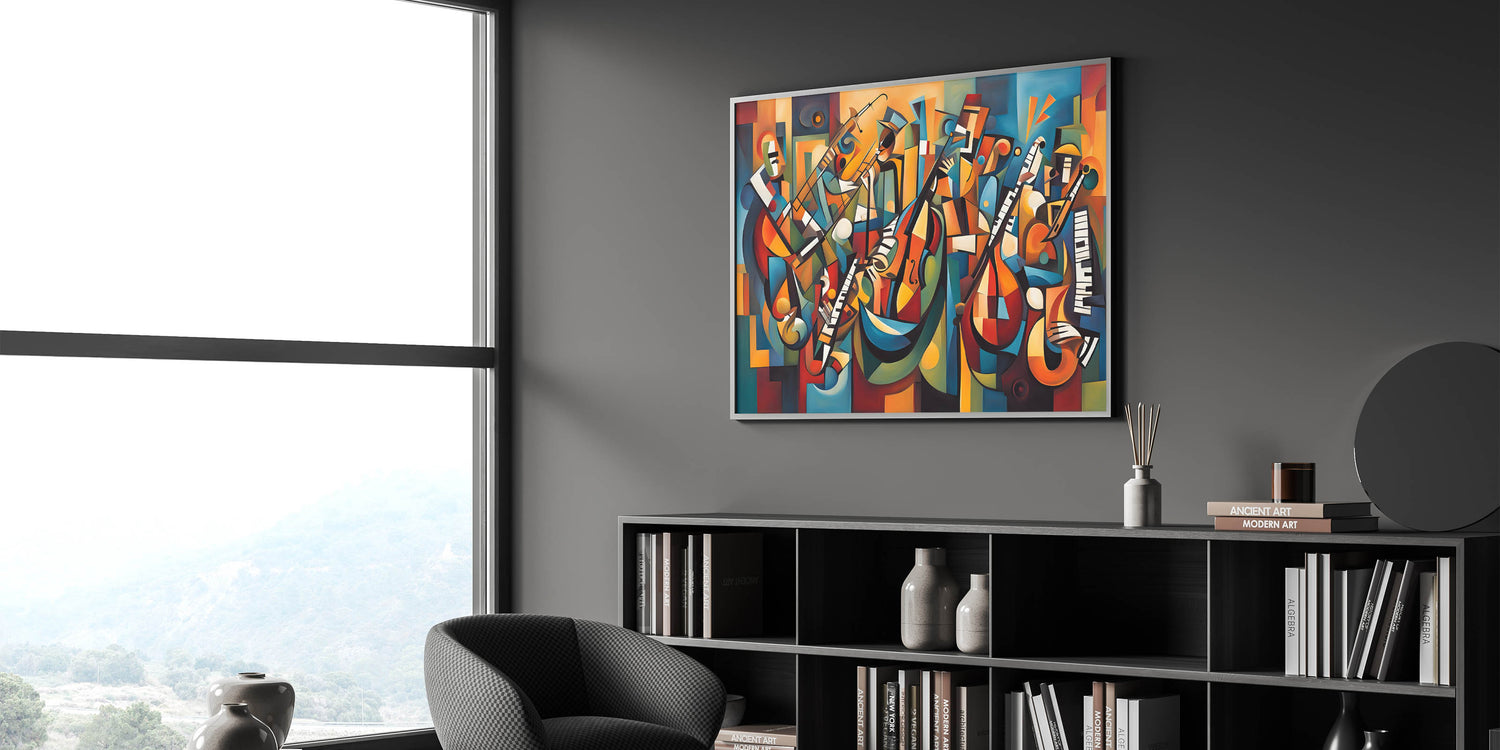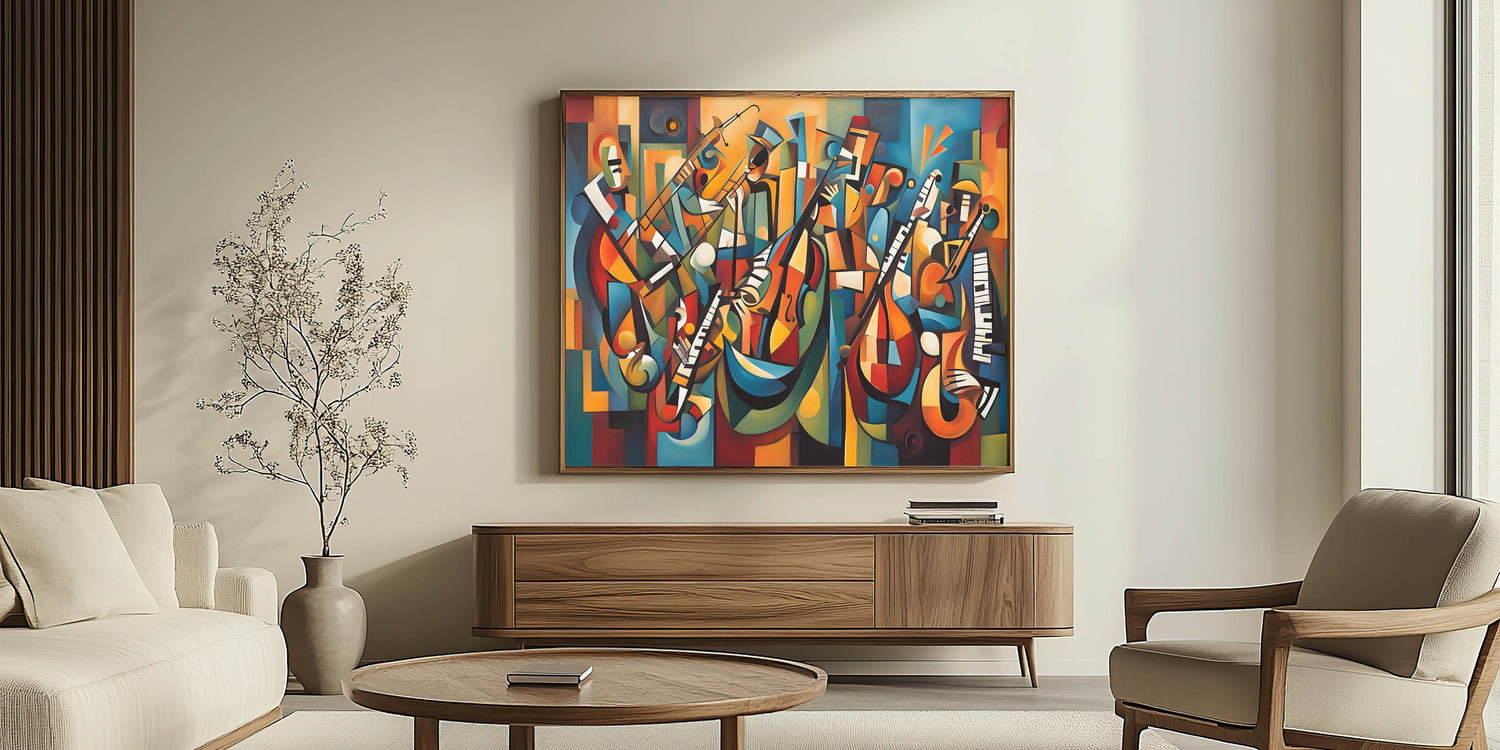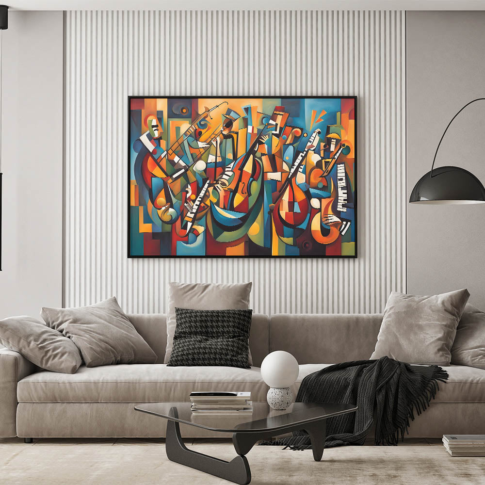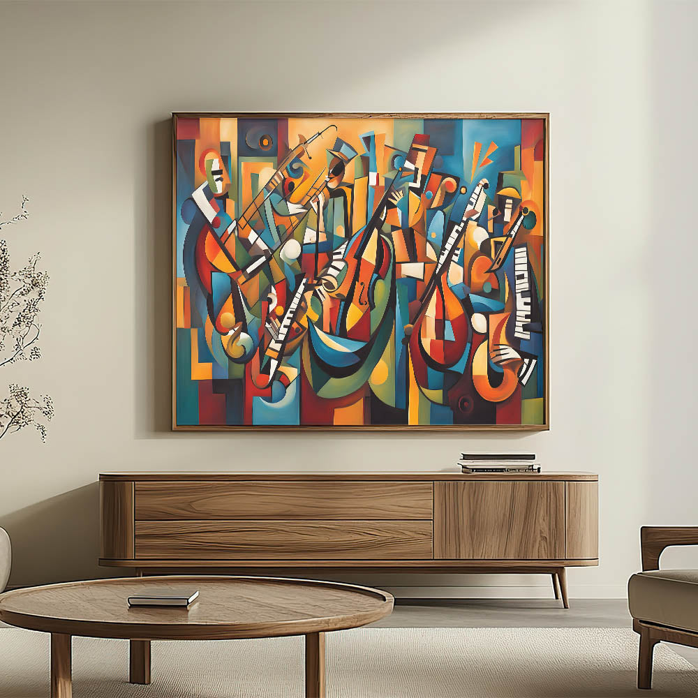 Elevate your home decor with our "Colorful Geometric Figurative Abstract Wall Art - Musical Ensemble Canvas." This vibrant artwork features an abstract representation of a musical ensemble, rendered in a striking geometric style. The rich and varied color palette of reds, blues, yellows, and greens brings energy and excitement, making it a perfect piece for music lovers and art enthusiasts alike.