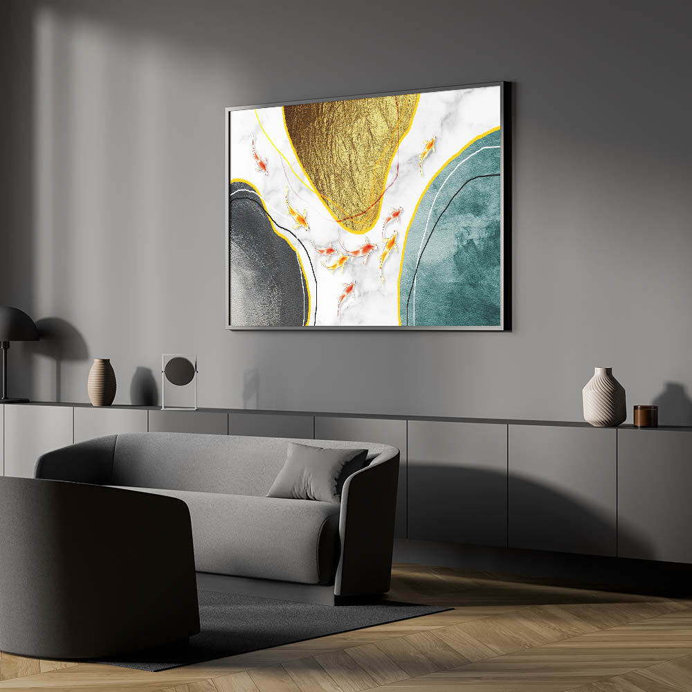 Introduce a splash of vibrant color and dynamic design into your space with this "Colorful Koi Fish and Abstract Strokes" wall art. This modern piece features an intricate blend of graceful koi fish swimming amidst bold abstract strokes and lines, evoking a sense of movement and fluidity. The striking combination of gold, teal, and black textures creates a captivating contrast that will enhance any room.