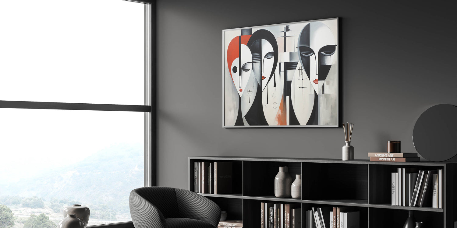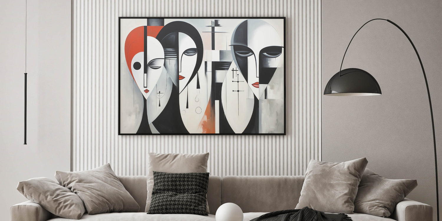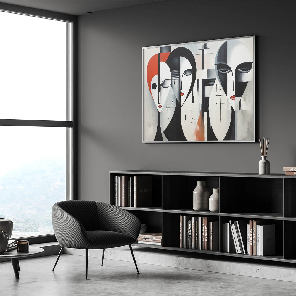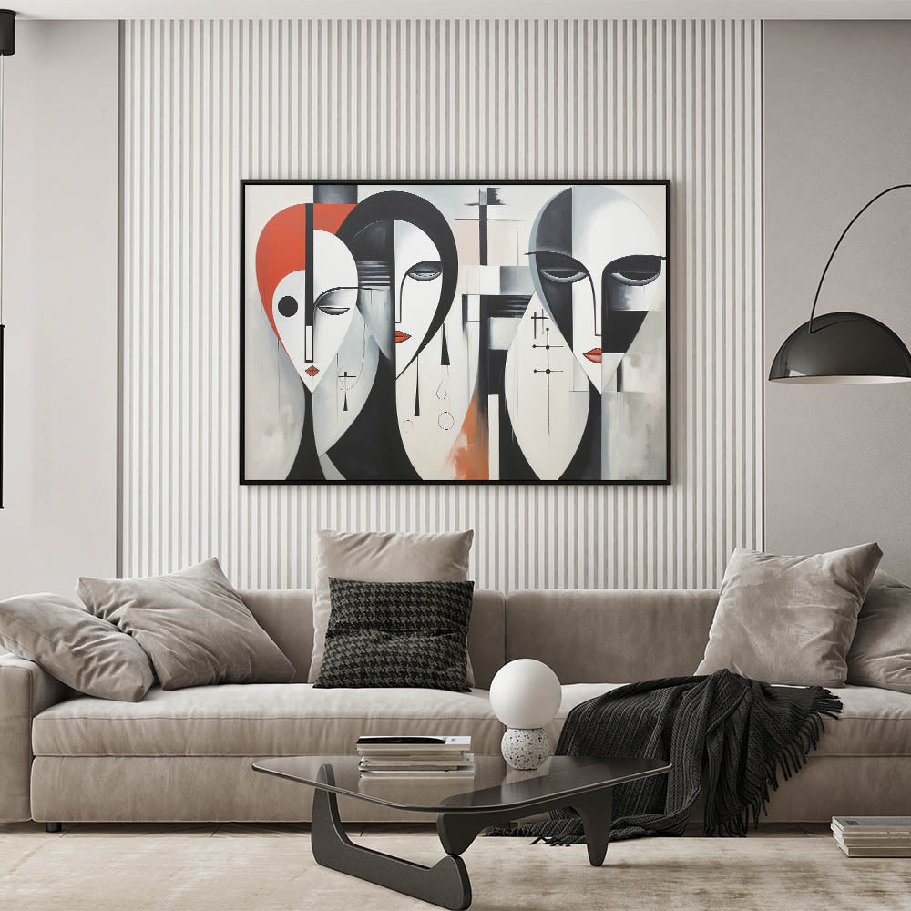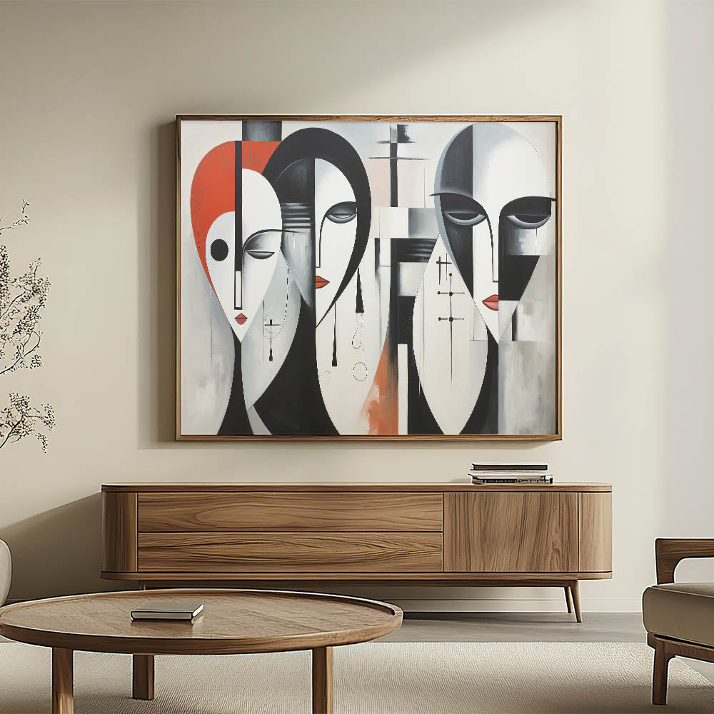 Introduce a modern and bold piece to your decor with our "Contemporary Abstract Figurative Wall Art - Geometric Faces Canvas." This eye-catching artwork features three abstract faces rendered in a geometric style with a striking color palette of black, white, and red. The combination of sharp lines and smooth curves creates a powerful visual impact, making it a perfect addition to contemporary and modern interiors.
