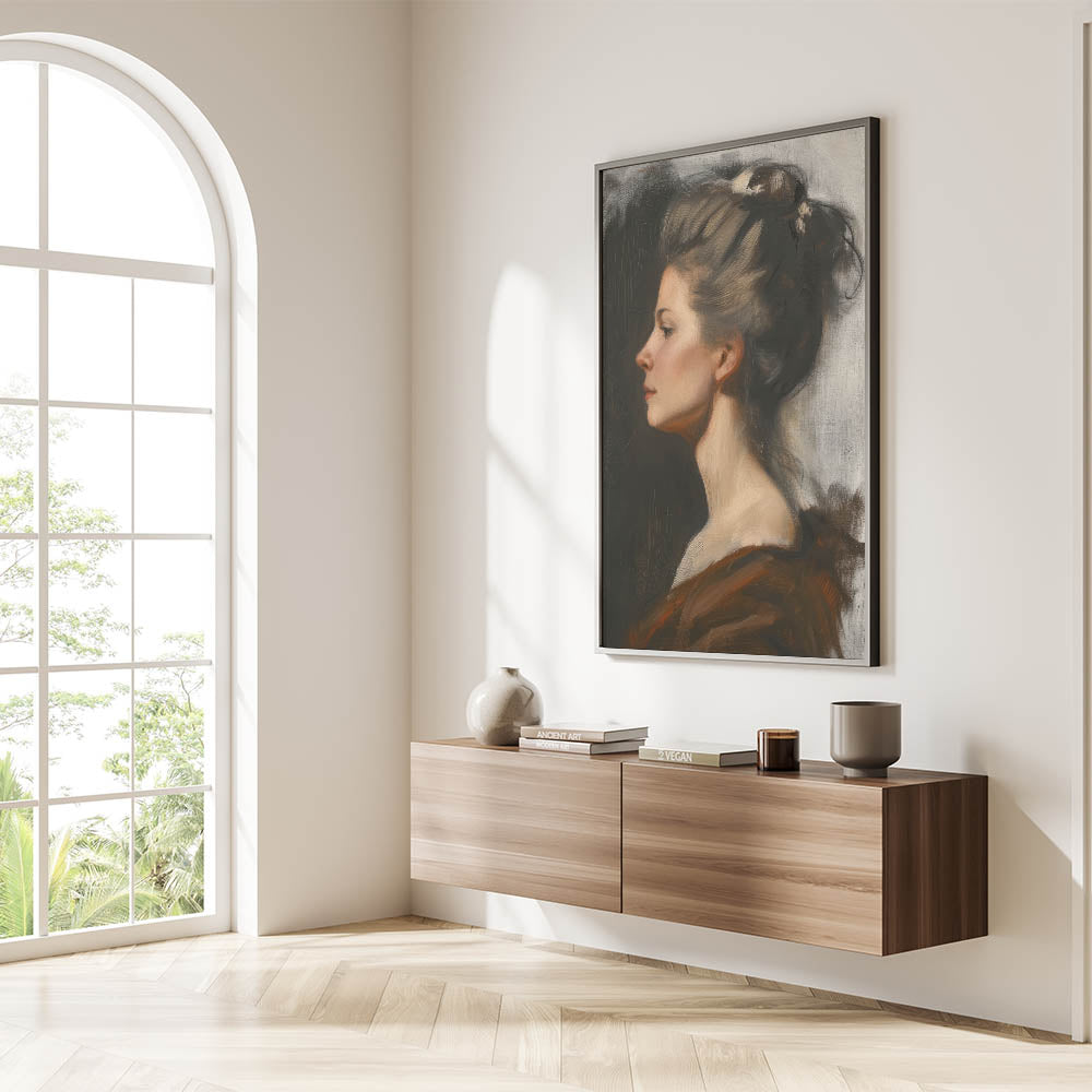 Enhance your decor with this contemporary figurative art, featuring a refined portrait of a woman painted in elegant, detailed brushstrokes. This striking side-profile composition highlights subtle nuances in expression and a harmonious balance of light and shadow, creating an artwork that radiates sophistication.