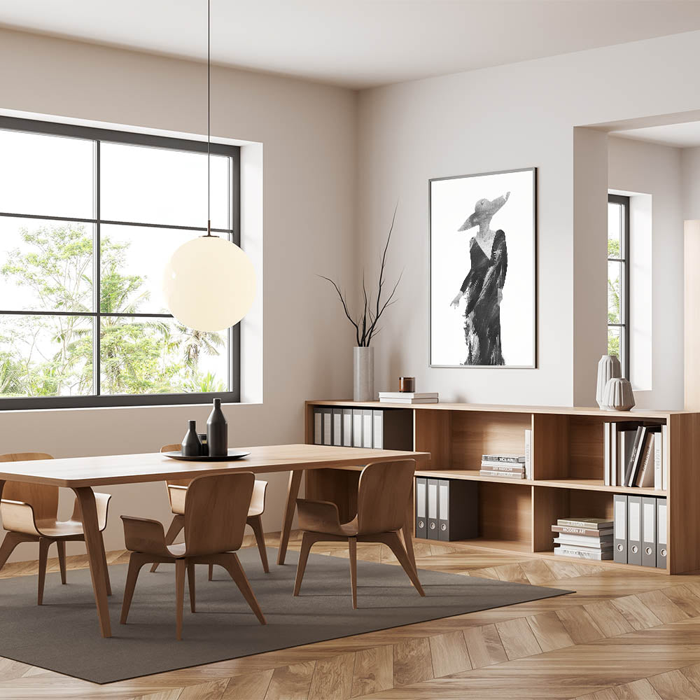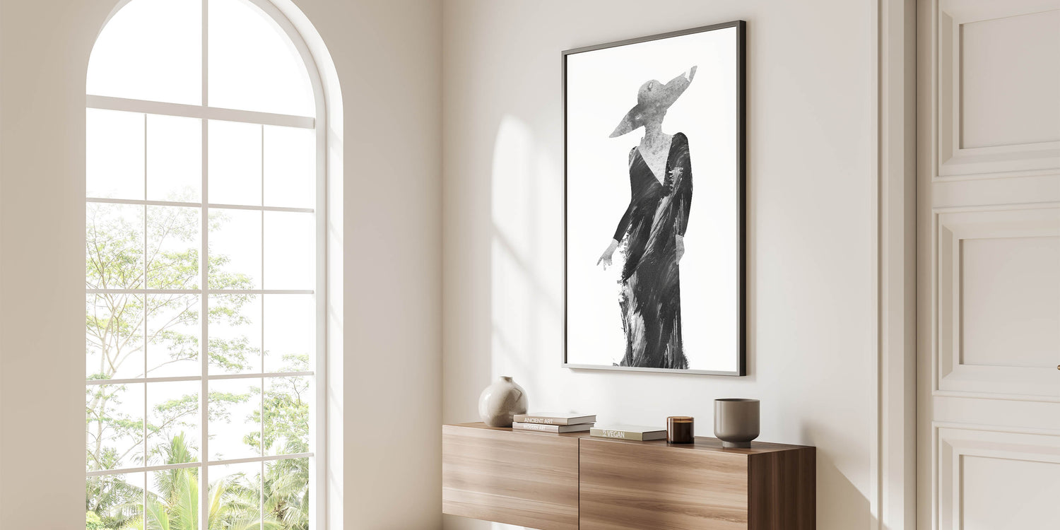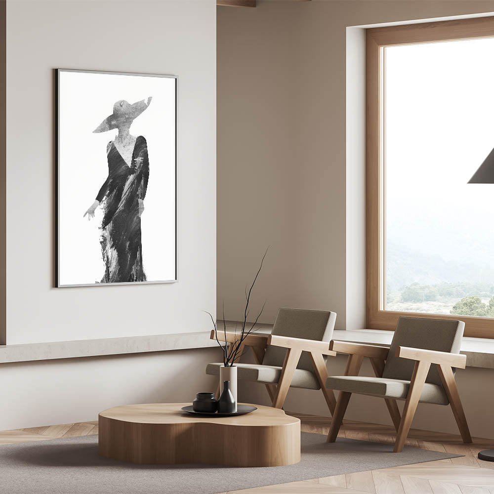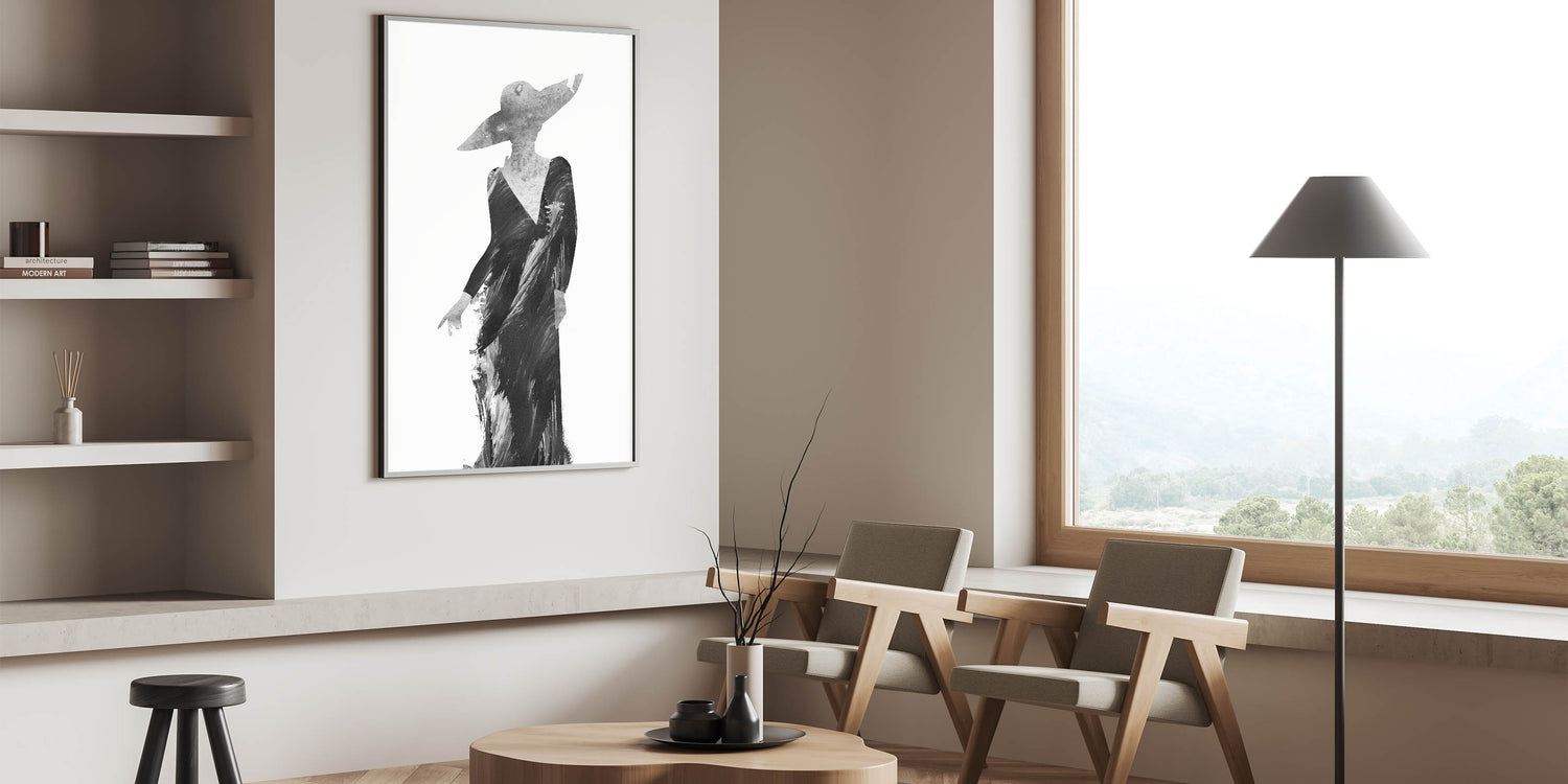 Discover the elegance of minimalism with this Contemporary Figurative Print, a sophisticated blend of abstract human form and monochromatic artistry. This artwork features a stylish silhouette in a flowing black gown, highlighted by textured brushstrokes that evoke grace and movement. The wide-brimmed hat adds a touch of mystery and refinement, making this piece a standout addition to modern interiors.