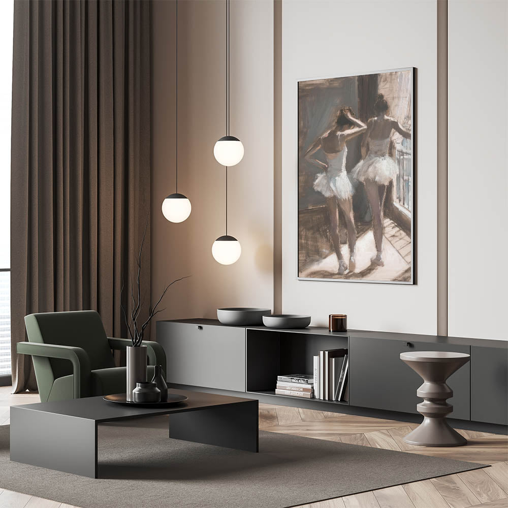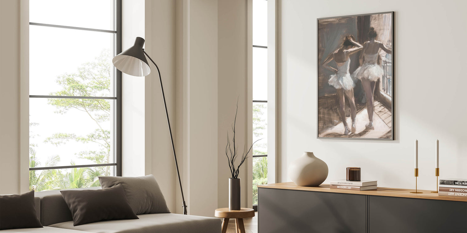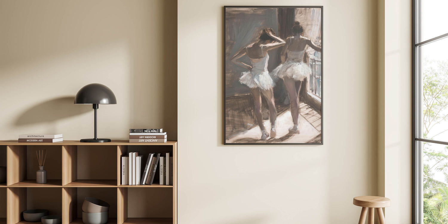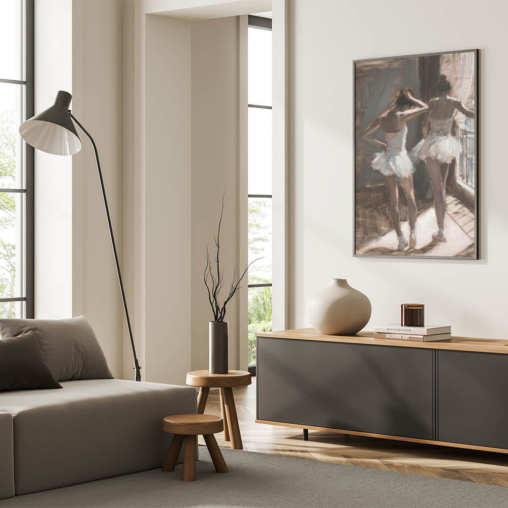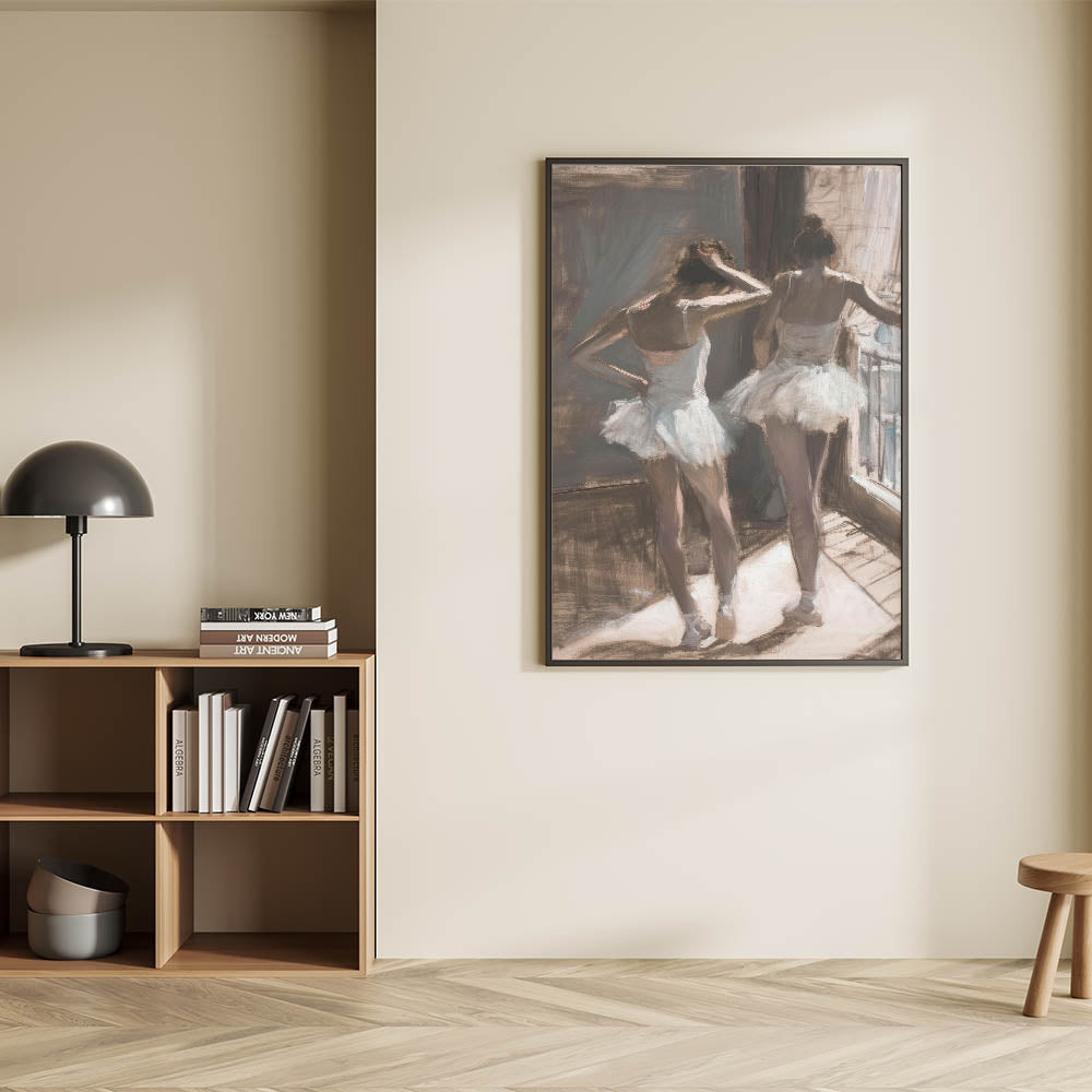 This contemporary figurative wall art captures the beauty of two ballet dancers basking in soft, natural light. With expressive brushstrokes and warm tones, the piece highlights the grace and poise of the dancers as they prepare for their performance. The interplay of light and shadow creates a captivating ambiance, making this artwork a stunning focal point for any room.