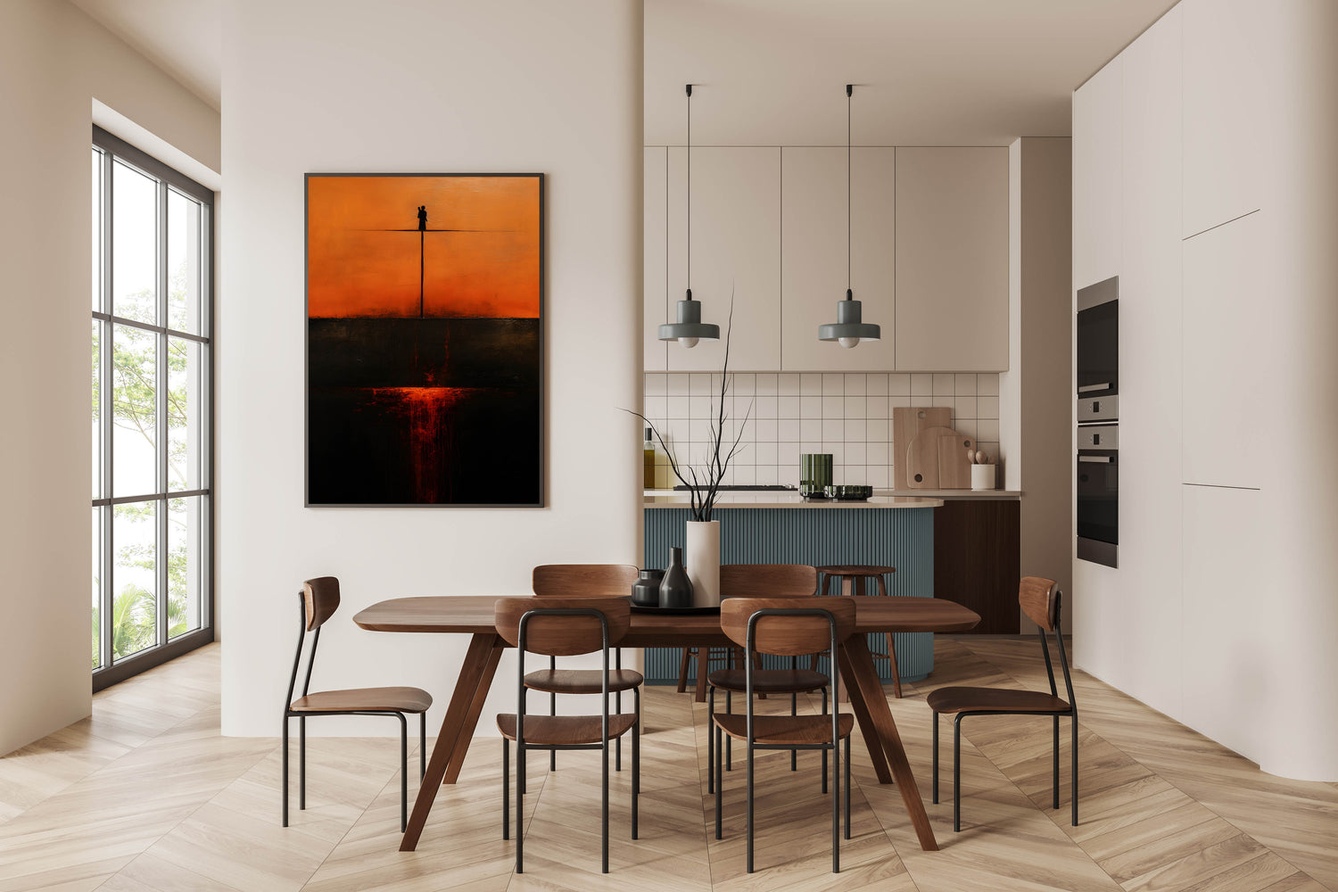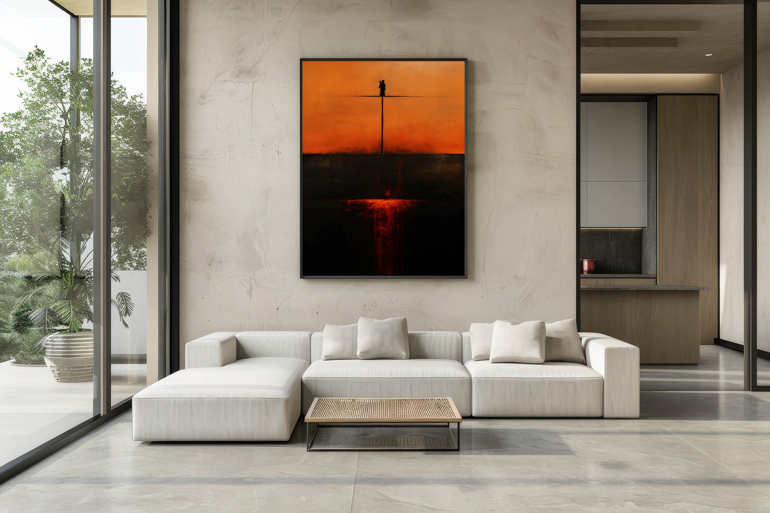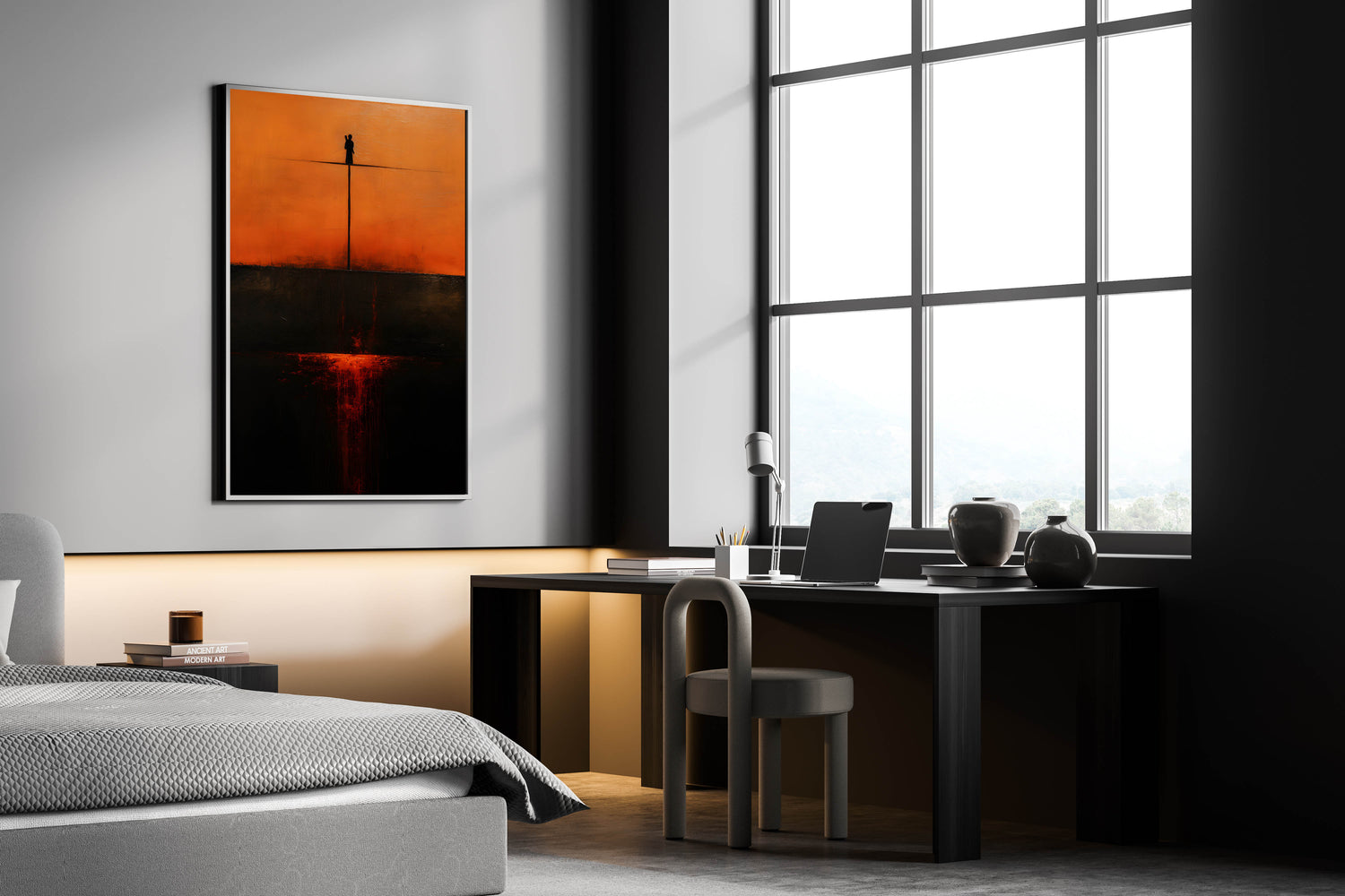 Infuse intensity and drama into your space with this striking abstract wall art featuring bold fiery orange and deep black tones. The central figure standing at the edge brings an evocative touch, while the rich colors and vertical composition add depth and mystery. This piece is ideal for modern and eclectic spaces, adding warmth and intrigue to any room.