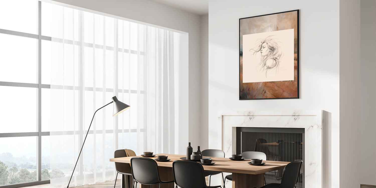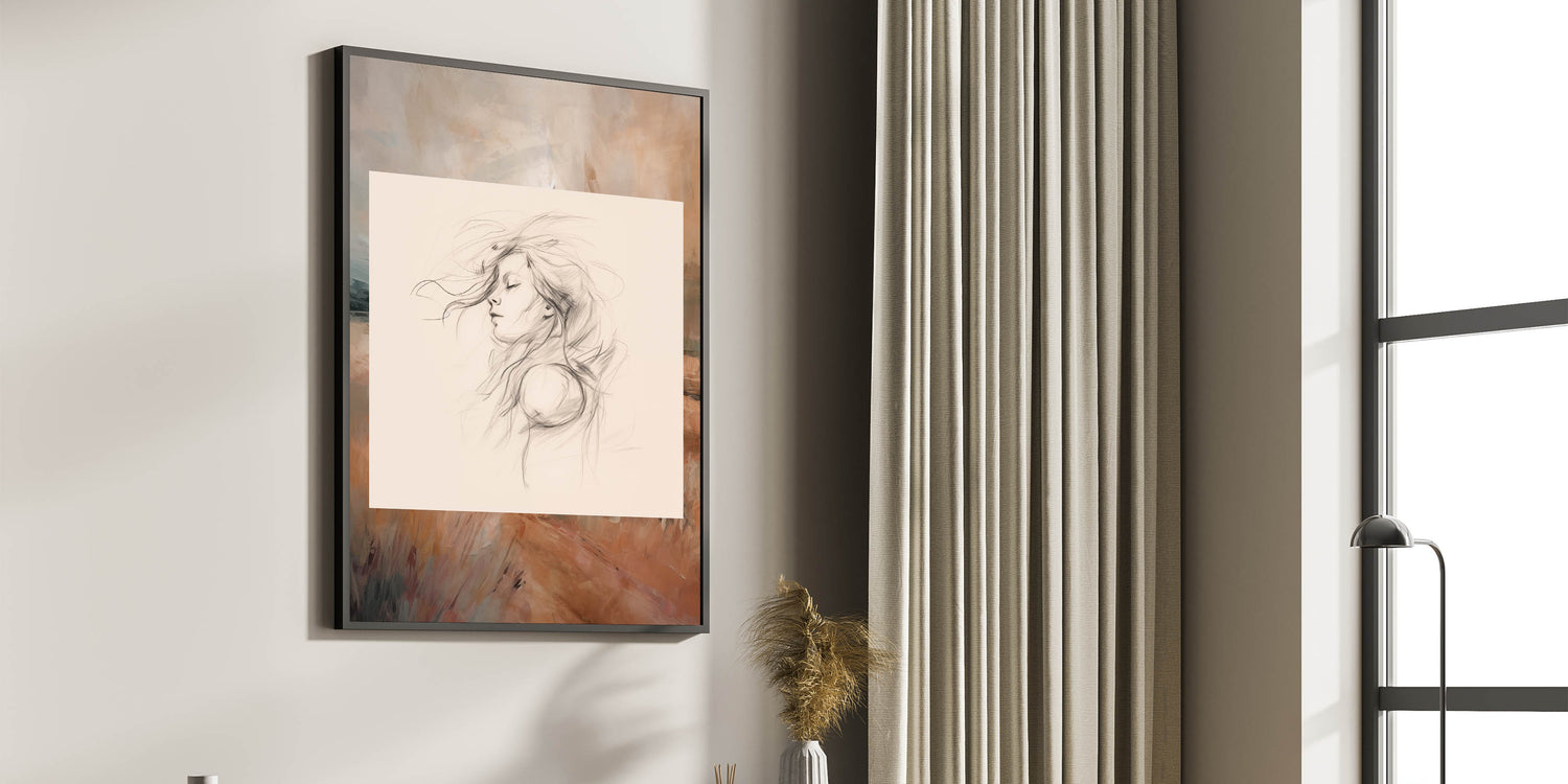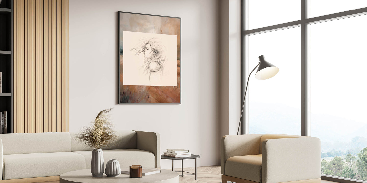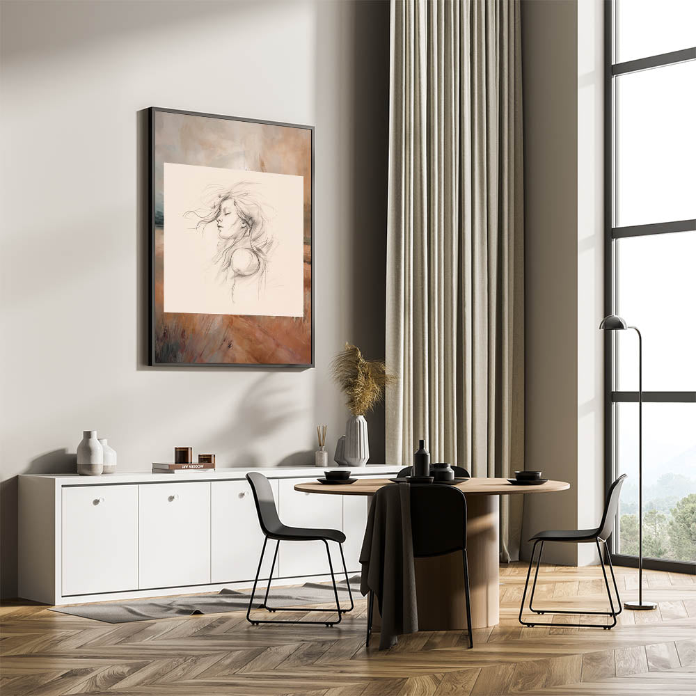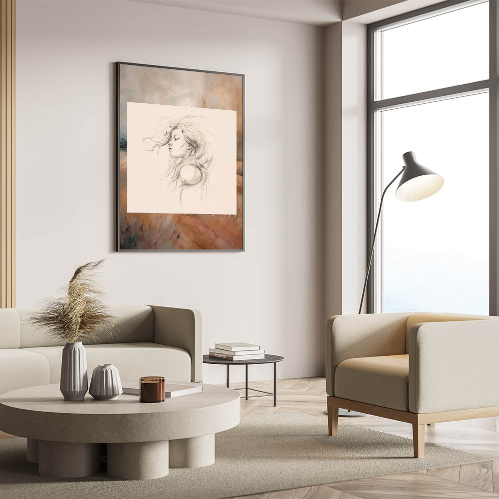 This dreamy minimalist portrait combines the beauty of a delicate line drawing with the serenity of an abstract landscape. Featuring a softly sketched female figure in the center, surrounded by a tranquil nature-inspired background, this piece captures a harmonious blend of human form and nature. The warm earthy tones and refined lines create a calming atmosphere, making it an ideal addition to contemporary or modern interiors.