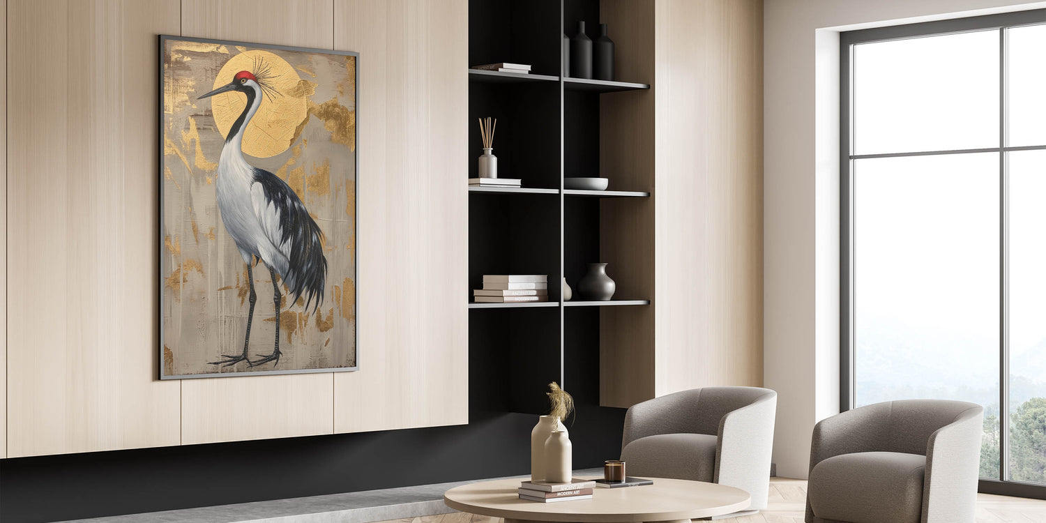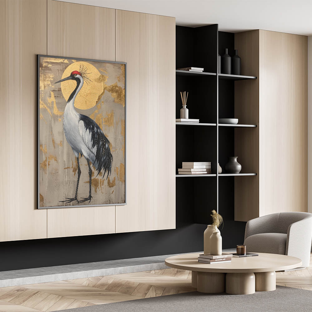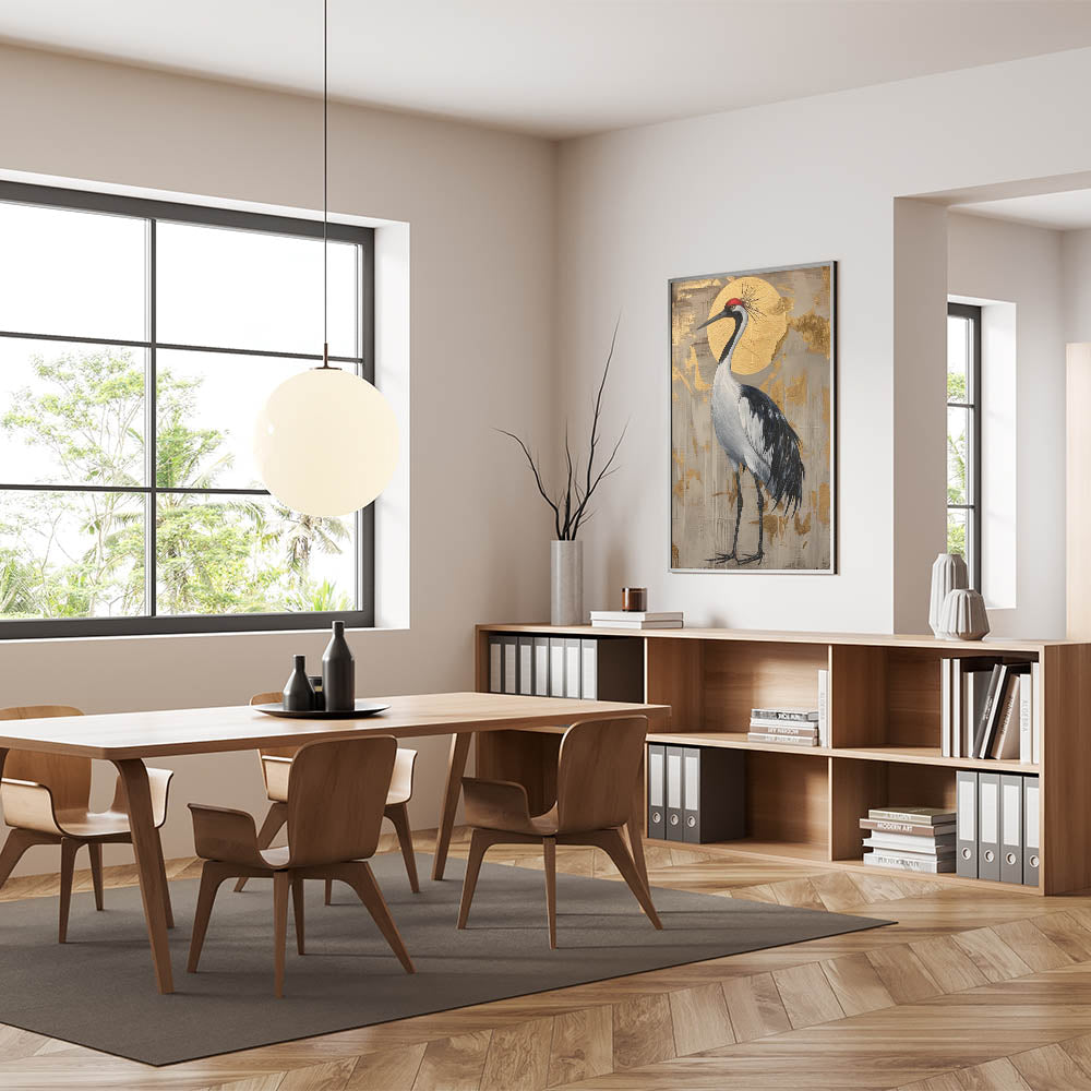 This crane artwork is ideal for art enthusiasts who appreciate nature-inspired pieces with a luxurious touch. Its unique composition and sophisticated color palette make it a timeless addition that adds warmth and elegance to any space.