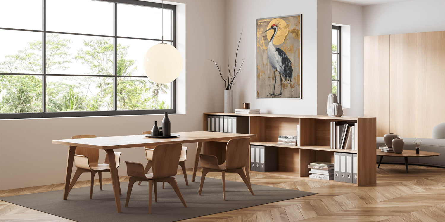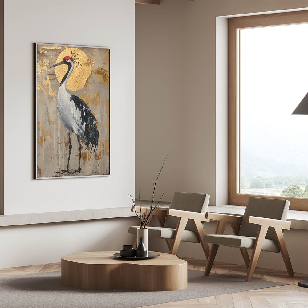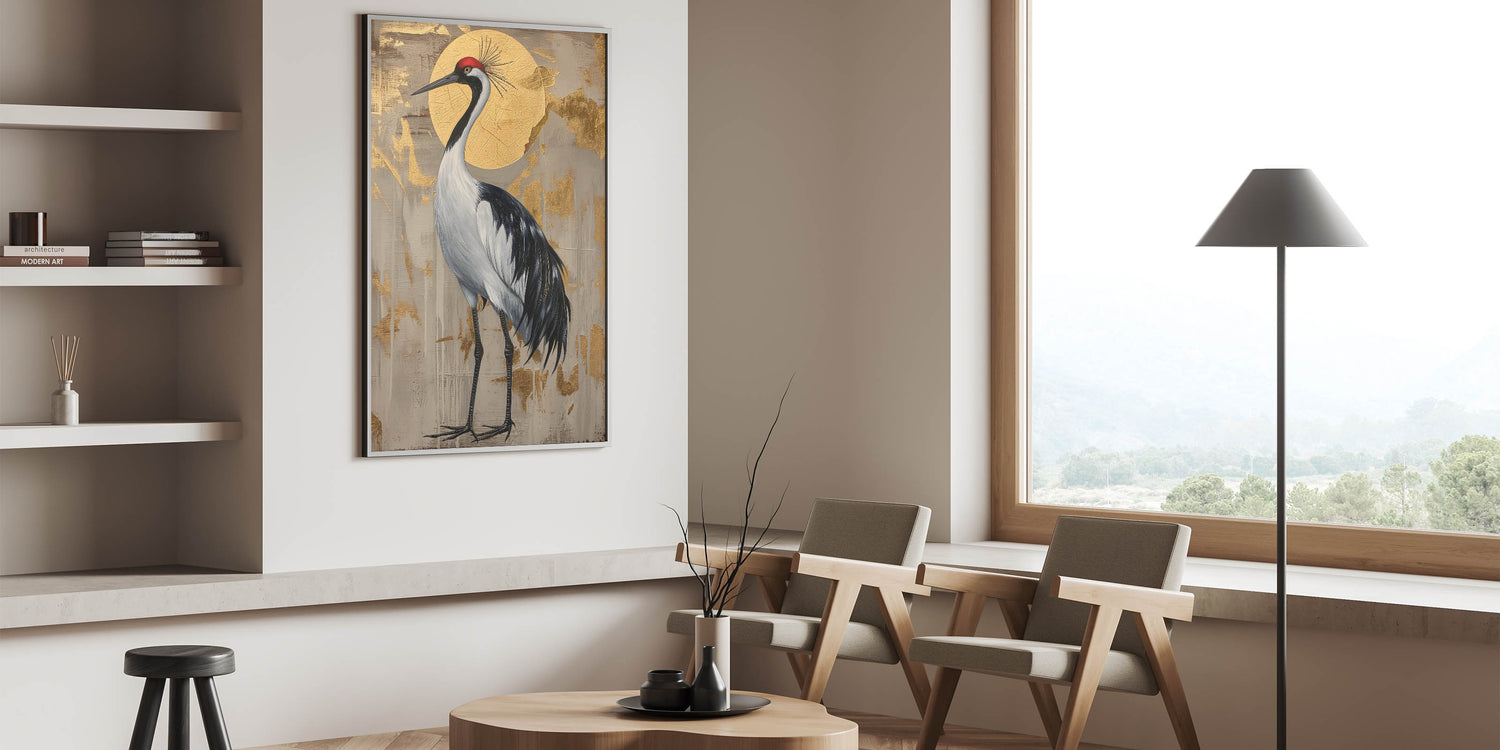 This crane artwork is ideal for art enthusiasts who appreciate nature-inspired pieces with a luxurious touch. Its unique composition and sophisticated color palette make it a timeless addition that adds warmth and elegance to any space.