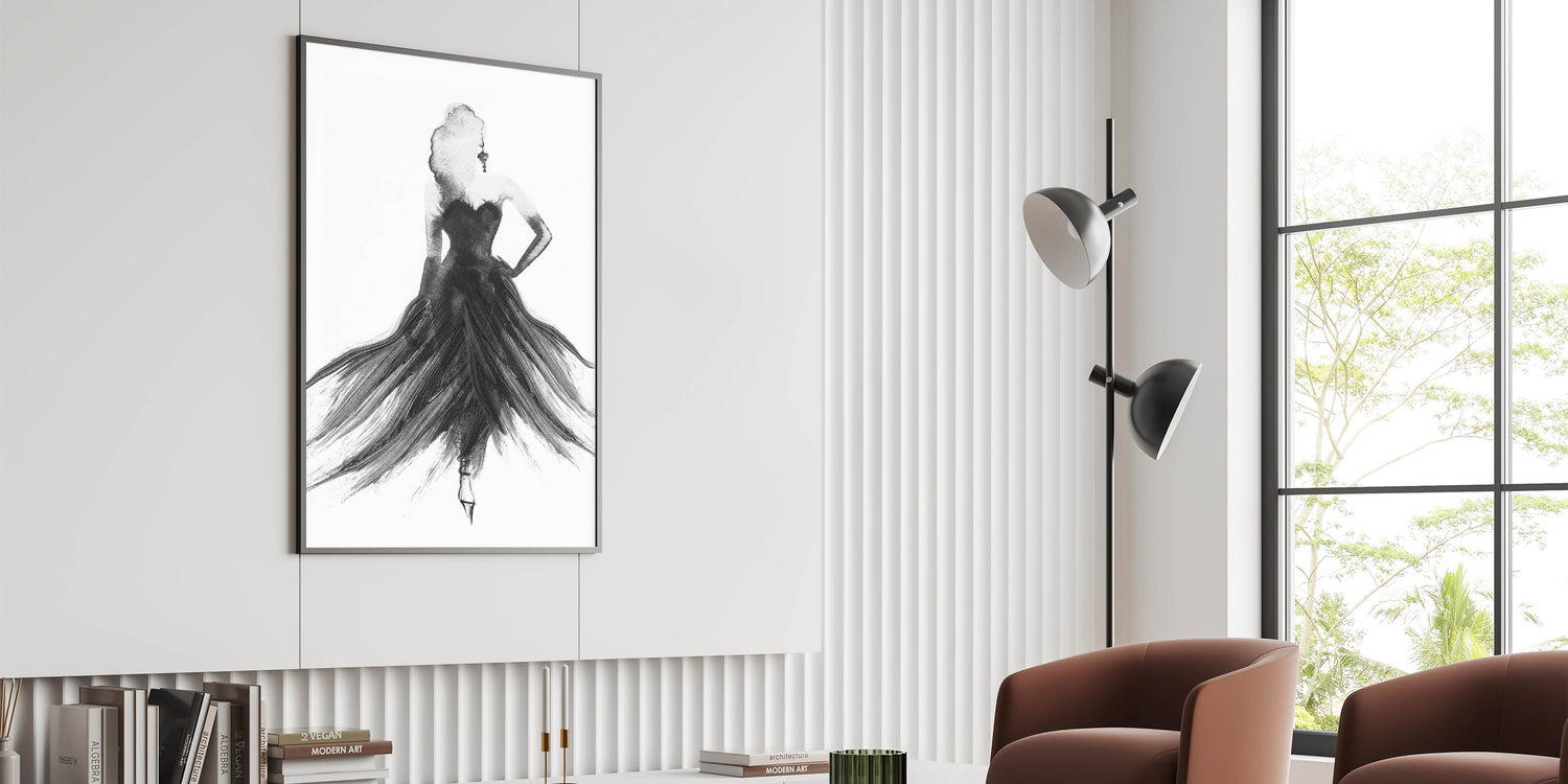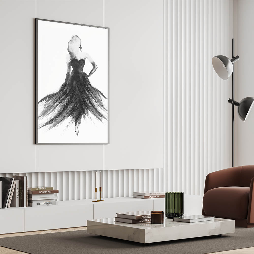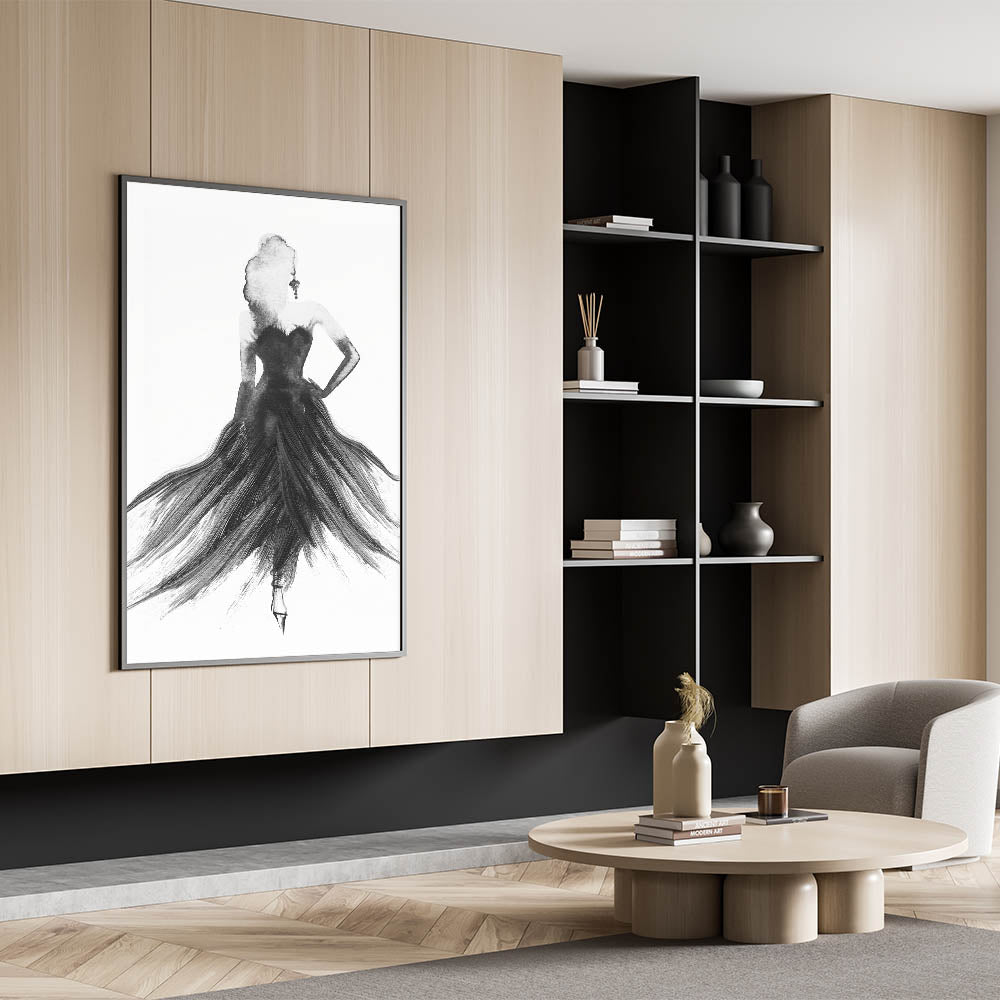 Indulge in timeless sophistication with this Elegant Figurative Canvas Art, a stunning black-and-white design that radiates high fashion and elegance. This artwork features a poised figure in a flowing black gown, with sweeping brushstrokes adding a sense of movement and grace. The intricate detailing of the dress and the minimalist white background create a perfect balance of drama and simplicity.