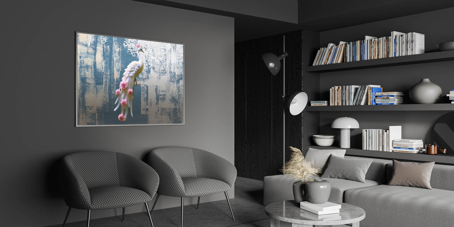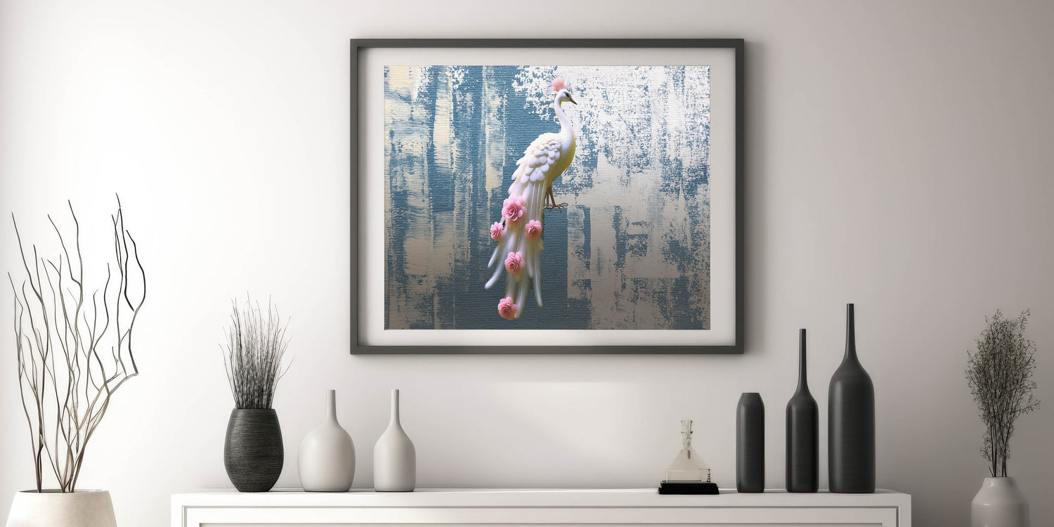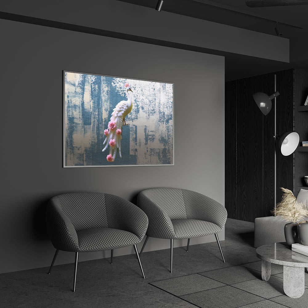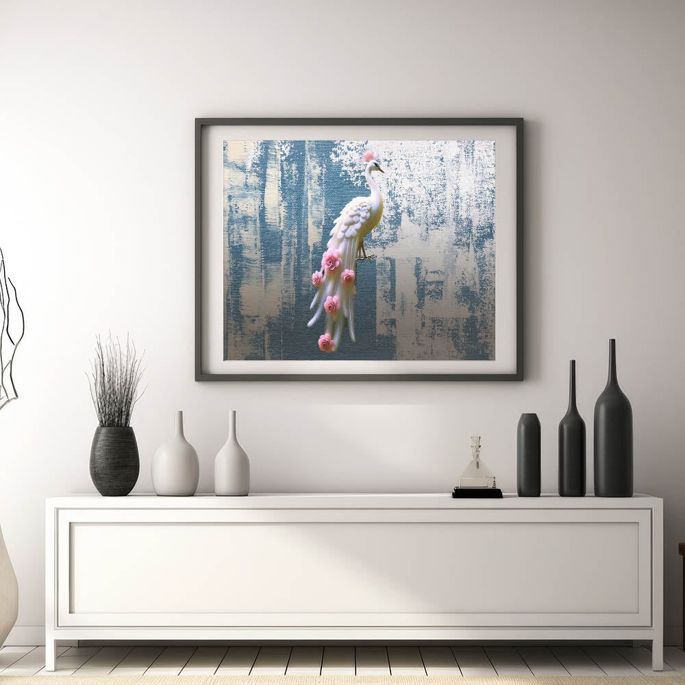 Transform your space with the elegance and beauty of this stunning artwork featuring a graceful white peacock adorned with delicate pink roses. Set against a textured blue abstract background, this piece blends nature's charm with modern artistic flair. The intricate details of the peacock and roses create a captivating focal point, making this art piece perfect for adding a touch of luxury and sophistication to any room.