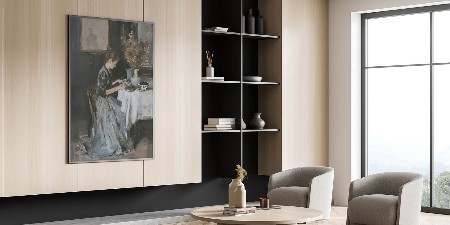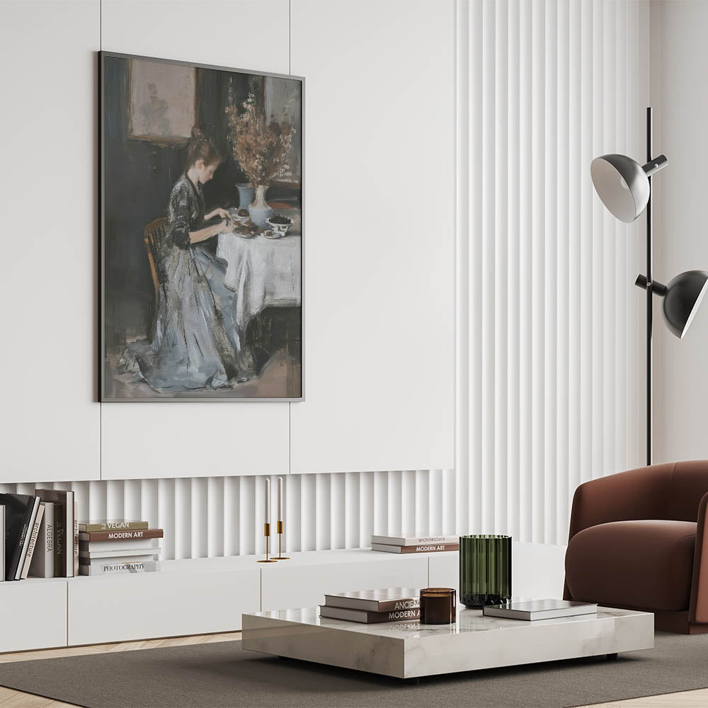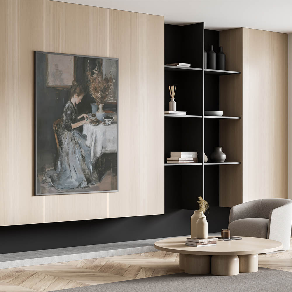 Bring sophistication and timeless charm to your space with this stunning figurative abstract canvas. Featuring a woman seated at a table, engrossed in a quiet moment of thought, this artwork conveys a sense of peace and introspection. The soft brushstrokes and muted tones of gray, black, and earthy accents add depth and elegance, making it an ideal centerpiece for contemporary and classic interiors alike.