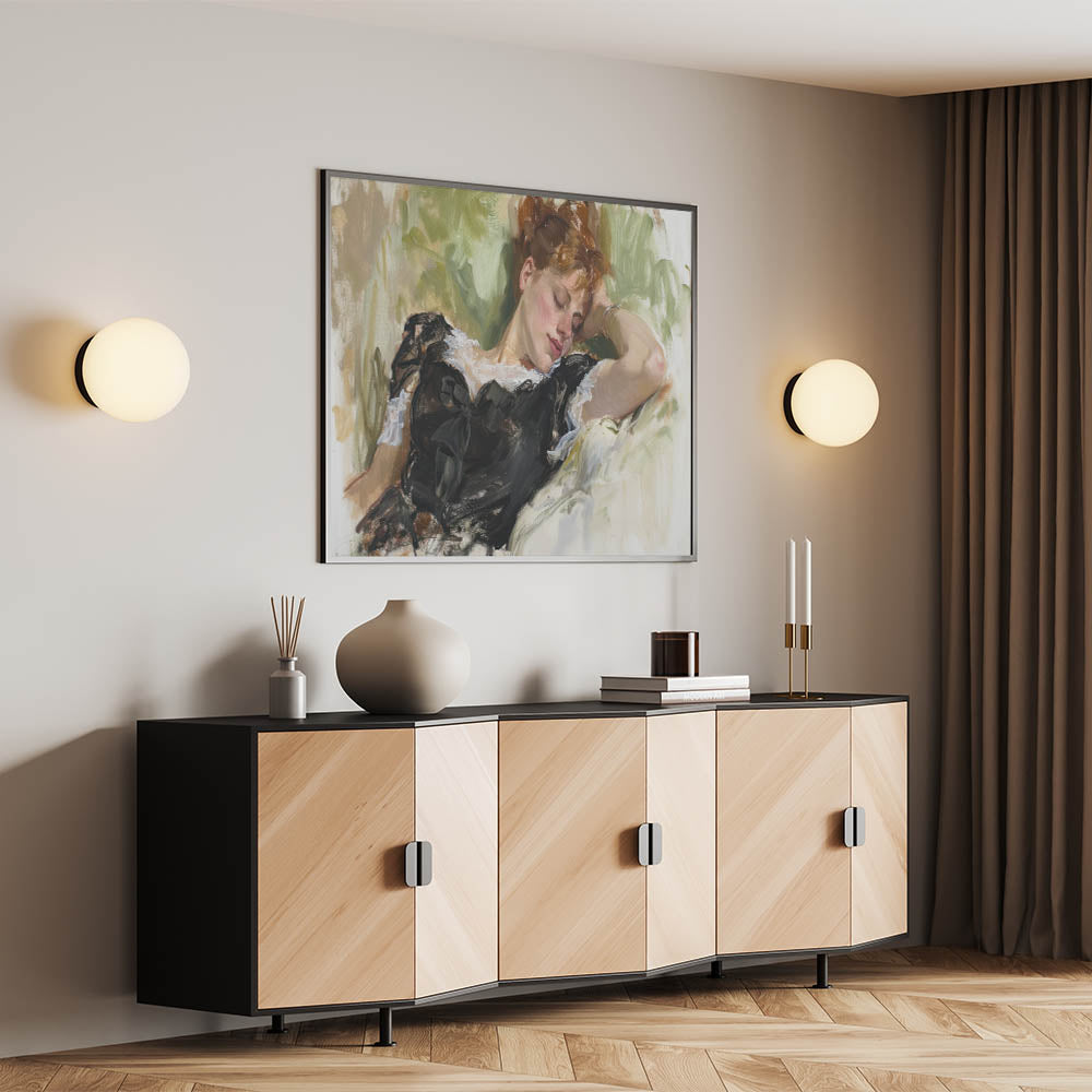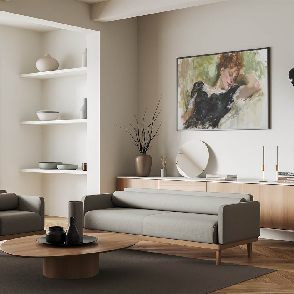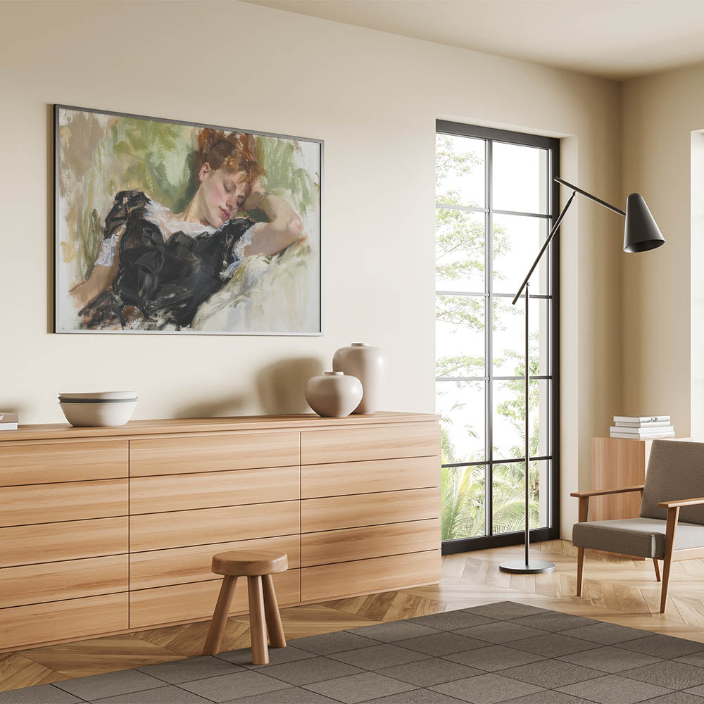 Add a touch of grace and serenity to your living space with this exquisite figurative wall art. Featuring a reclining woman surrounded by soft, natural hues, this painting captures a moment of peaceful repose. The intricate detailing of her black dress, complemented by the lush green background, exudes elegance and tranquility, making this artwork a timeless piece for any setting.