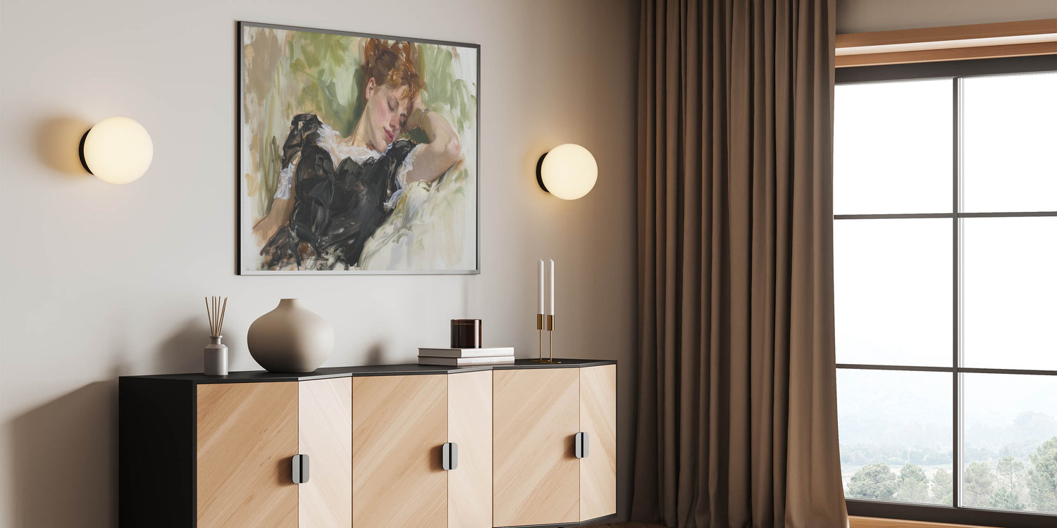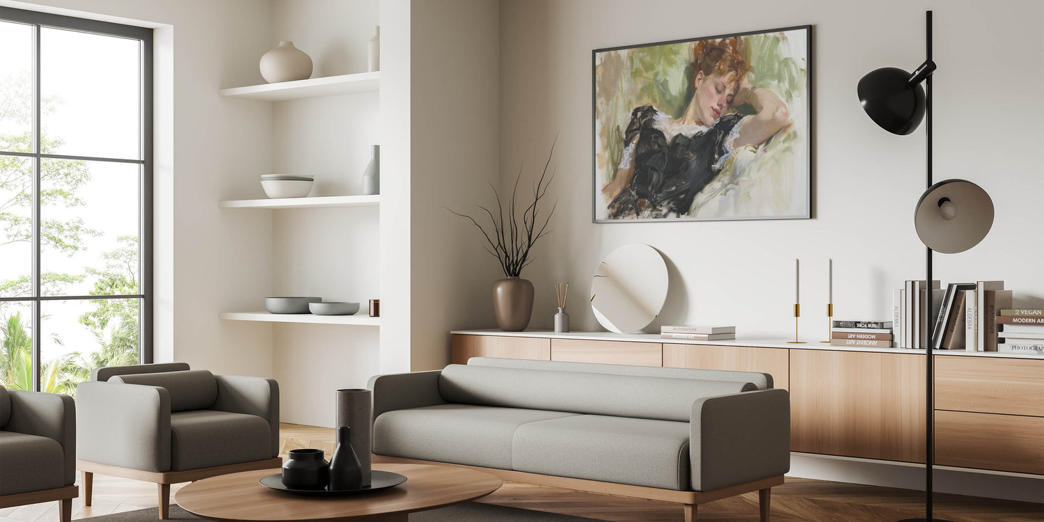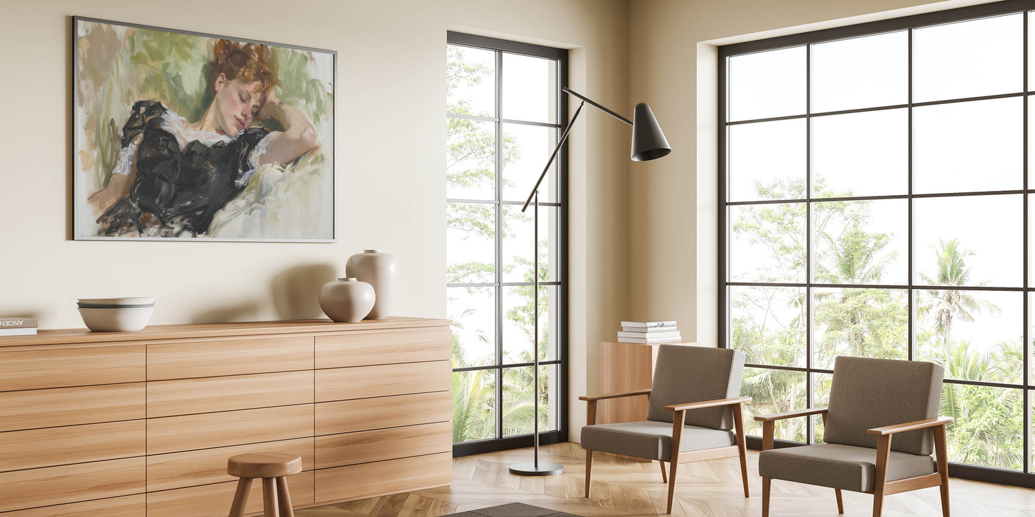 Add a touch of grace and serenity to your living space with this exquisite figurative wall art. Featuring a reclining woman surrounded by soft, natural hues, this painting captures a moment of peaceful repose. The intricate detailing of her black dress, complemented by the lush green background, exudes elegance and tranquility, making this artwork a timeless piece for any setting.