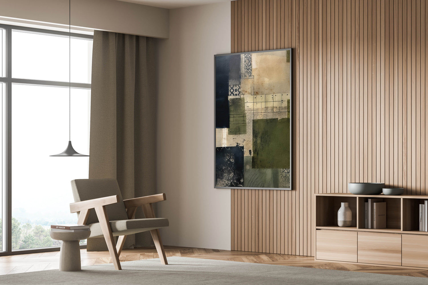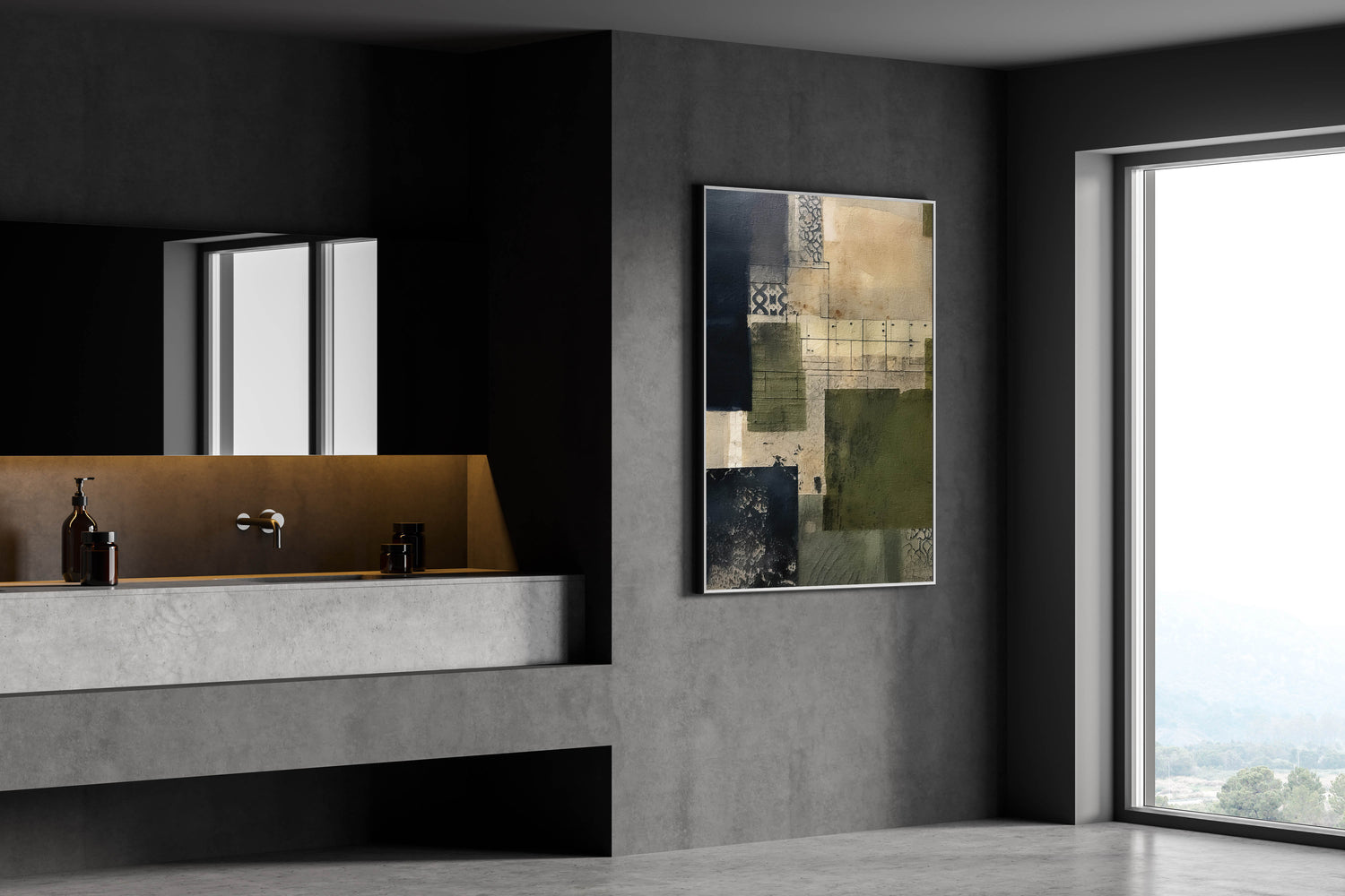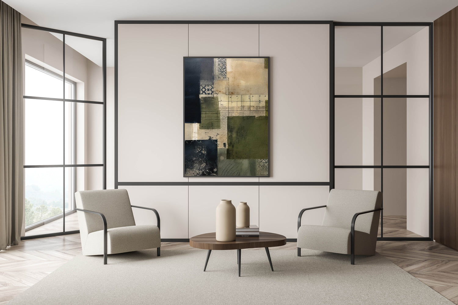 Enhance your space with this sophisticated Geometric Abstract Line Art. The design features a striking blend of dark green, black, and beige, creating a visually captivating piece with a modern edge. The layered textures and intricate patterns add depth, while the neutral and earthy tones bring a touch of rustic elegance. Ideal for those looking to elevate their decor with a unique and contemporary artwork.