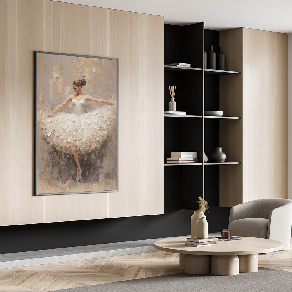 This stunning artwork captures the beauty and elegance of a ballerina in a classic pose, rendered in a textured abstract style. The dancer’s delicate form and flowing tutu are painted in soft beige and white tones, creating a serene and timeless visual. The textured brushstrokes add depth and movement to the piece, making it a captivating addition to any space. This artwork is perfect for those who appreciate the artistry of dance and the sophistication of abstract design.
