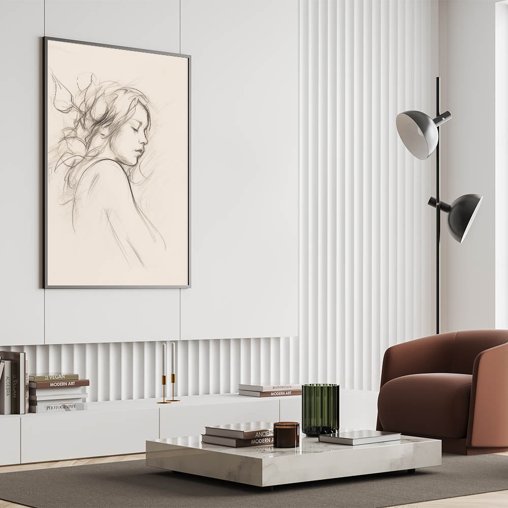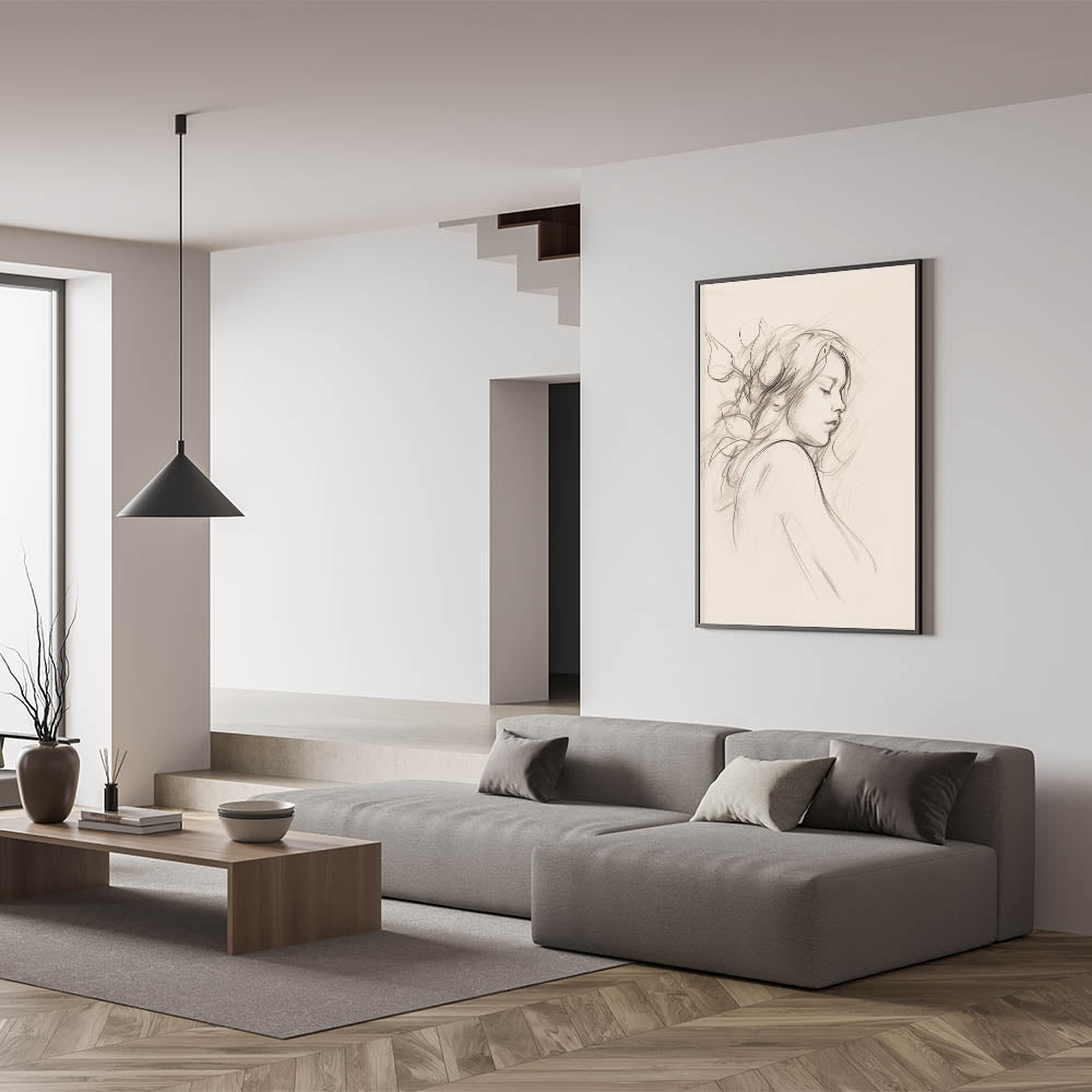 Add a touch of serene elegance to your home with this exquisite piece of minimalist abstract art, featuring a delicate sketch of a woman adorned with leaves. The flowing lines and gentle shading create a tranquil and sophisticated atmosphere, perfect for any modern interior.