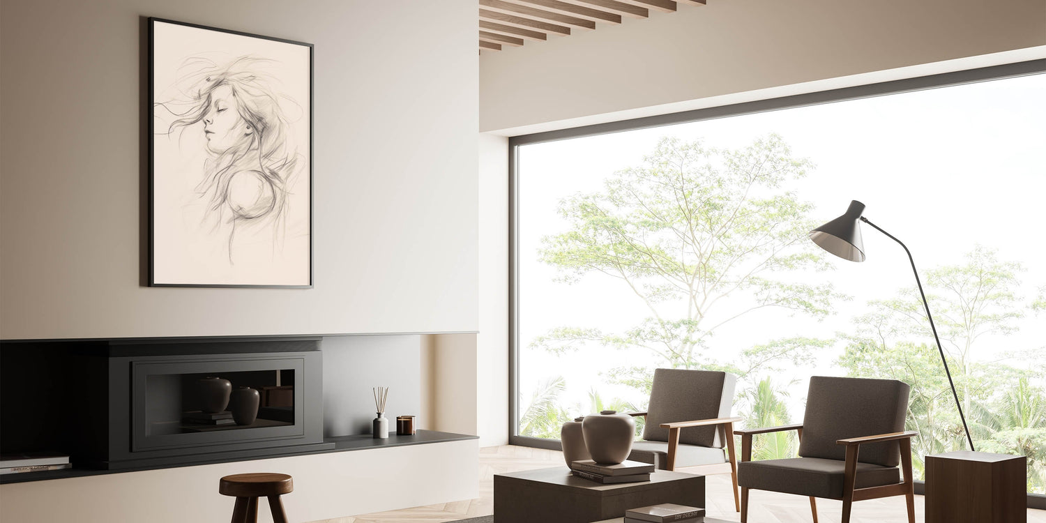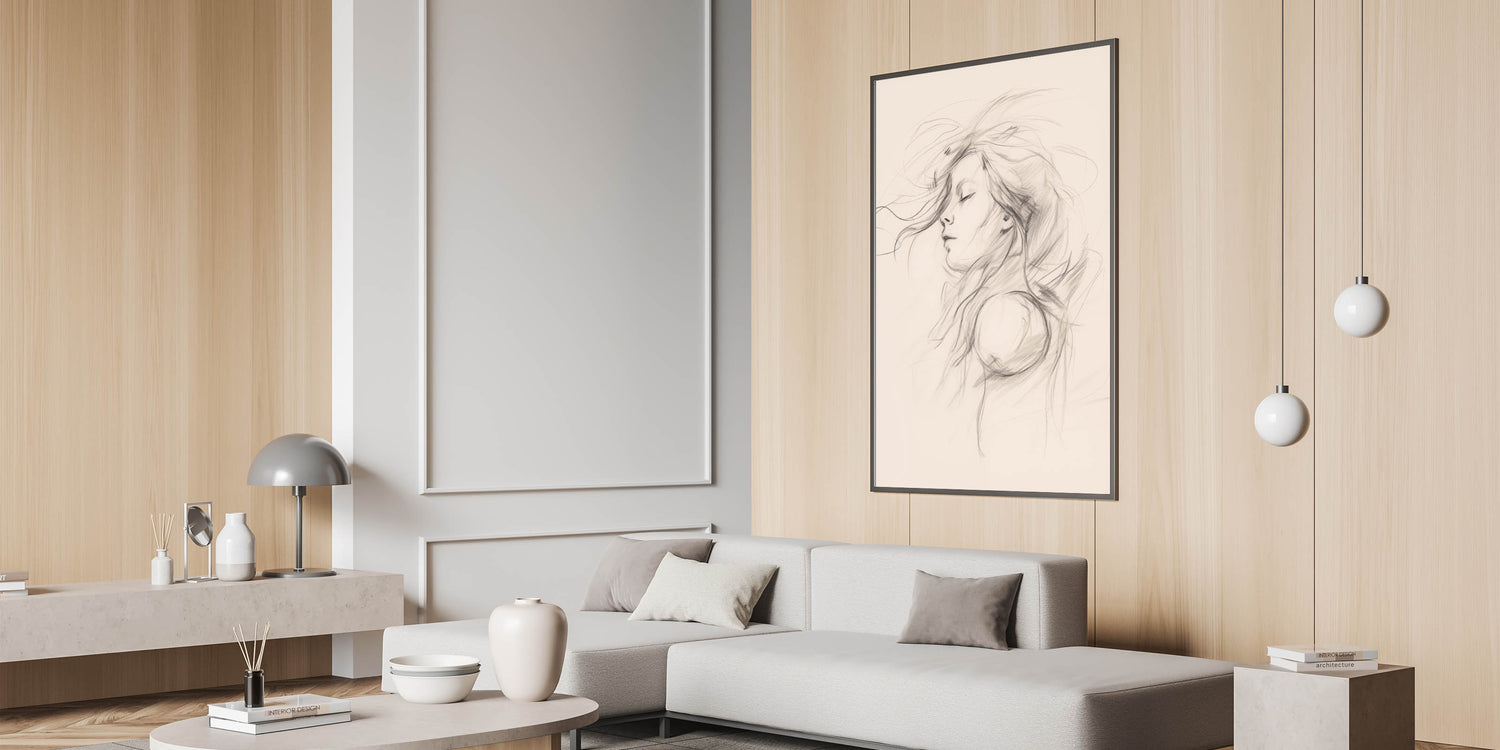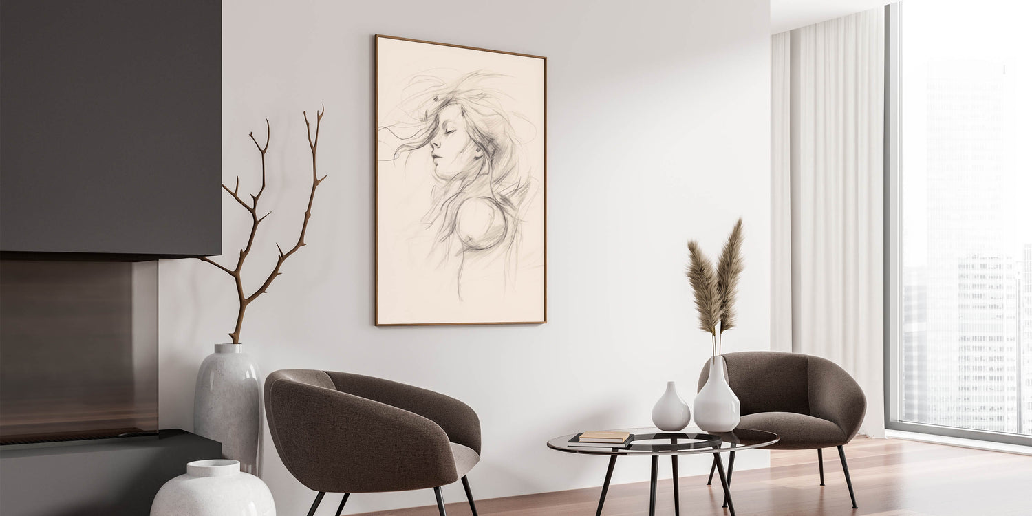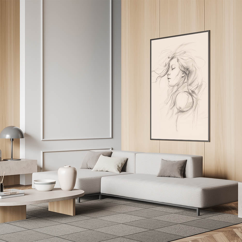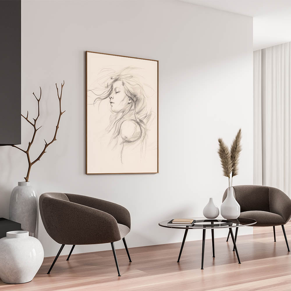 Enhance your space with this elegant piece of minimalist abstract art, featuring a delicate sketch of a woman's profile. The flowing lines and subtle shading create a serene and sophisticated look, perfect for adding a touch of refinement to any room.