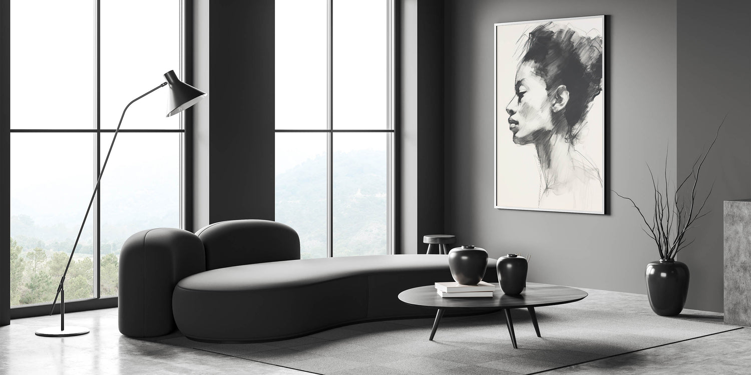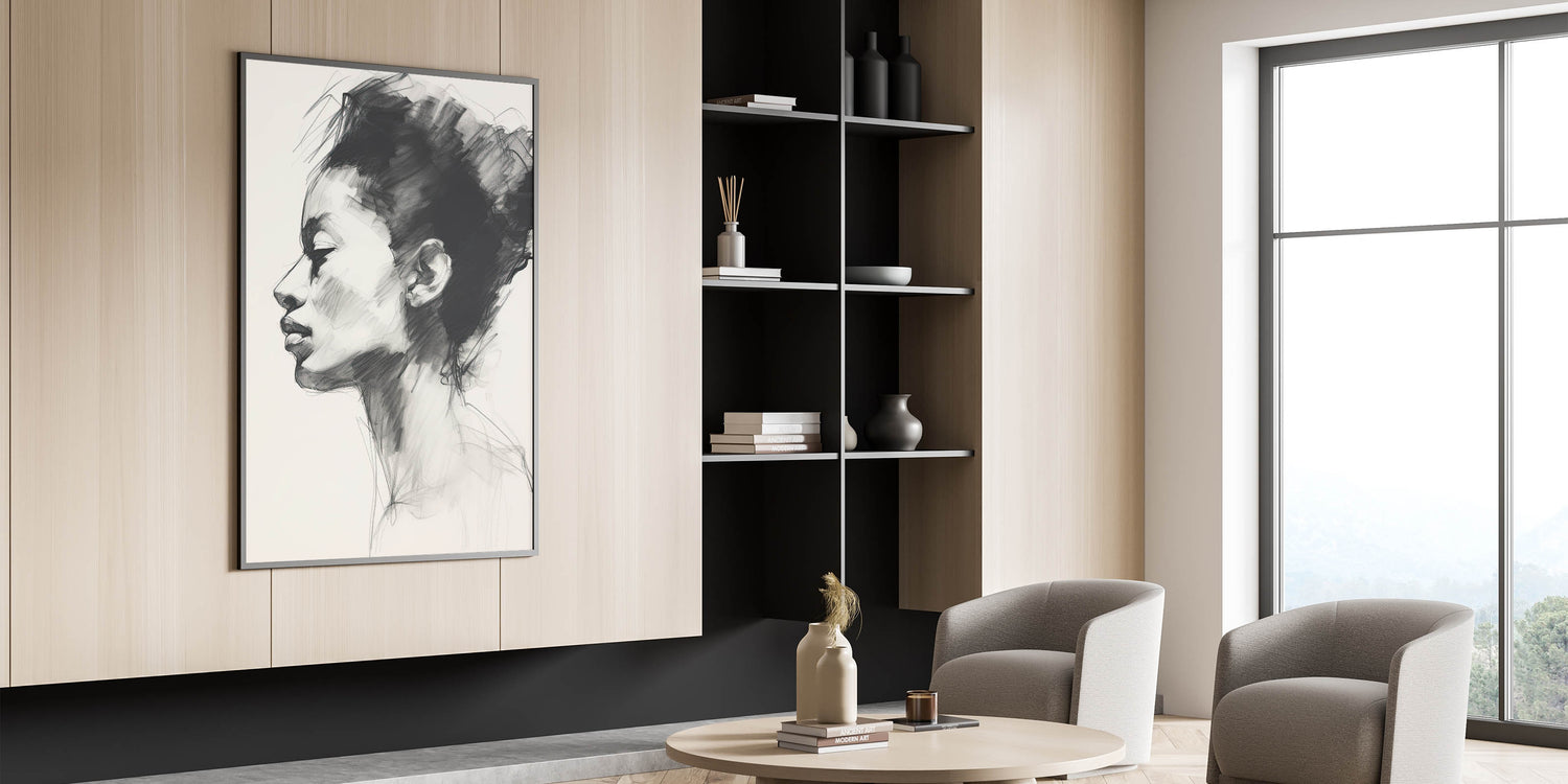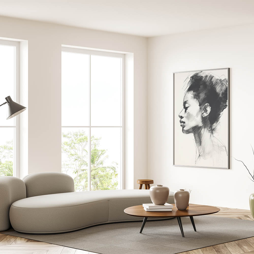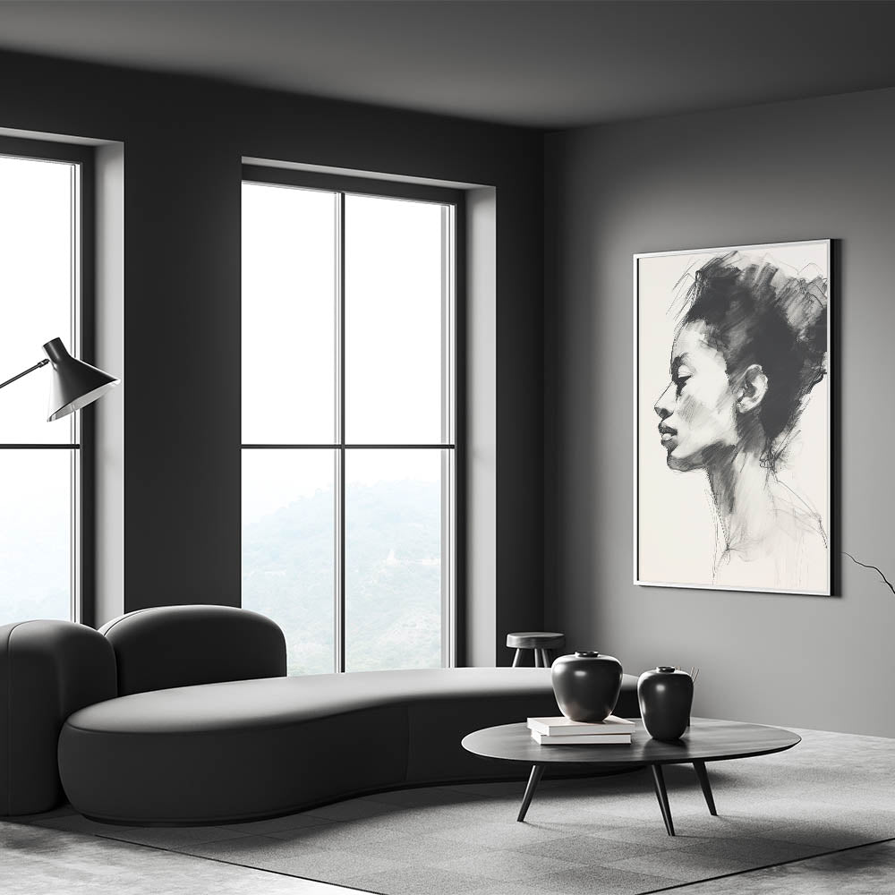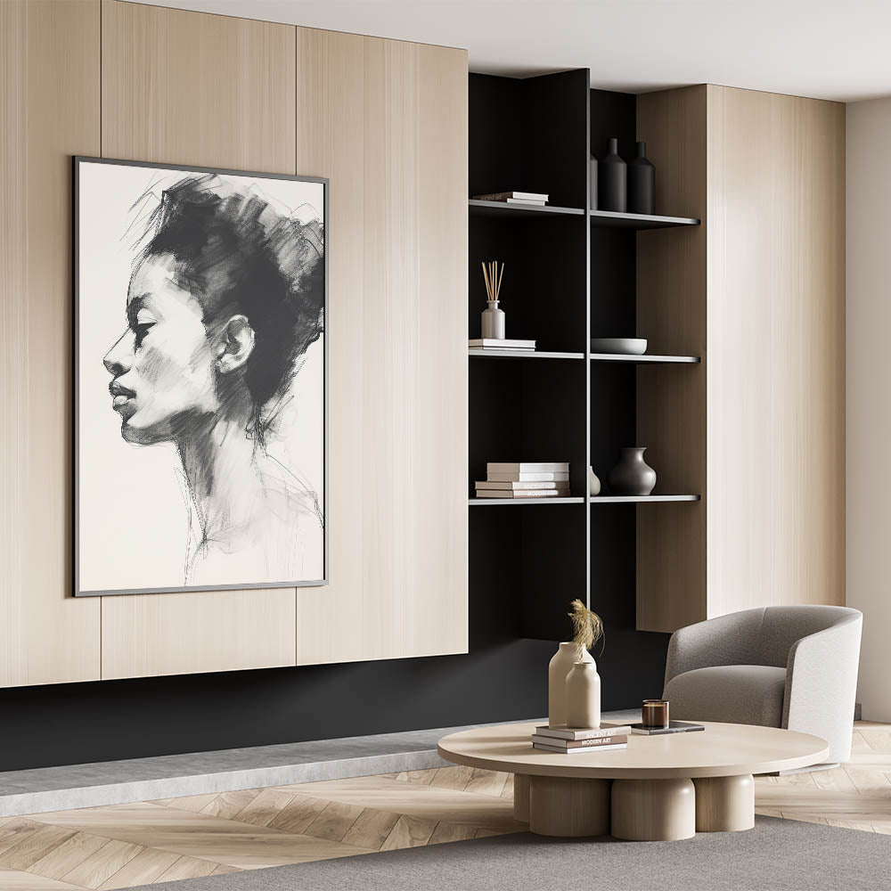 Add a touch of sophistication to your space with this minimalist charcoal portrait art. Capturing an elegant side profile, this sketch features soft, expressive lines and intricate shading, highlighting the subject’s serene expression. Perfect for modern and minimalist interiors, this artwork brings a timeless appeal through its refined black and white palette, making it an eye-catching focal point in any room.