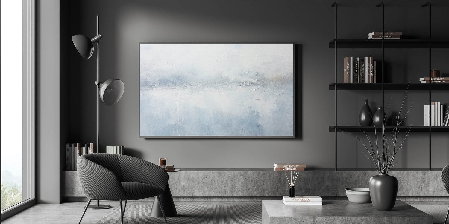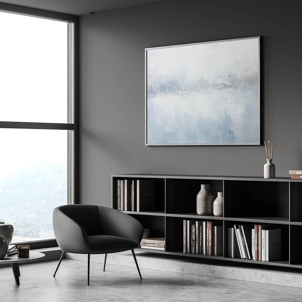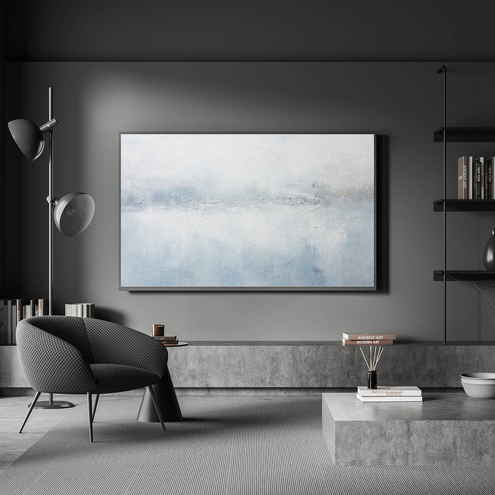 Immerse yourself in the serene beauty of this Minimalist Misty Abstract Line Art. The delicate blend of pale blue, white, and light gray creates a soothing, misty landscape, evoking the calm of a peaceful morning. The soft, textured strokes bring an airy, ethereal quality to the piece, making it a perfect addition for those who appreciate minimalist and tranquil decor.
