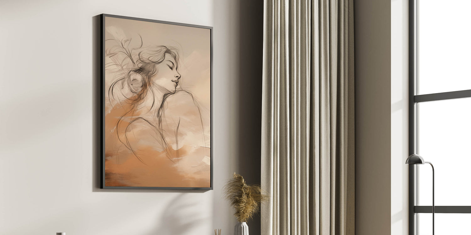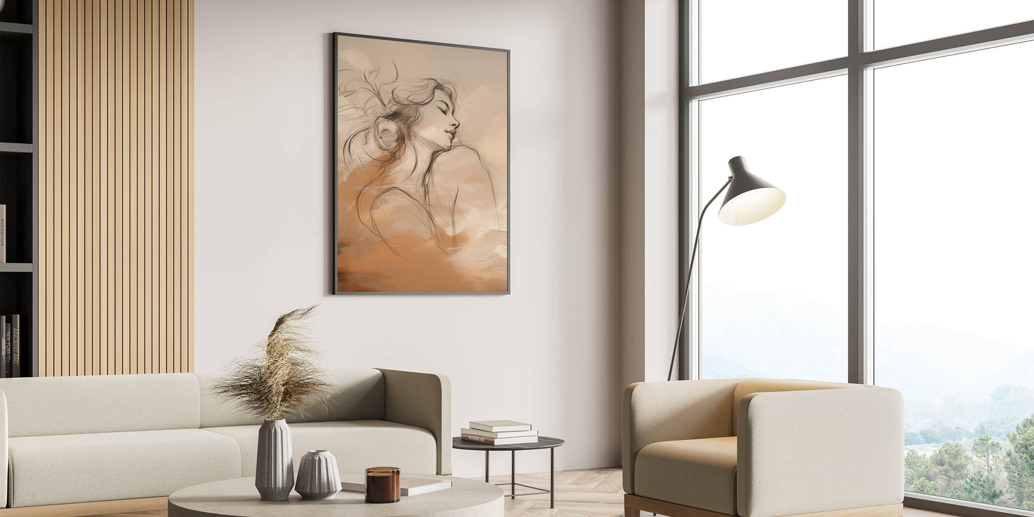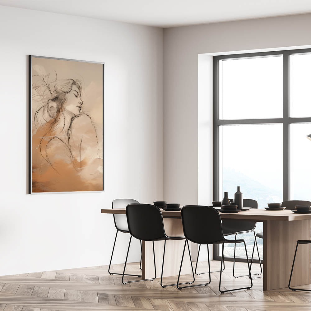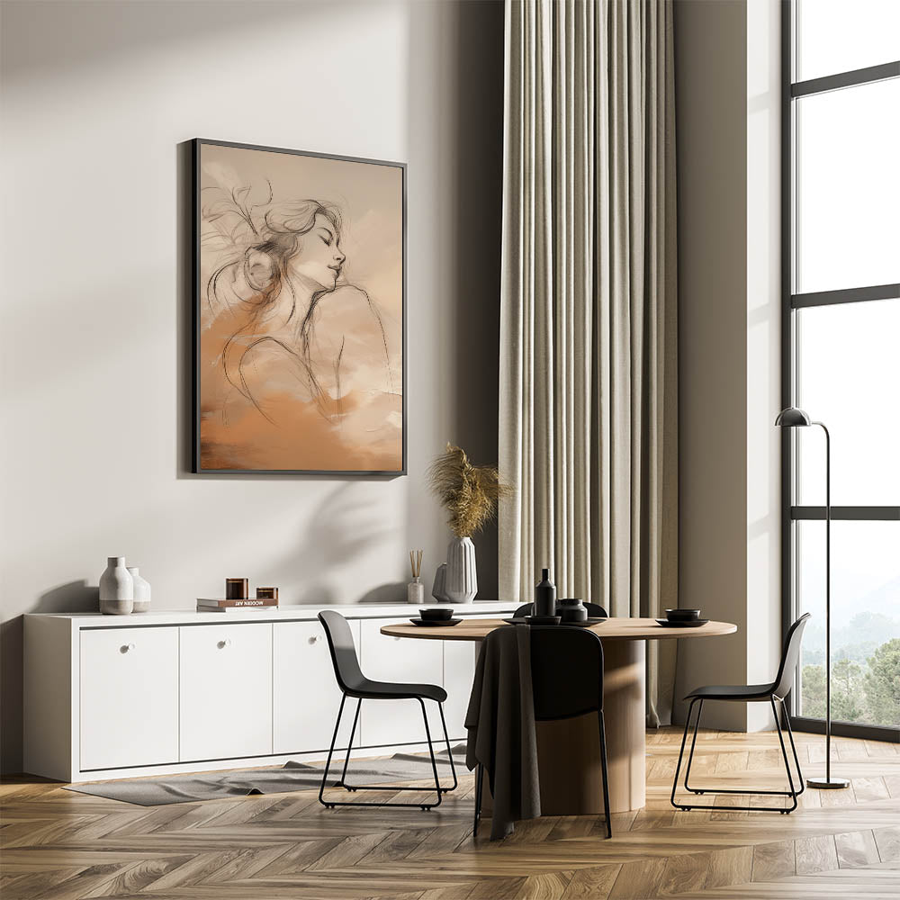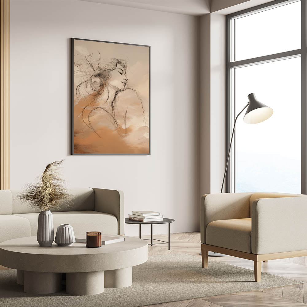 This elegant minimalist portrait art blends delicate line drawing with a warm palette of earthy tones. The serene female figure depicted in the artwork is gracefully intertwined with soft abstract forms, evoking a sense of peace and introspection. The neutral yet warm color scheme makes this piece an ideal addition to modern interiors, adding a sophisticated yet calming atmosphere to any space.