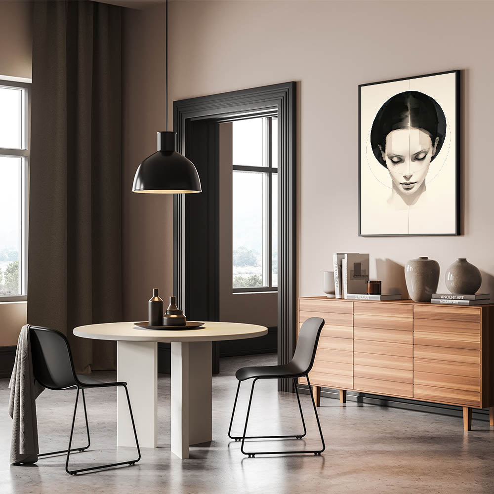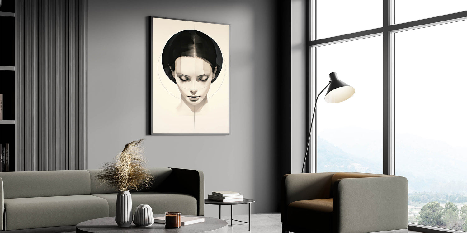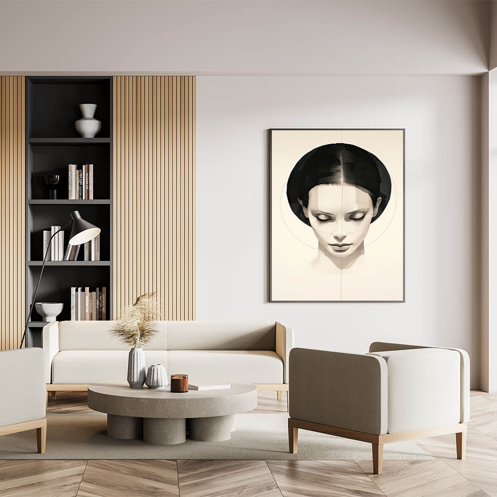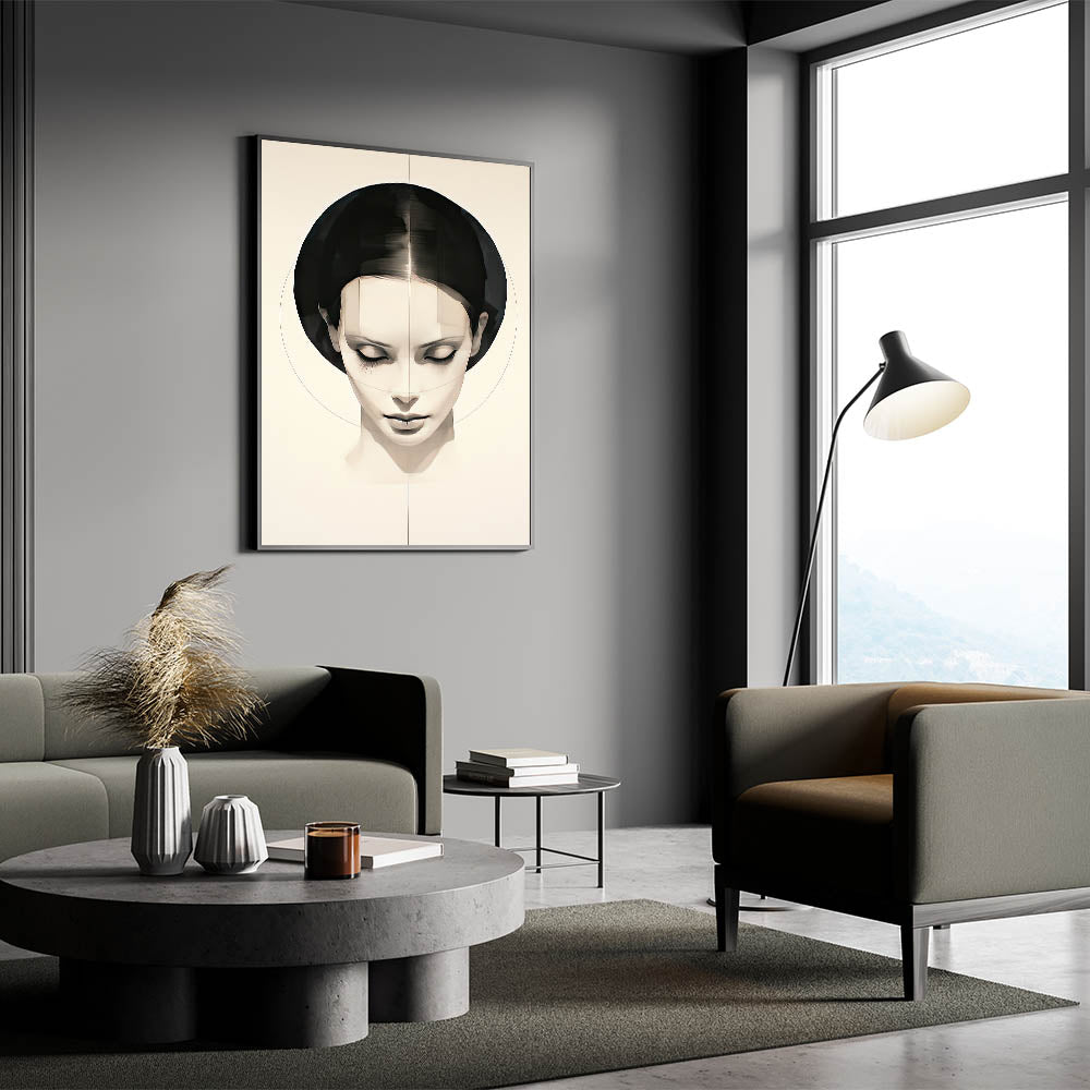 This striking minimalist portrait wall art features an elegant abstract depiction of a female silhouette, blending bold black and white tones with subtle geometric elements. The serene expression of the figure exudes a sense of calm and introspection, making this artwork perfect for contemporary spaces that value both simplicity and emotional depth. The clean lines and refined aesthetic of this piece make it a versatile choice for any modern interior.