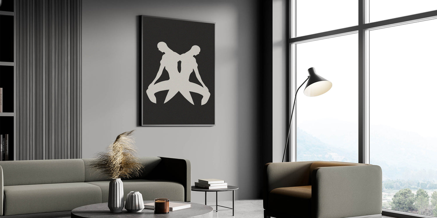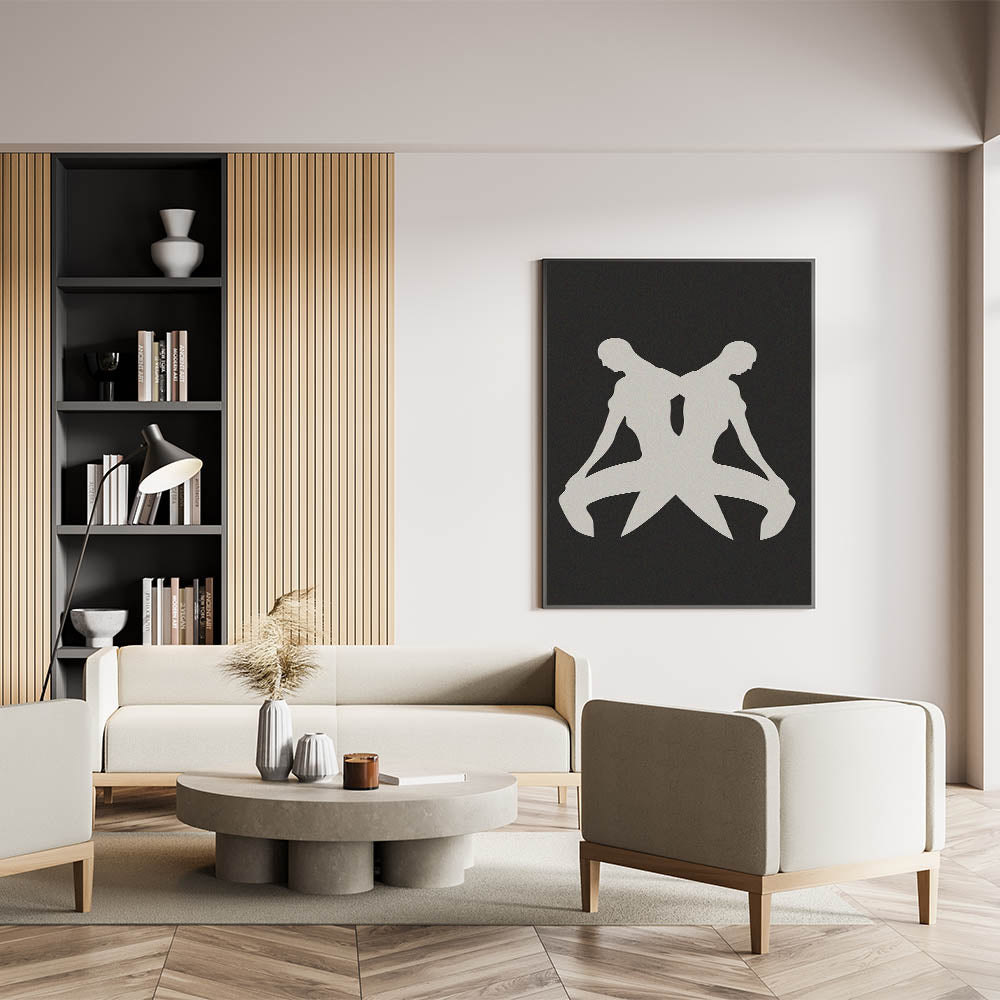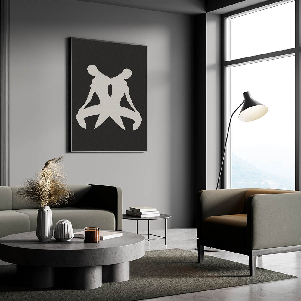 Add a dramatic and artistic touch to your space with this stunning minimalist silhouette art. Featuring two mirrored human figures in a bold black-and-white contrast, this abstract design conveys strength and symmetry. Its striking simplicity and modern aesthetic make it the perfect addition to any contemporary decor.