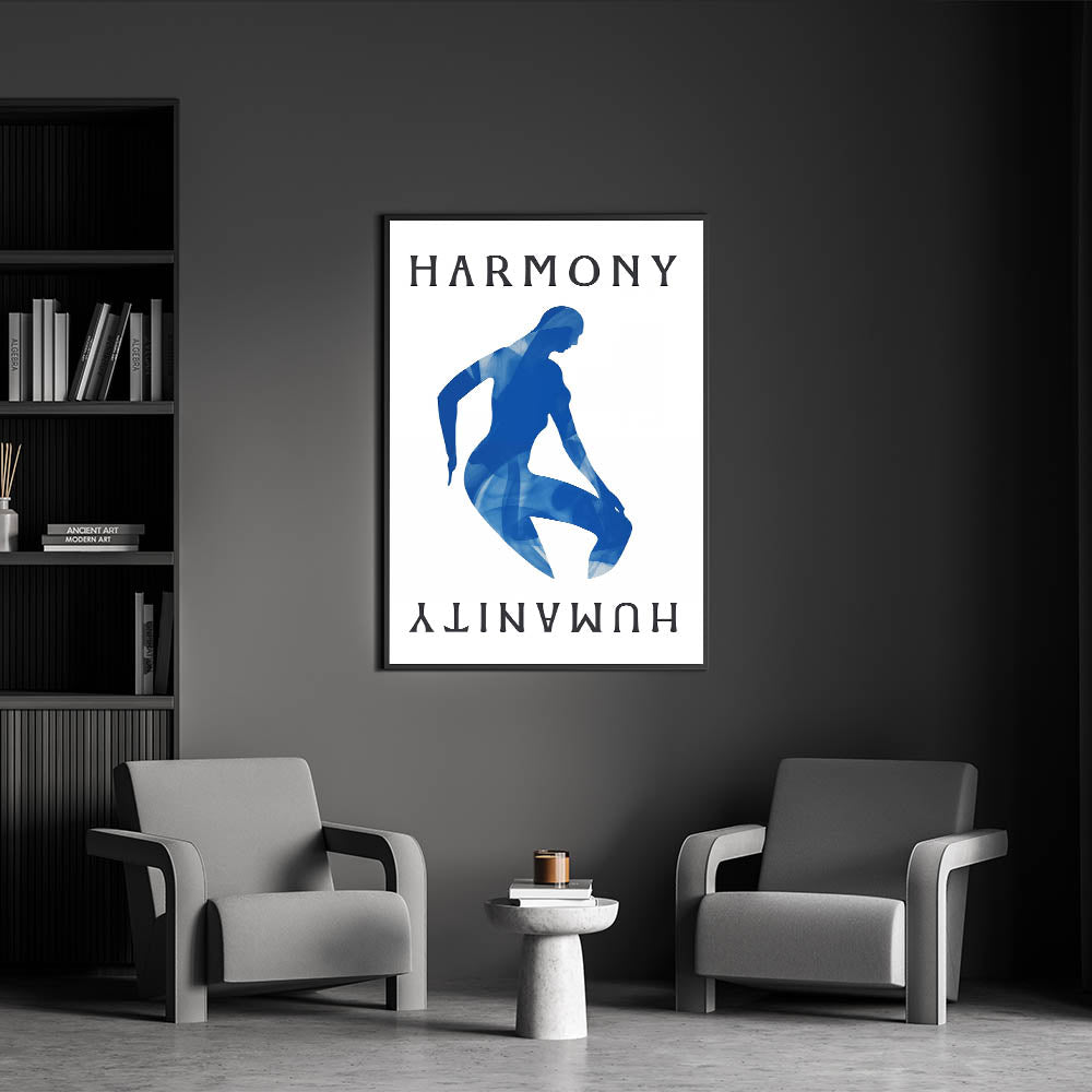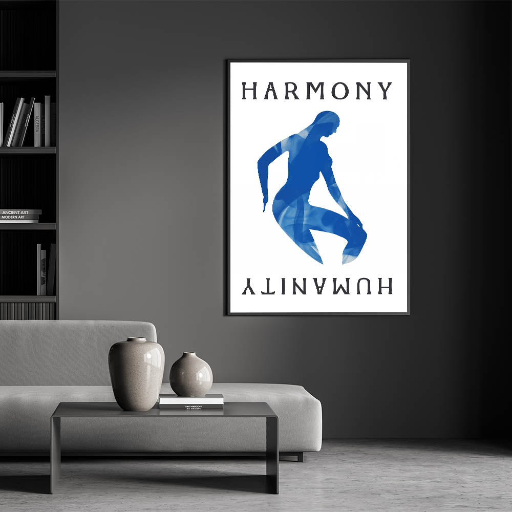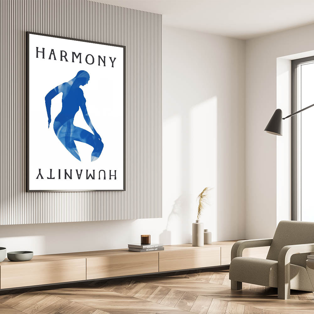 Celebrate the balance between humanity and harmony with this striking minimalist wall art. Featuring a bold blue silhouette accompanied by the words "Harmony" and "Humanity," this piece conveys a powerful message of connection and balance. The clean lines of the silhouette, combined with the crisp typography, make this artwork an ideal choice for modern interiors seeking both aesthetic appeal and meaning.
